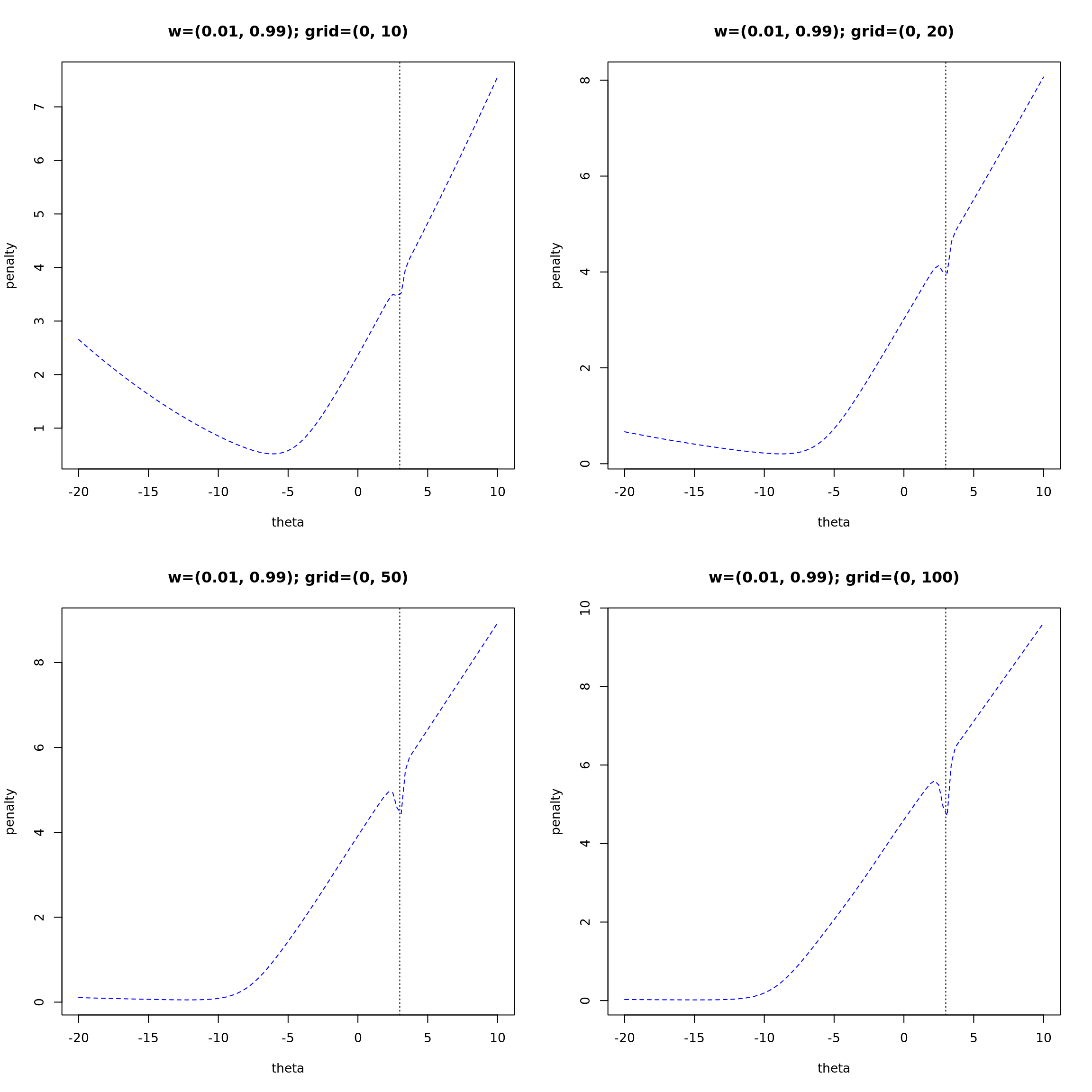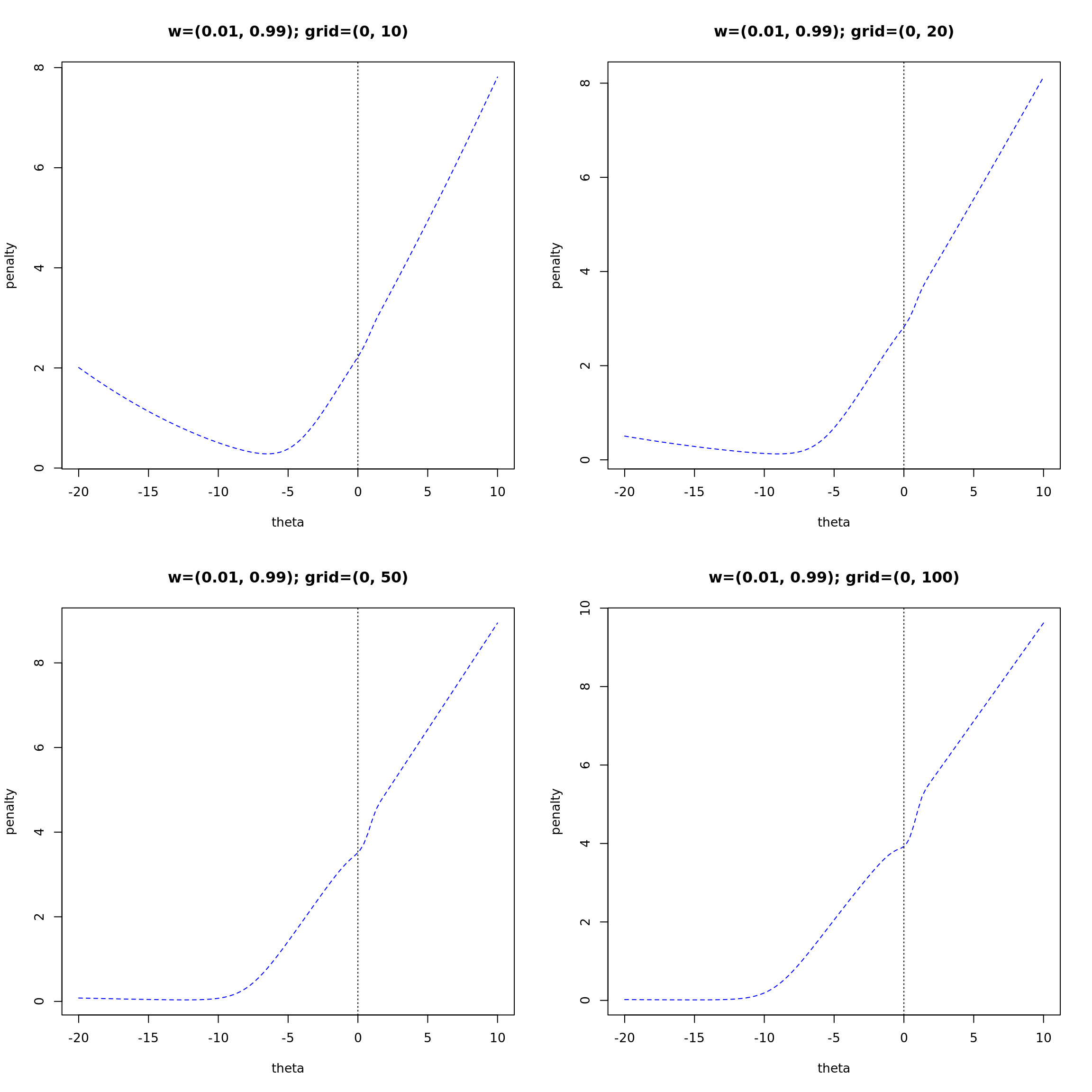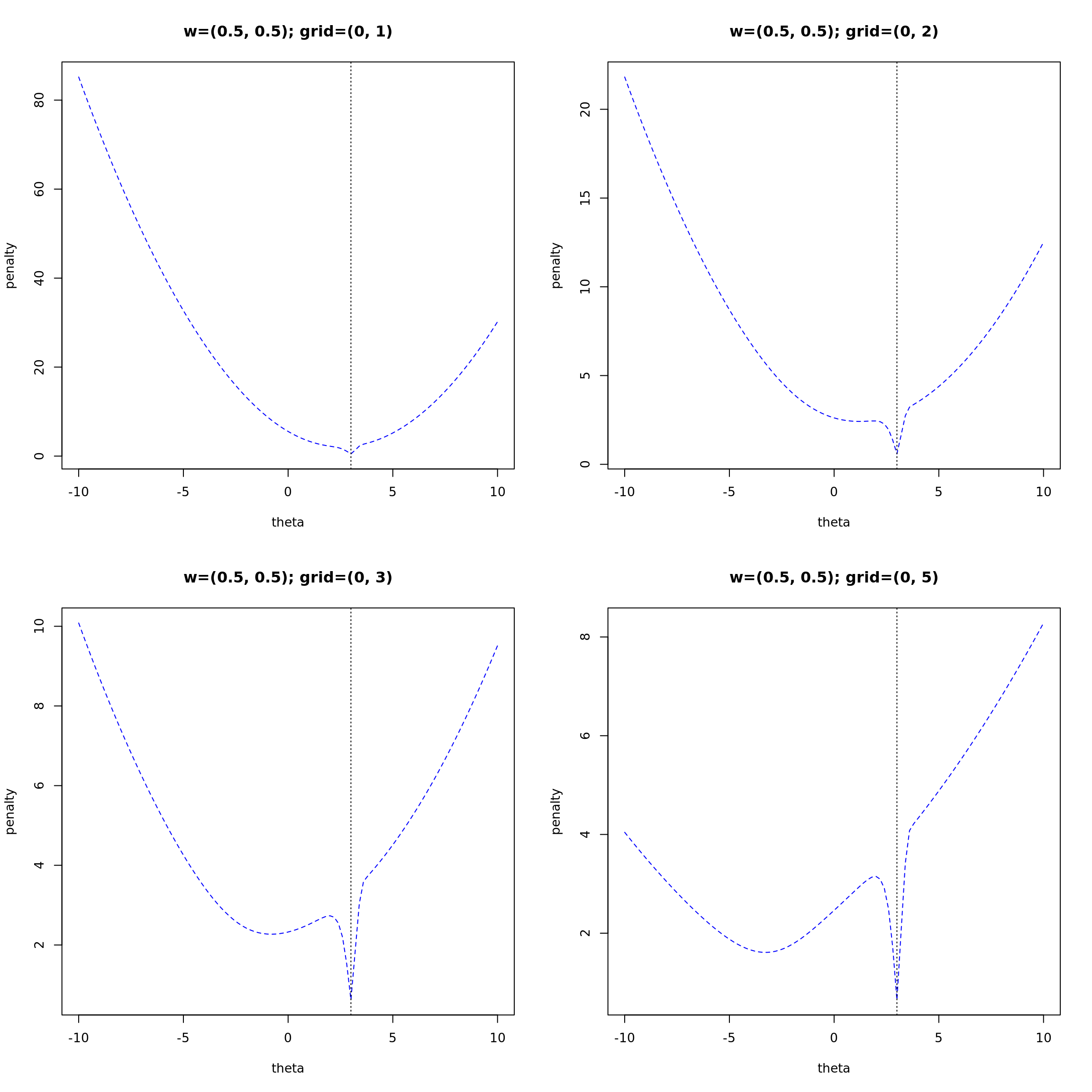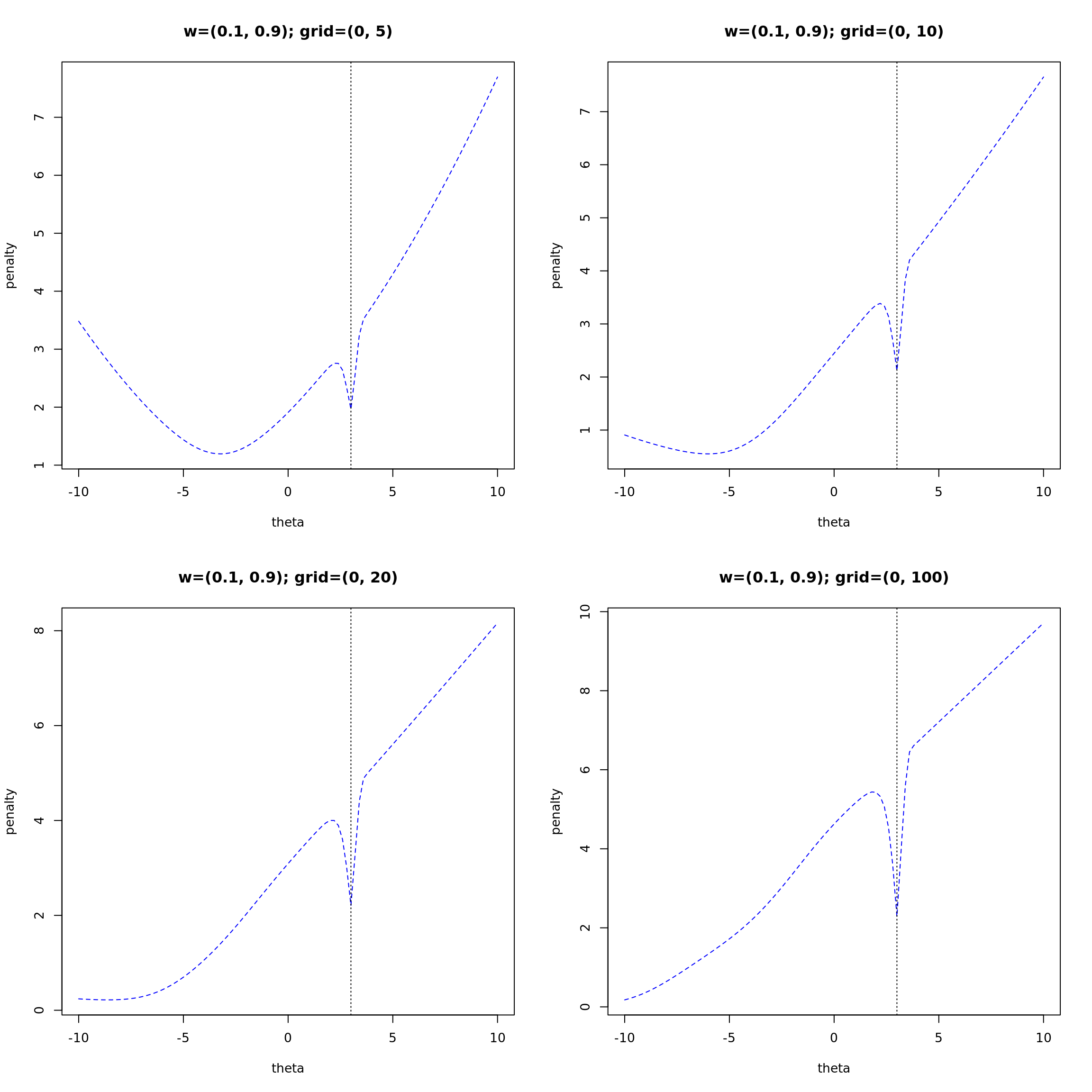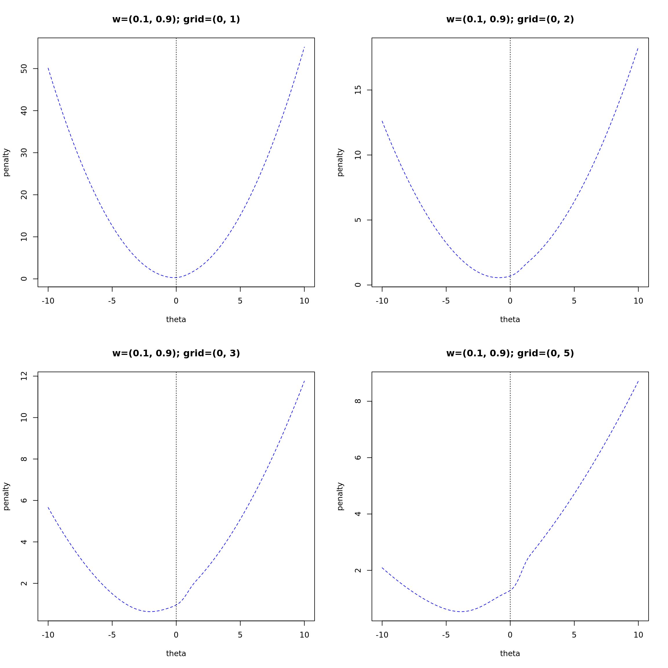 plot(x,pois_penalty(theta,w,mu,grid),col='blue',lty=2,type='l',xlab='theta',ylab='penalty',