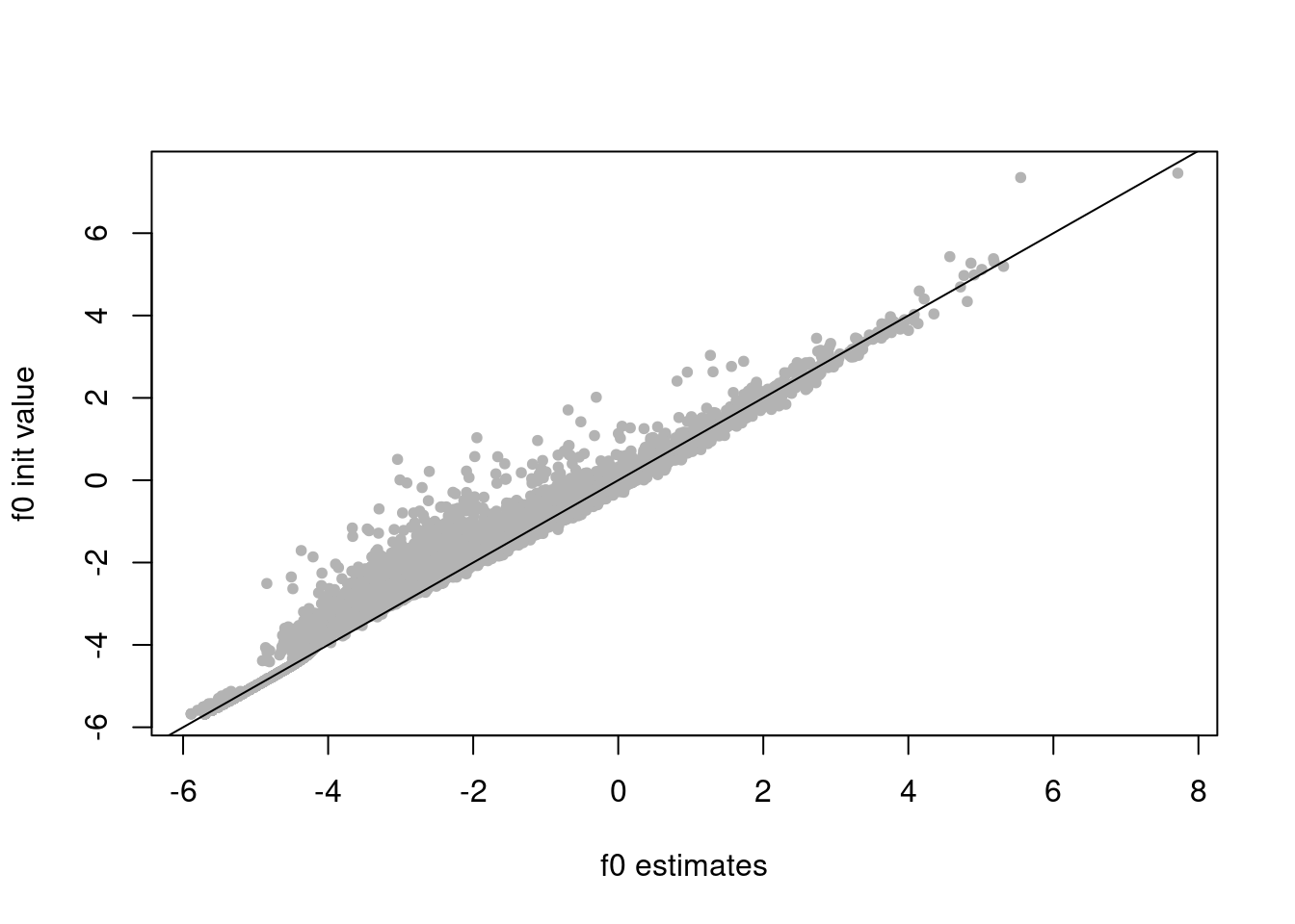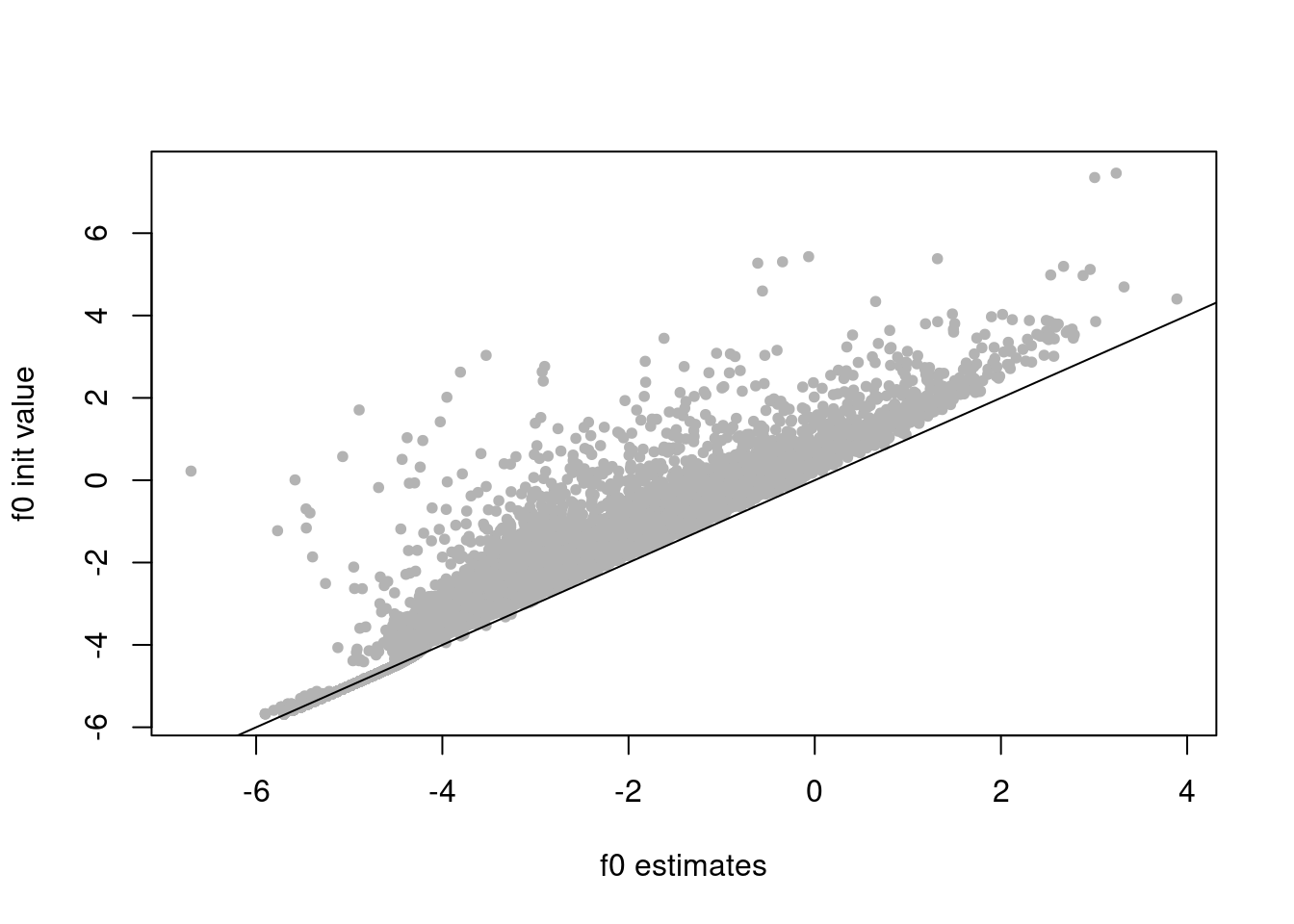 plot(res$fit_flash$F.pm[,2],f0_init,xlab='f0 estimates',ylab='f0 init value',pch=20,col='grey70')