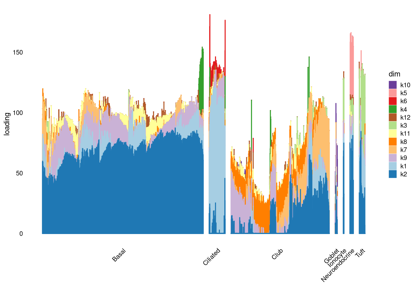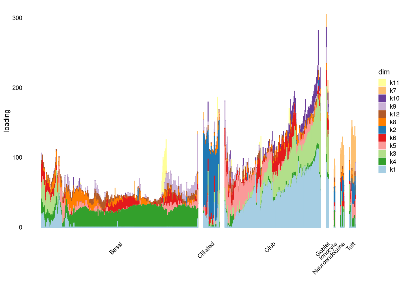 structure_plot_general(res$fit_flash$L.pm[,order(res$fit_flash$pve,decreasing = T)[1:14]],res$fit_flash$F.pm[,order(res$fit_flash$pve,decreasing = T)[1:14]],samples$tissue,LD=T)