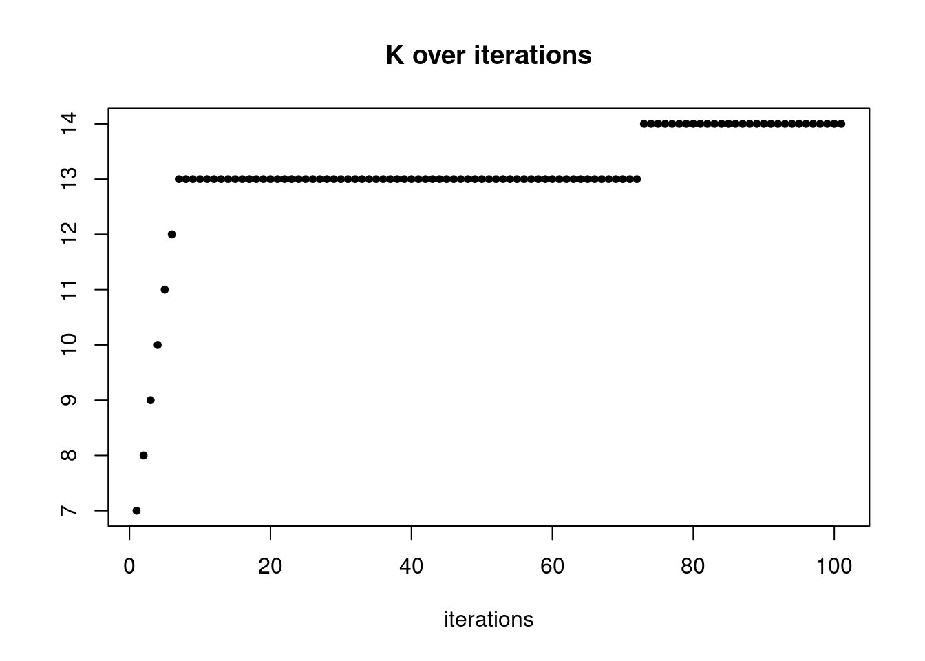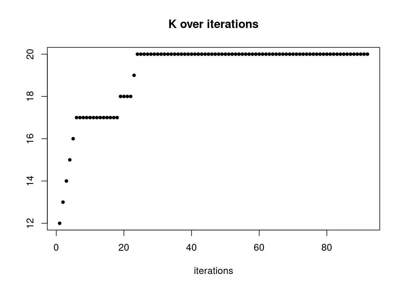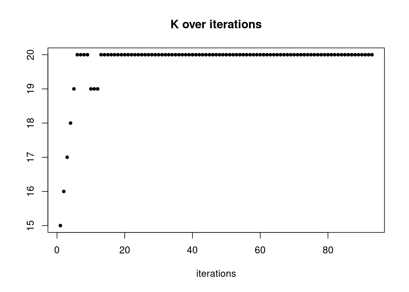 plot(res$K_trace,ylab='',xlab='iterations',main='K over iterations',pch=20)