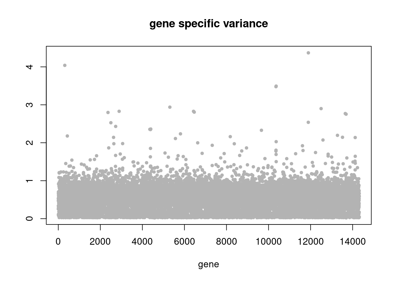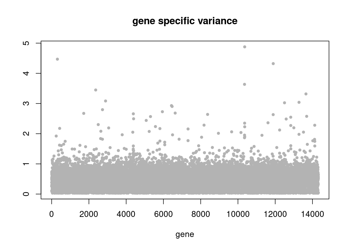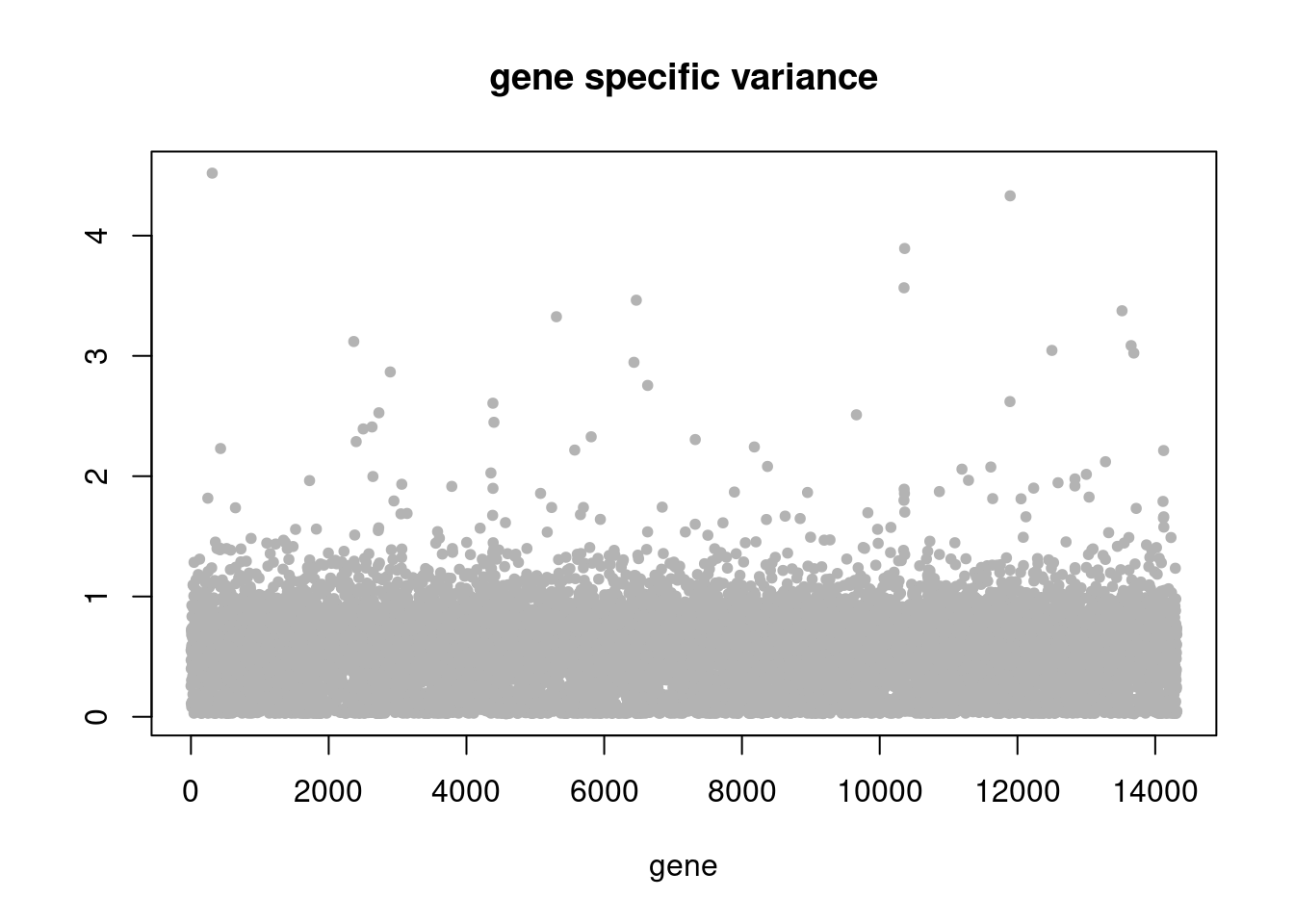 plot(res$sigma2,ylab='',xlab='gene',main = 'gene specific variance',pch=20,col='grey70')