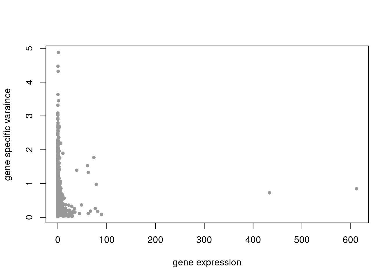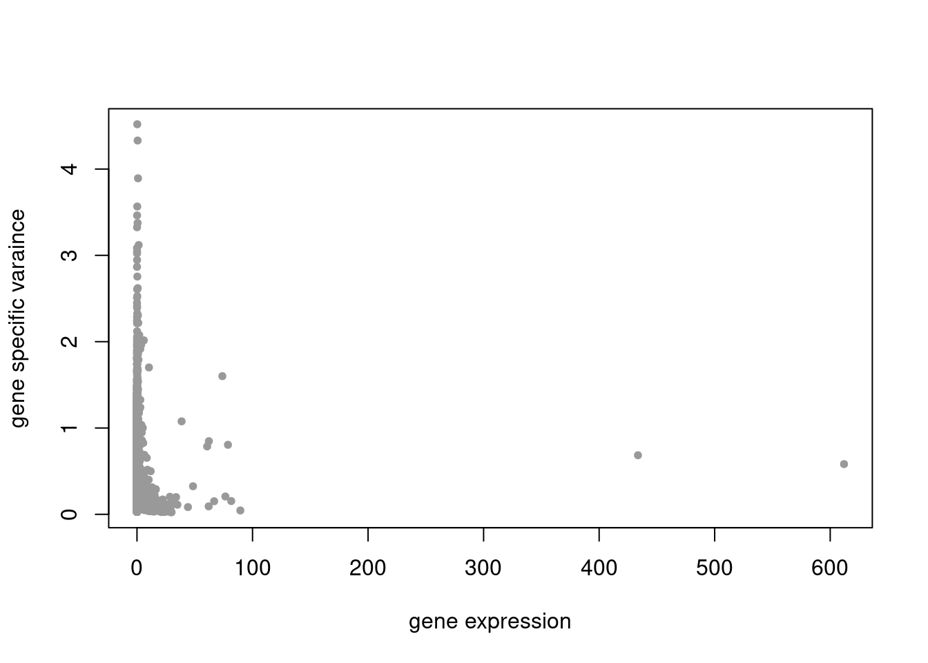 plot(colSums(counts/rowSums(counts)),res$sigma2,xlab='gene expression',ylab='gene specific varaince',pch=20,col='grey60')