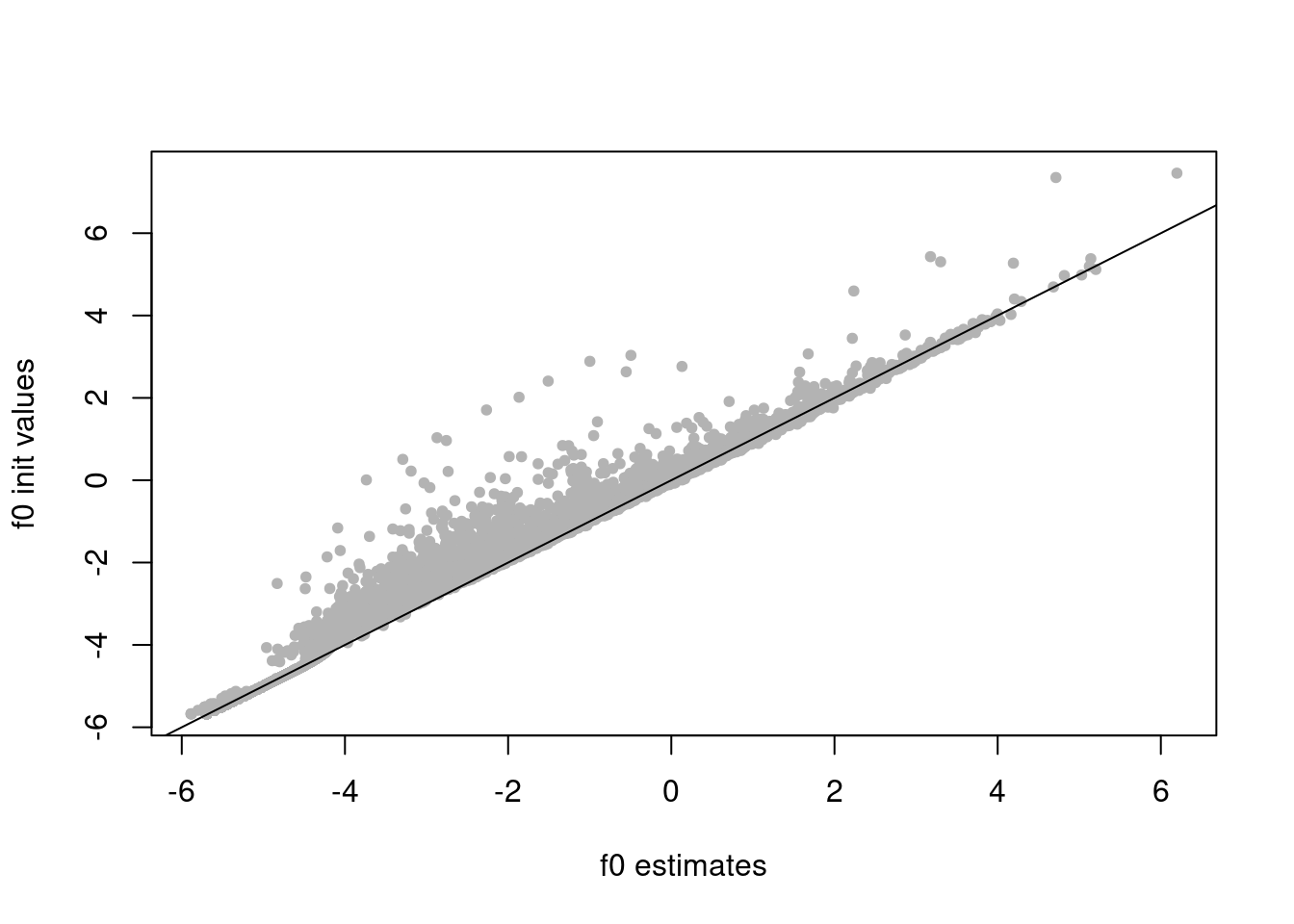 plot(res$fit_flash$F.pm[,2],f0_init,xlab='f0 estimates',ylab='f0 init values',pch=20,col='grey70')