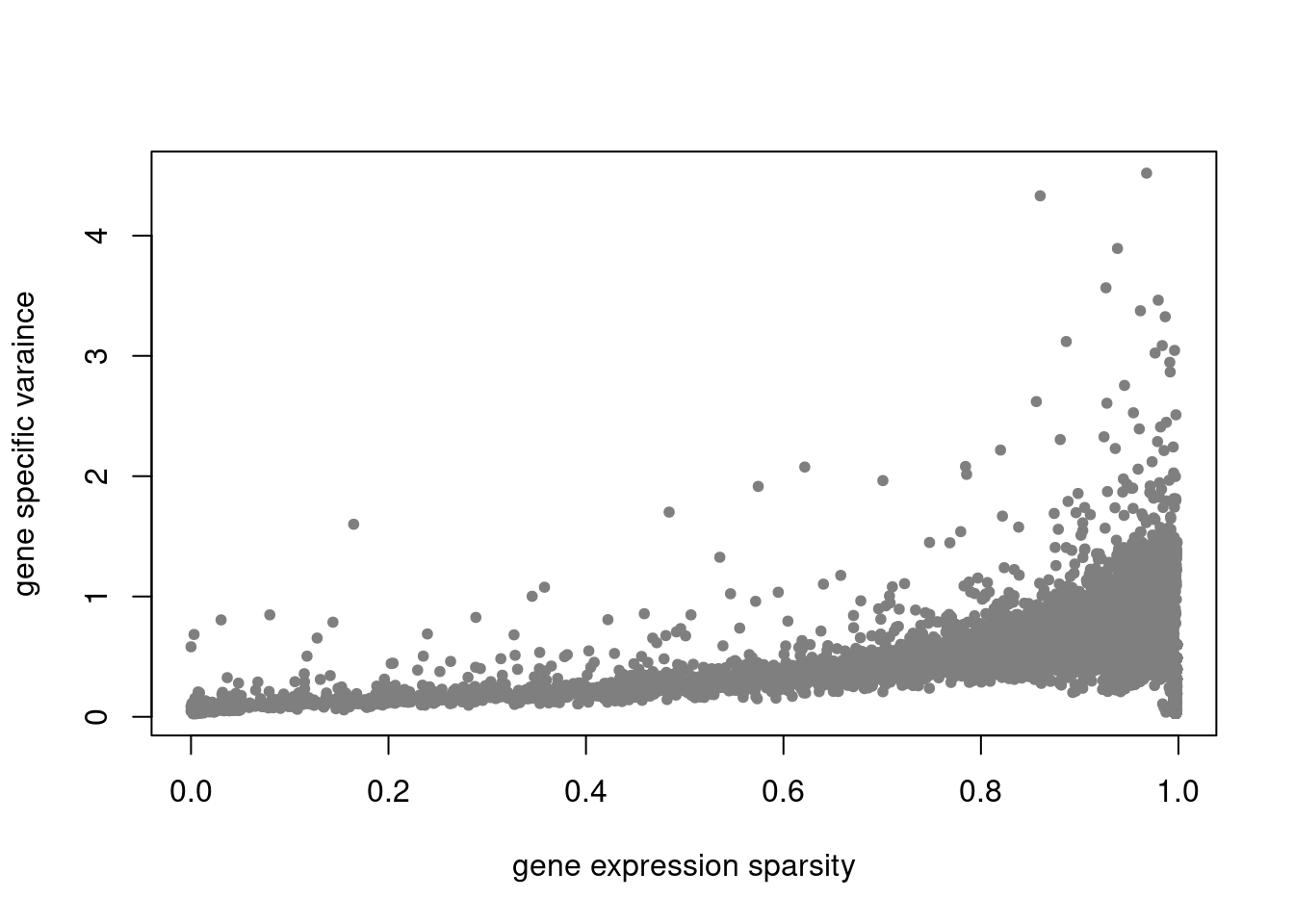 plot(colSums(counts==0)/nrow(counts),res$sigma2,xlab='gene expression sparsity',ylab='gene specific varaince',pch = 20, col='grey50')