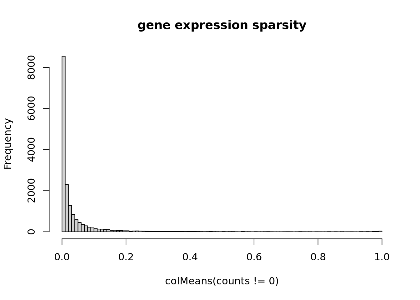 hist(colMeans(counts!=0),breaks = 100,main='gene expression sparsity')
