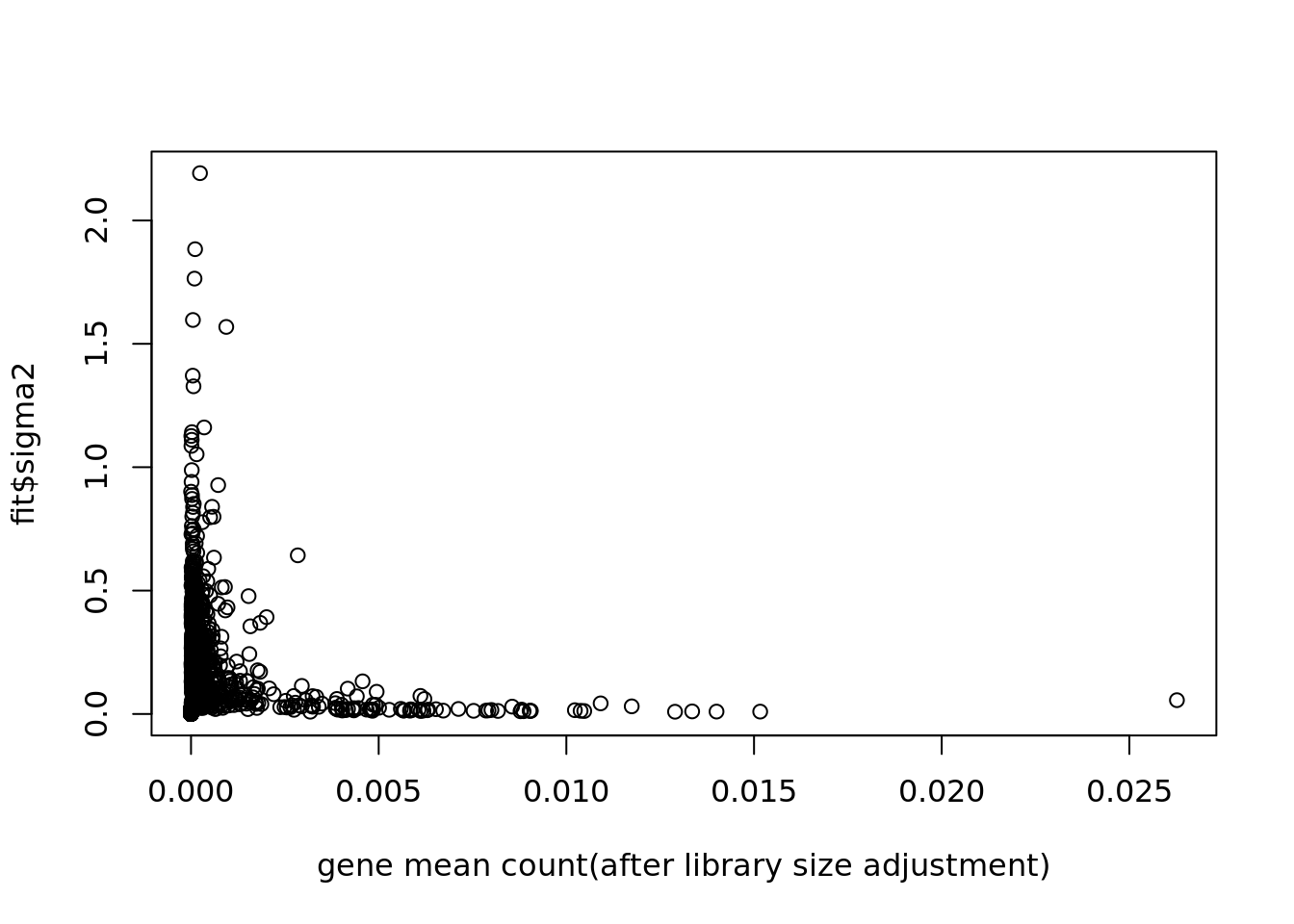plot(colSums(counts/c(rowSums(counts)))/dim(counts)[1],fit$sigma2,xlab='gene mean count(after library size adjustment)')