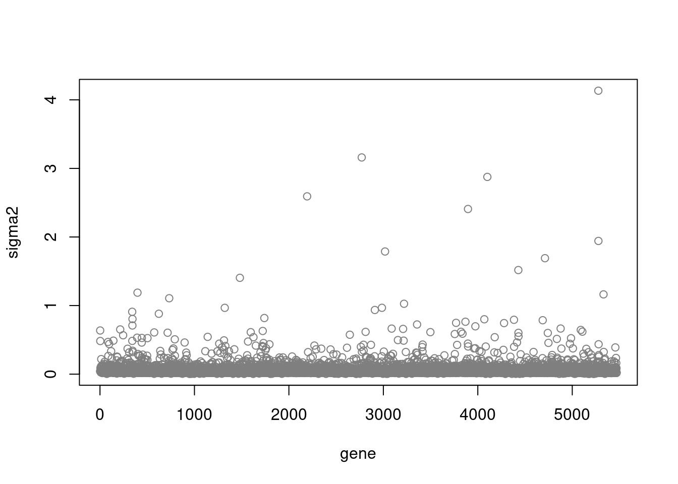 plot(fit$sigma2,ylab = 'sigma2',xlab='gene',col='grey50')