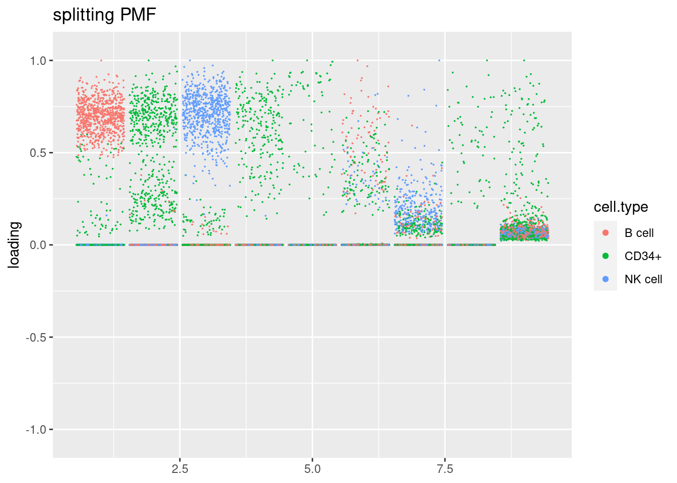 plot.factors(fit$fit_flash,cell_names,title='splitting PMF')