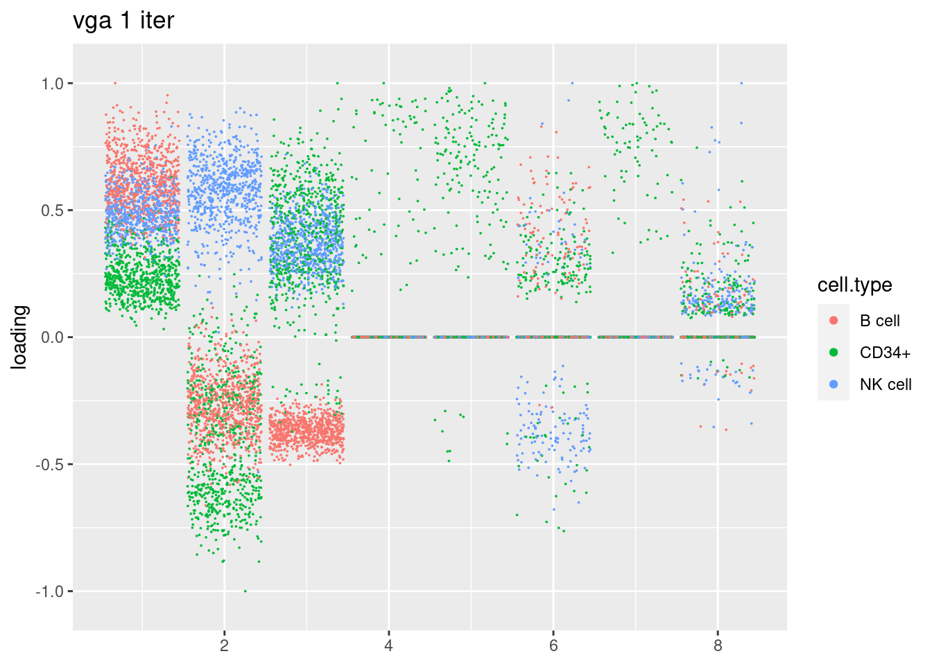 plot.factors(res1$fit$fit_flash,cell_names,title='vga 1 iter')