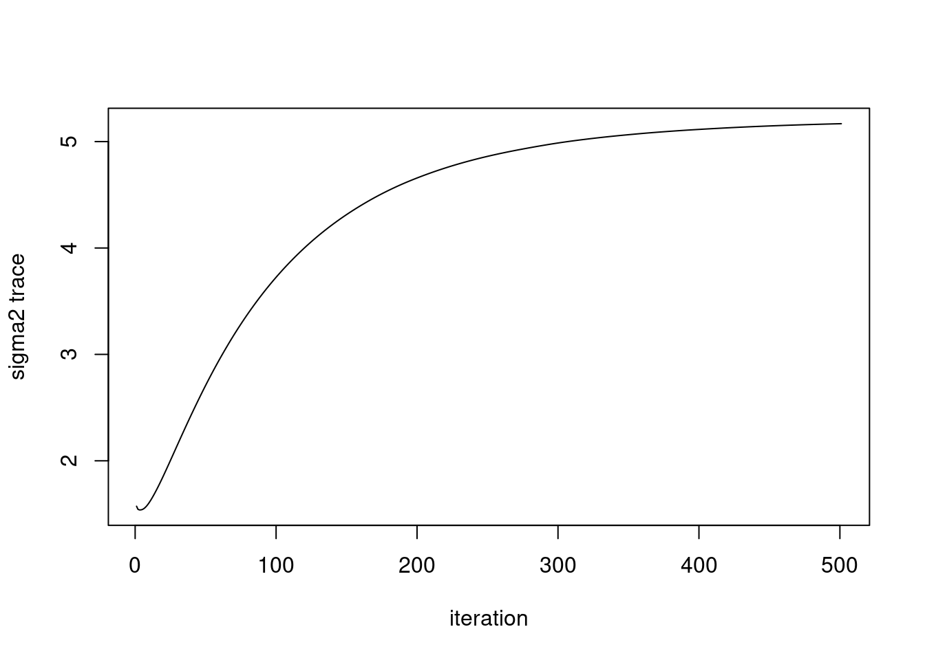 plot(ebpmf_pbmc3k_multinom$sigma2_trace[,gene_idx],type='l',xlab='iteration',ylab='sigma2 trace')