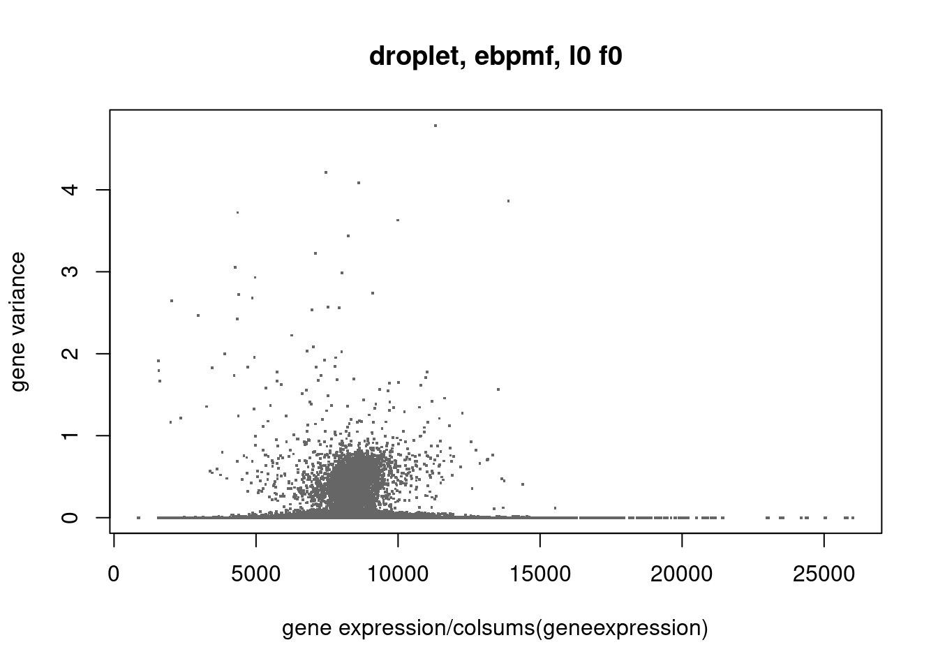 plot(colSums(counts/rowSums(counts))/f0*sum(counts),ebpmf_droplet$sigma2,xlab='gene expression/colsums(geneexpression)',ylab='gene variance',main='droplet, ebpmf, l0 f0',pch='.',cex=2,col='grey40')
