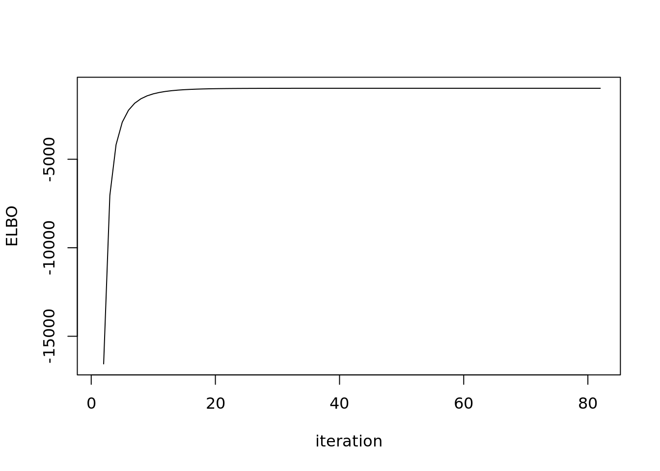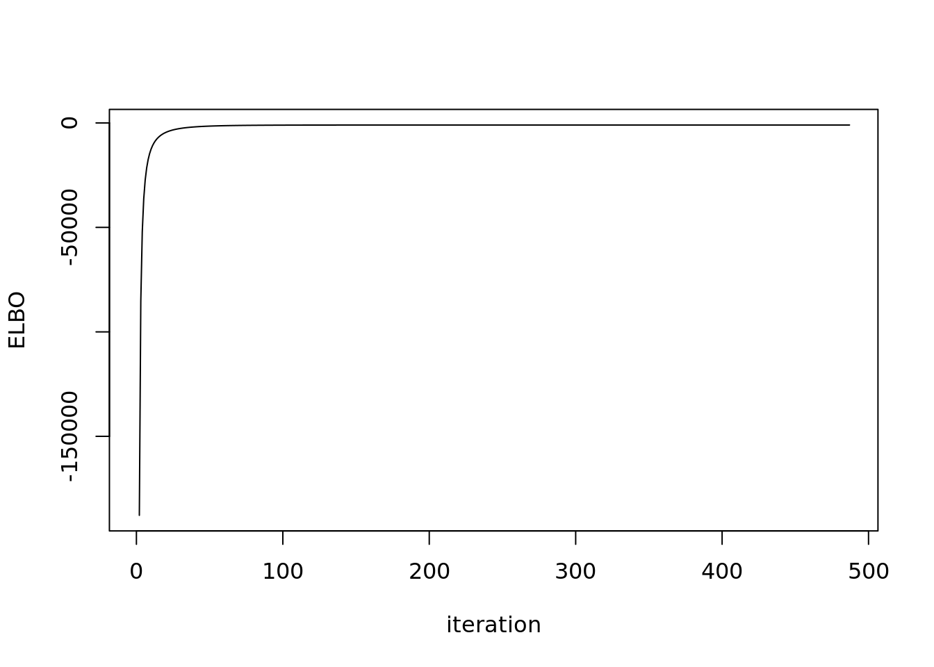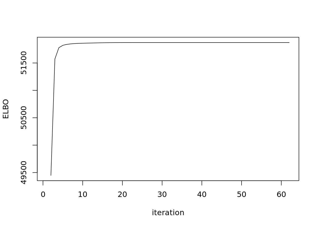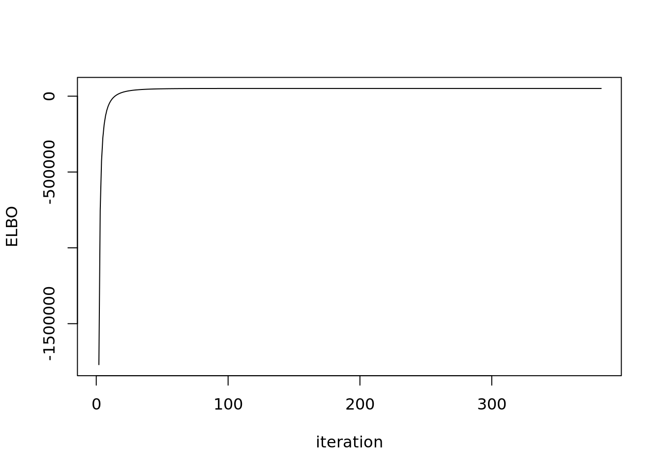 plot(out$obj,type='l',ylab='ELBO',xlab='iteration')
