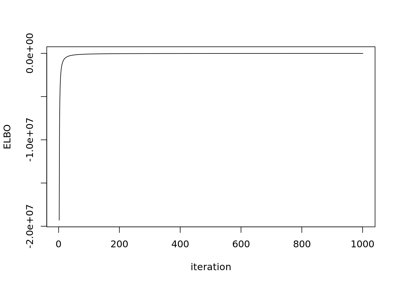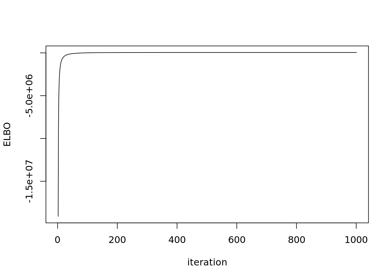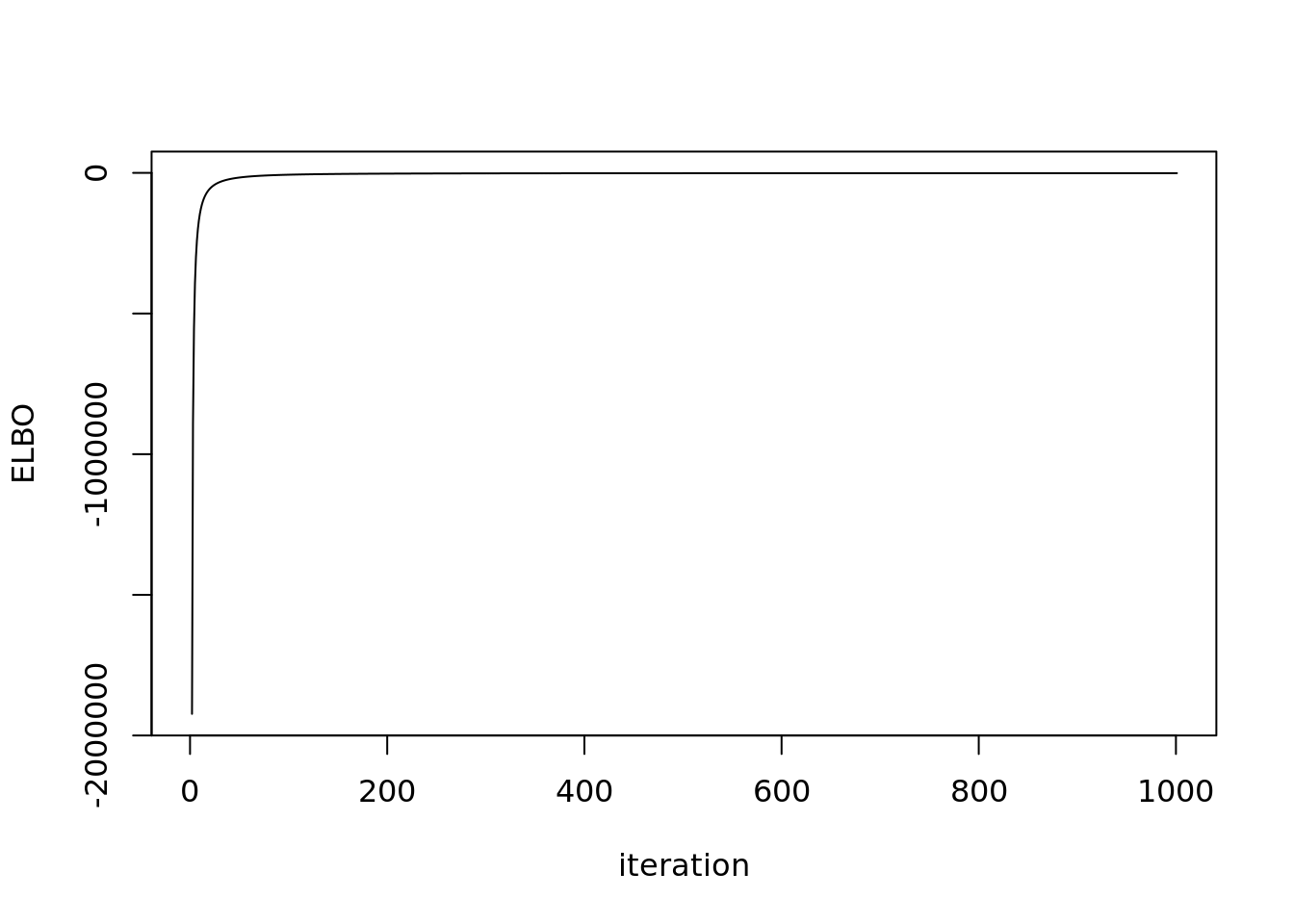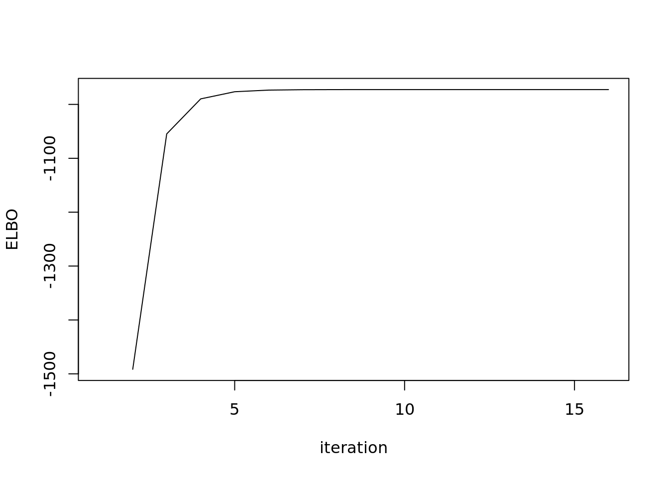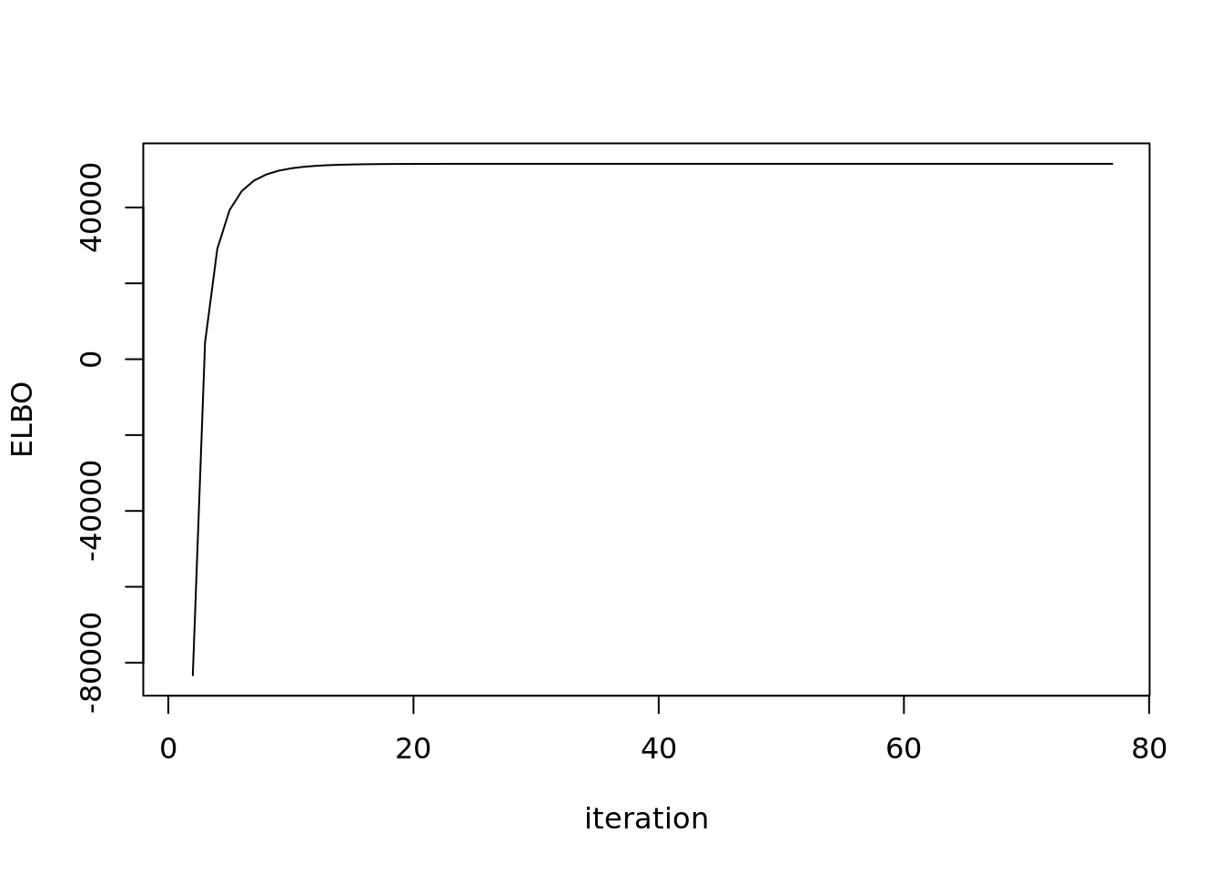 plot(out$obj,type='l',ylab='ELBO',xlab='iteration')