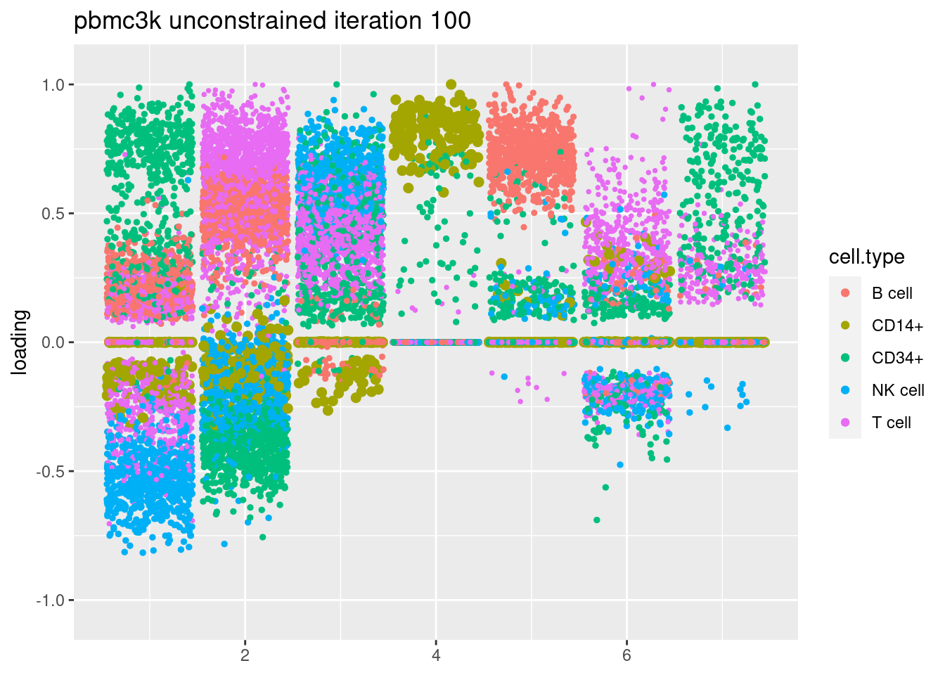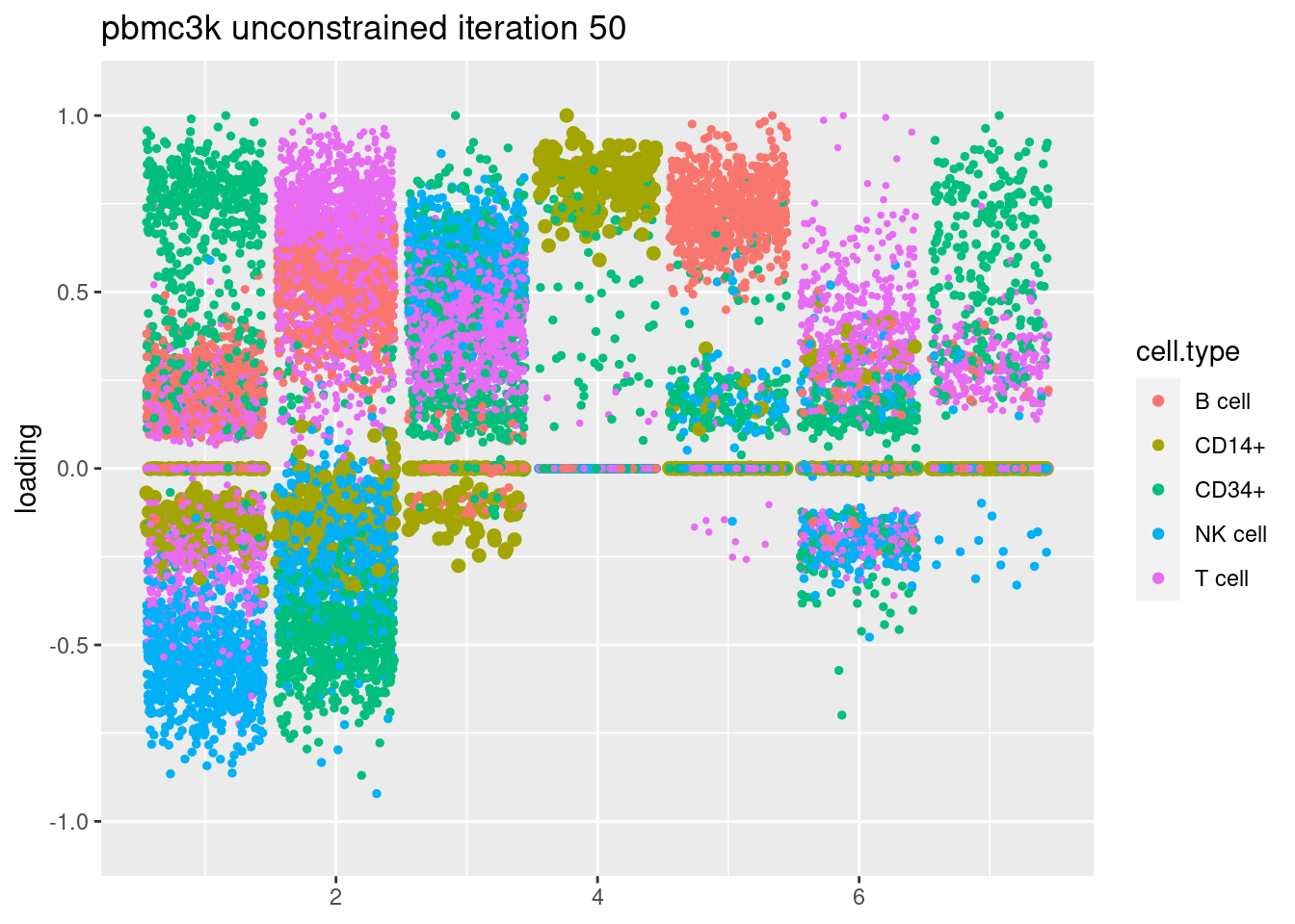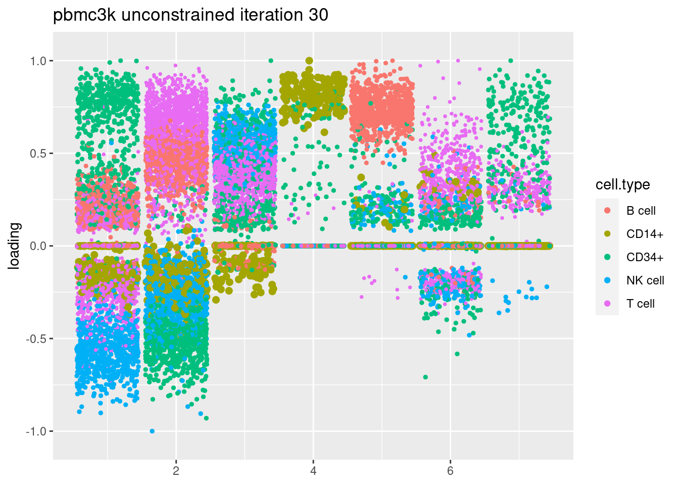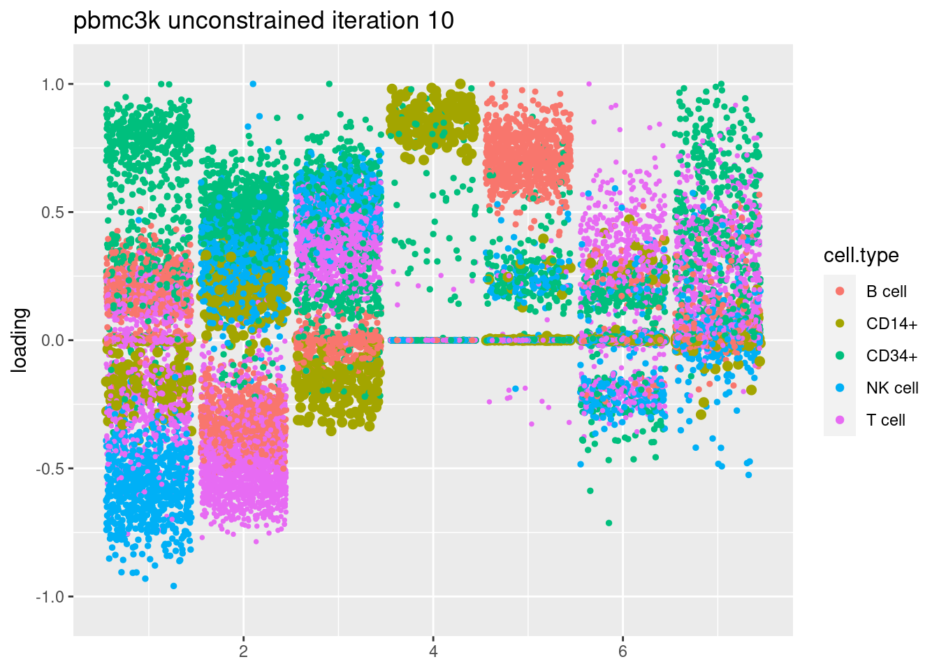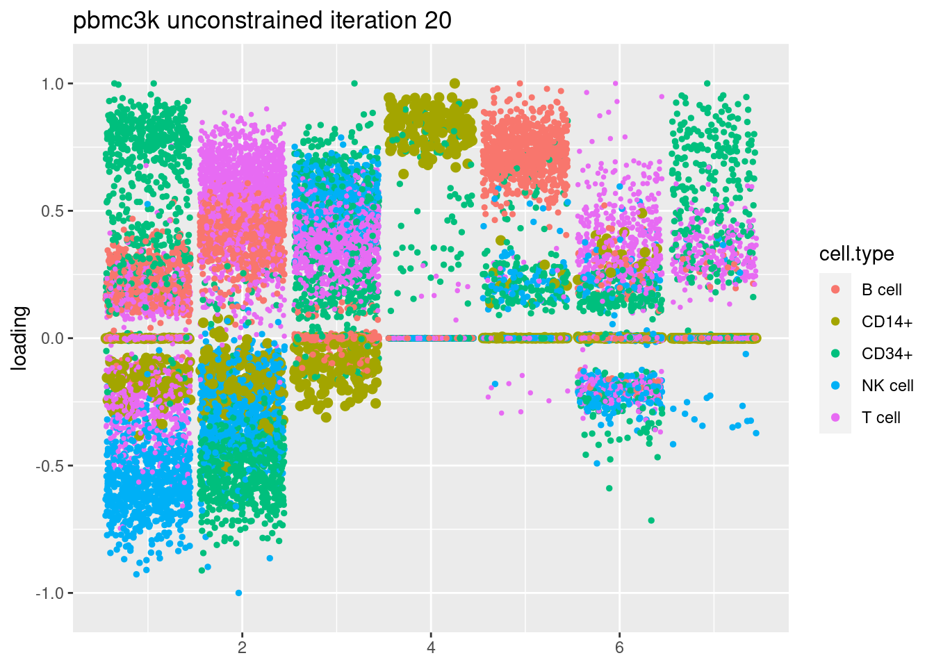 plt = plot.factors.general(fit$fit_flash$L.pm,pbmc_facs$samples$subpop,title=paste('pbmc3k unconstrained iteration',i))