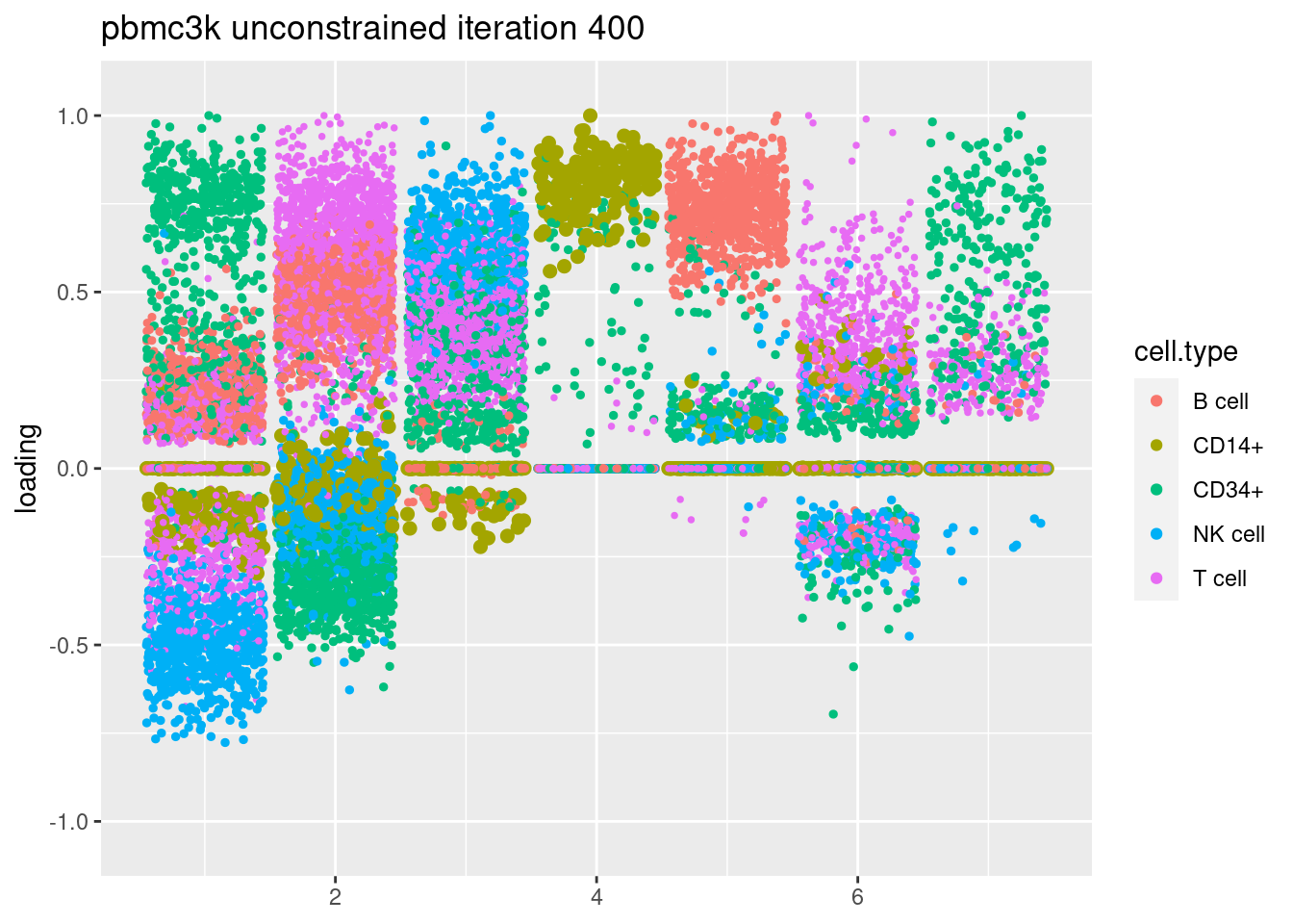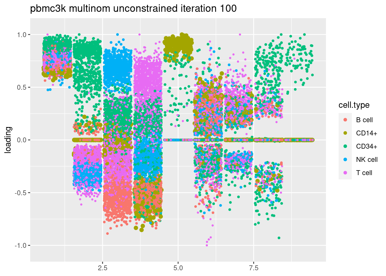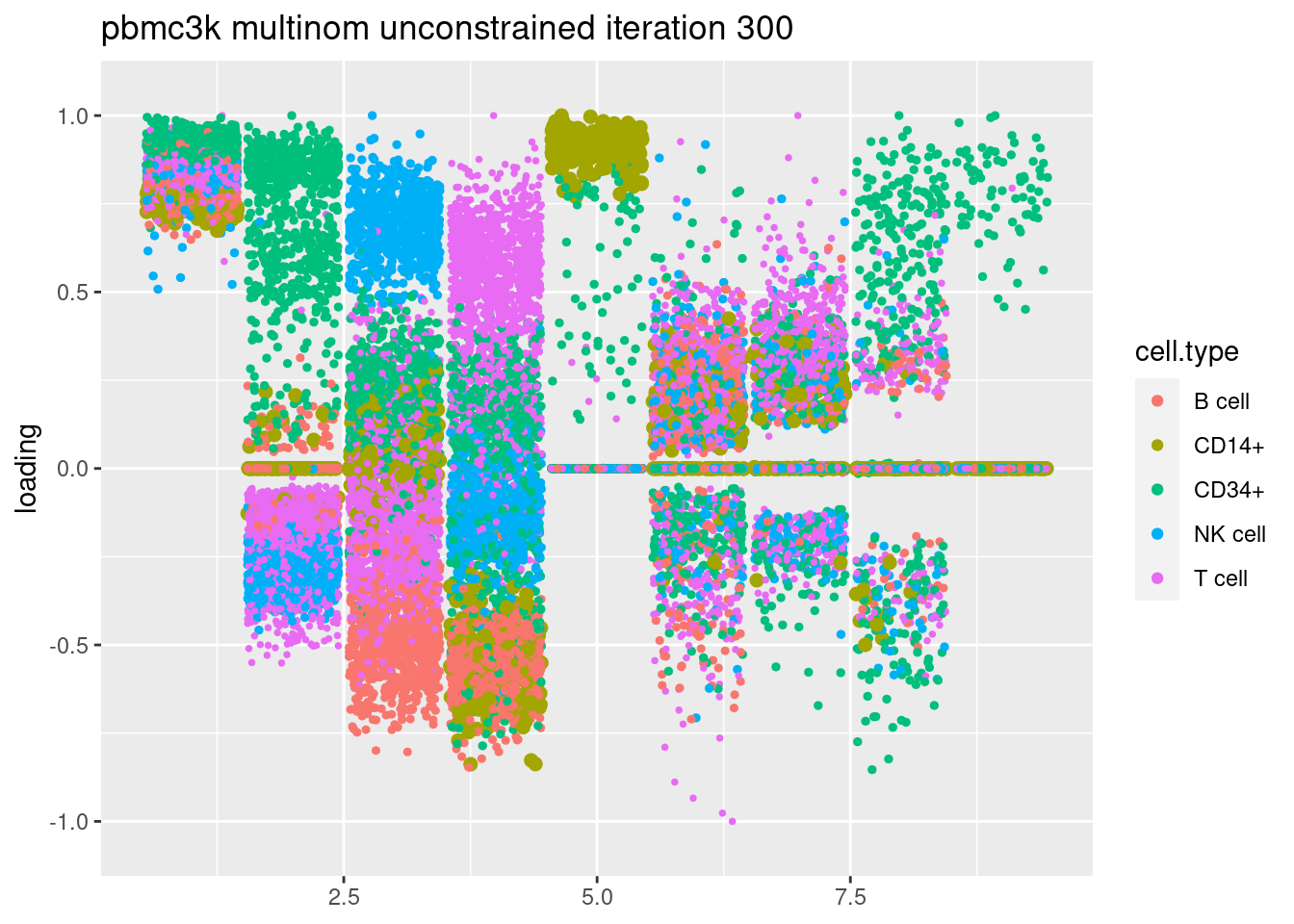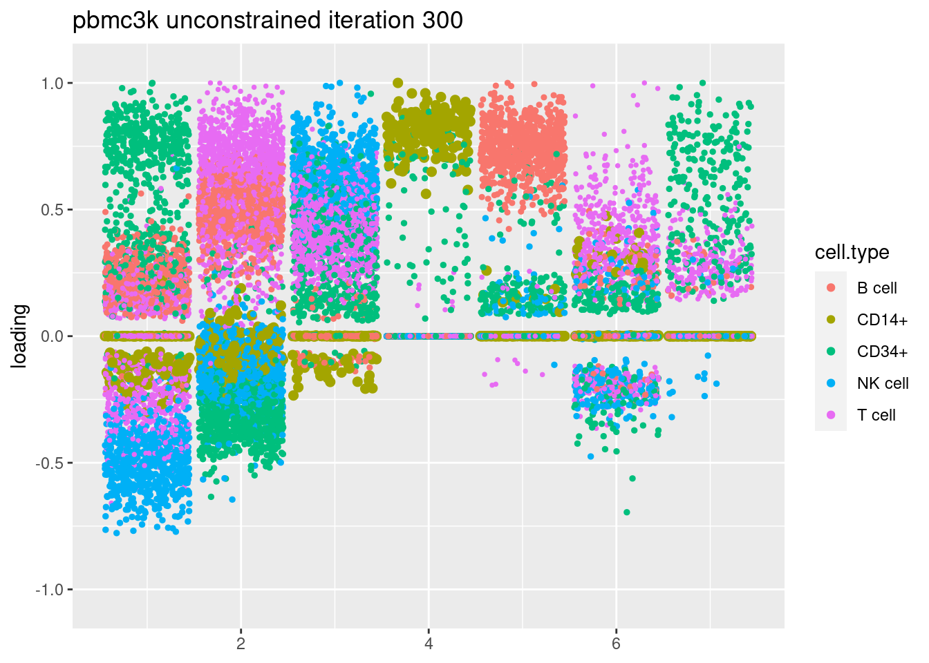 plt = plot.factors.general(fit$fit_flash$L.pm,pbmc_facs$samples$subpop,title=paste('pbmc3k glmpca init unconstrained iteration',i))