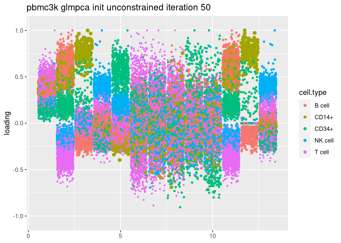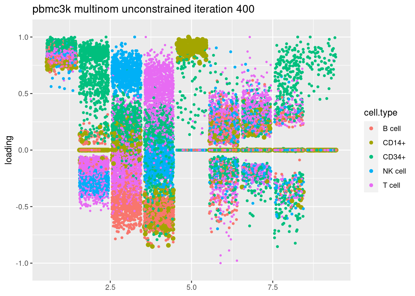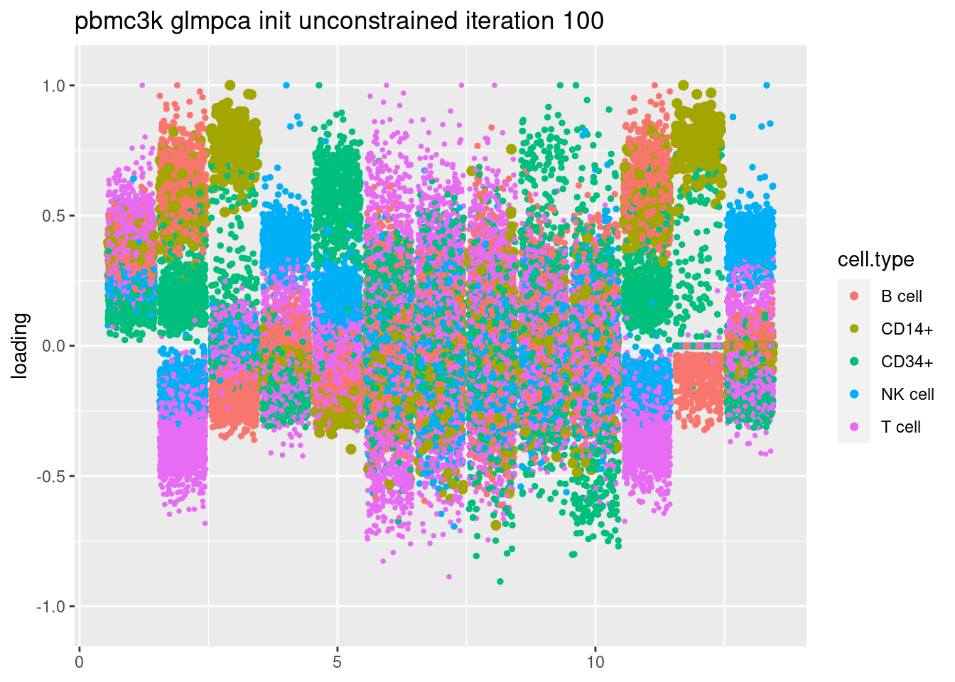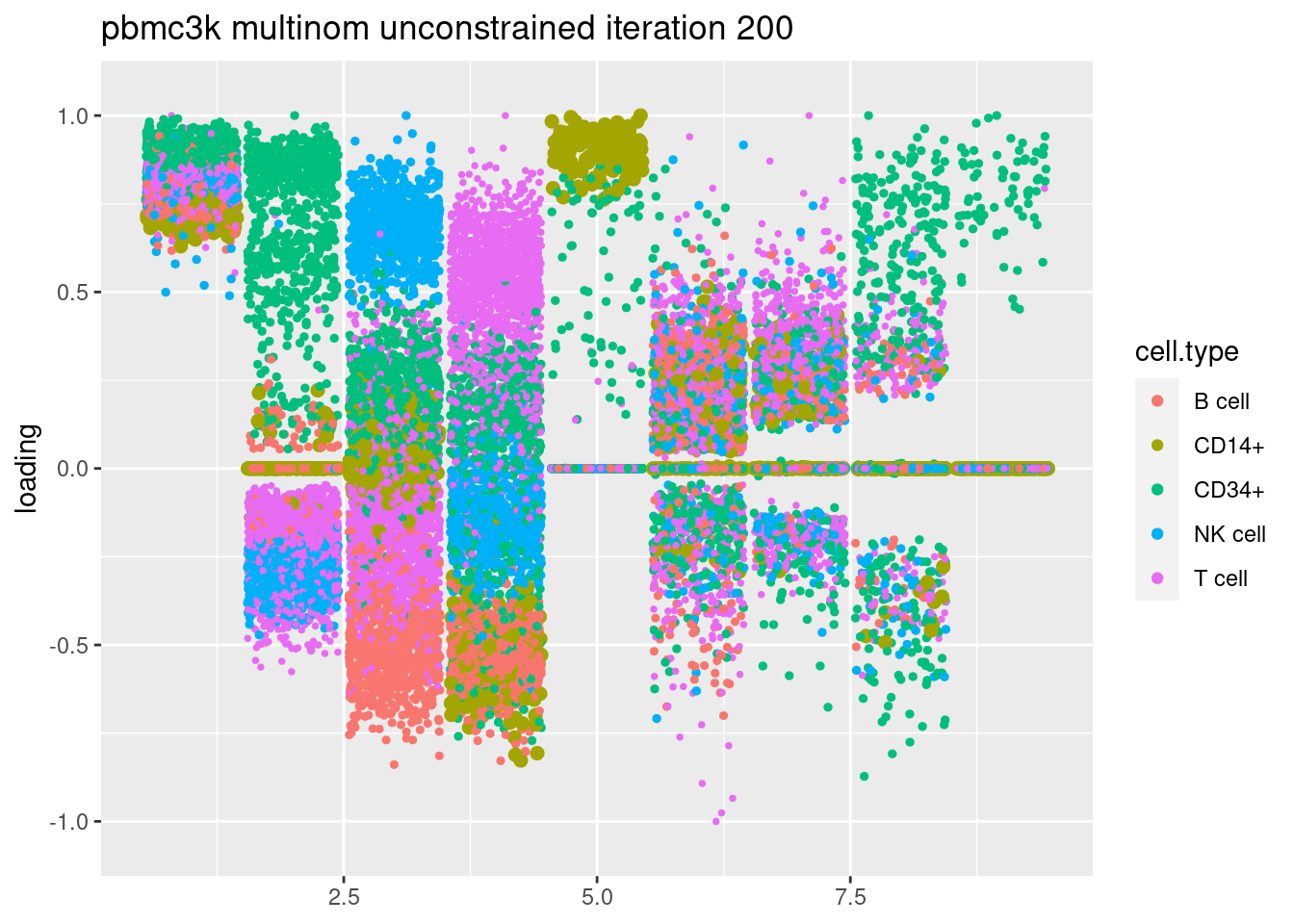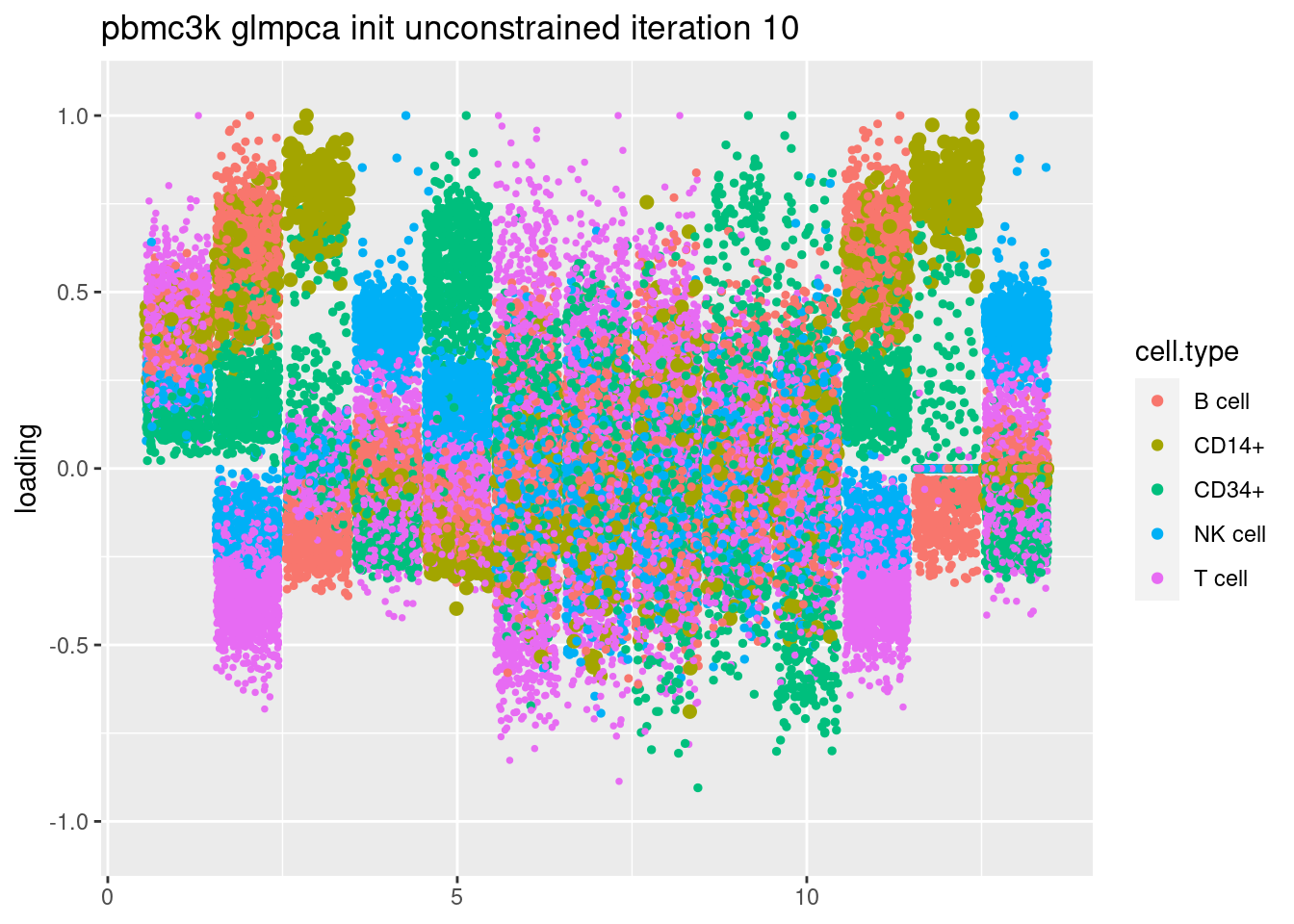 plt = plot.factors.general(fit$fit_flash$L.pm,pbmc_facs$samples$subpop,title=paste('pbmc3k glmpca init unconstrained iteration',i))