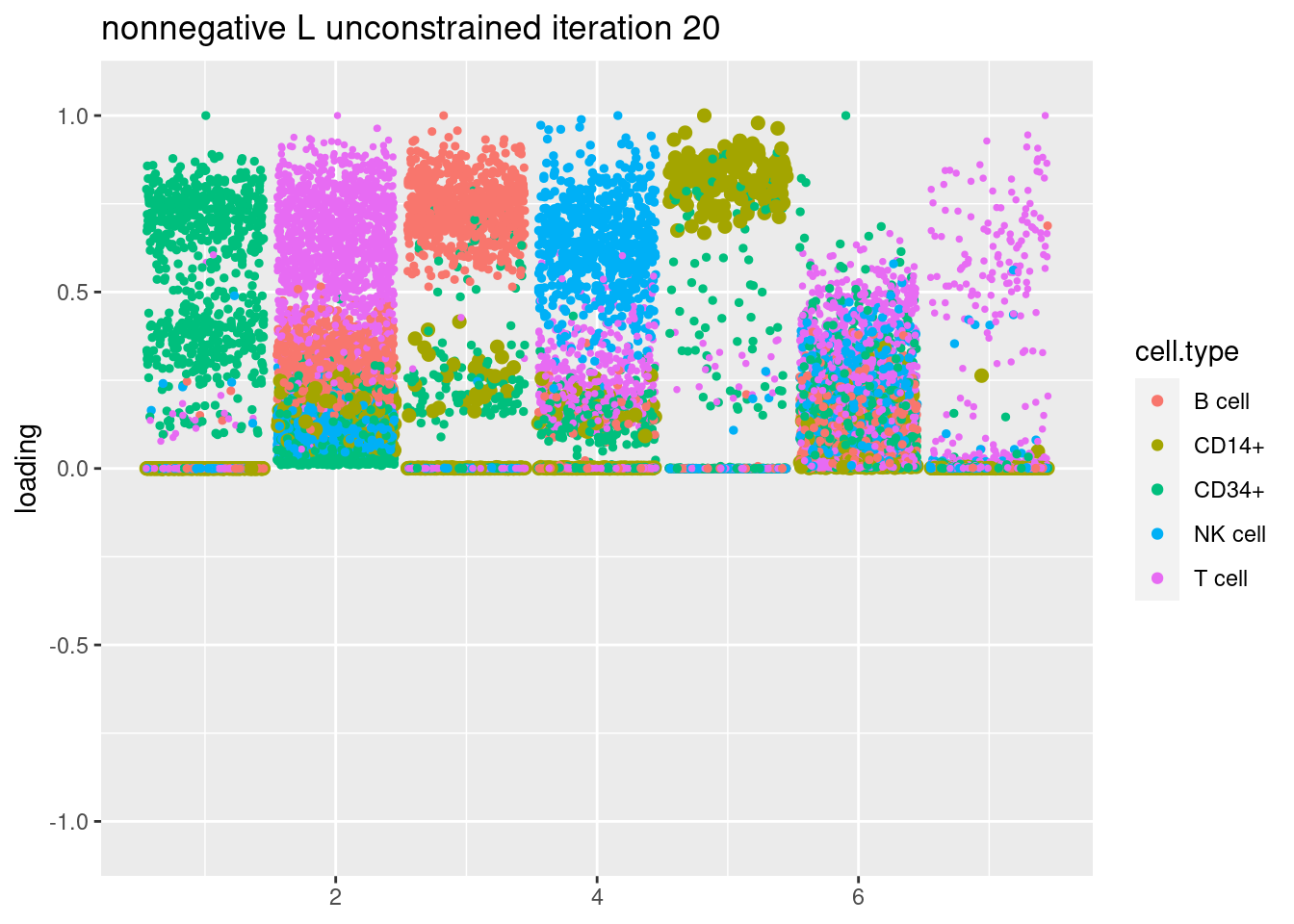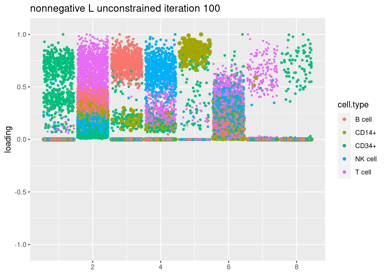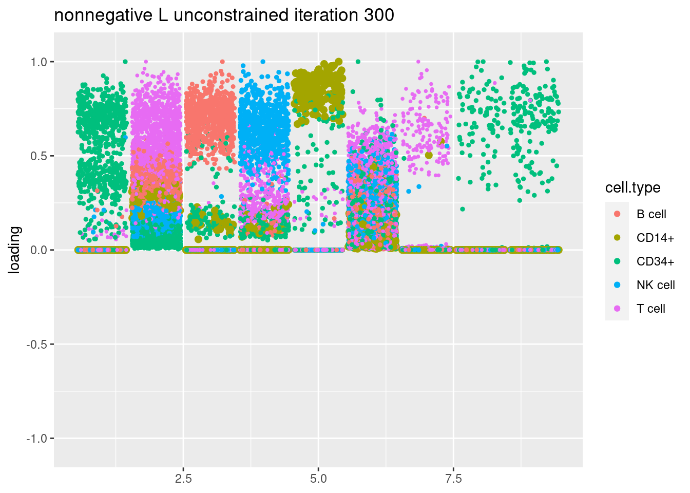 plt = plot.factors.general(fit$fit_flash$L.pm,pbmc_facs$samples$subpop,title=paste('nonnegative L unconstrained iteration',i))