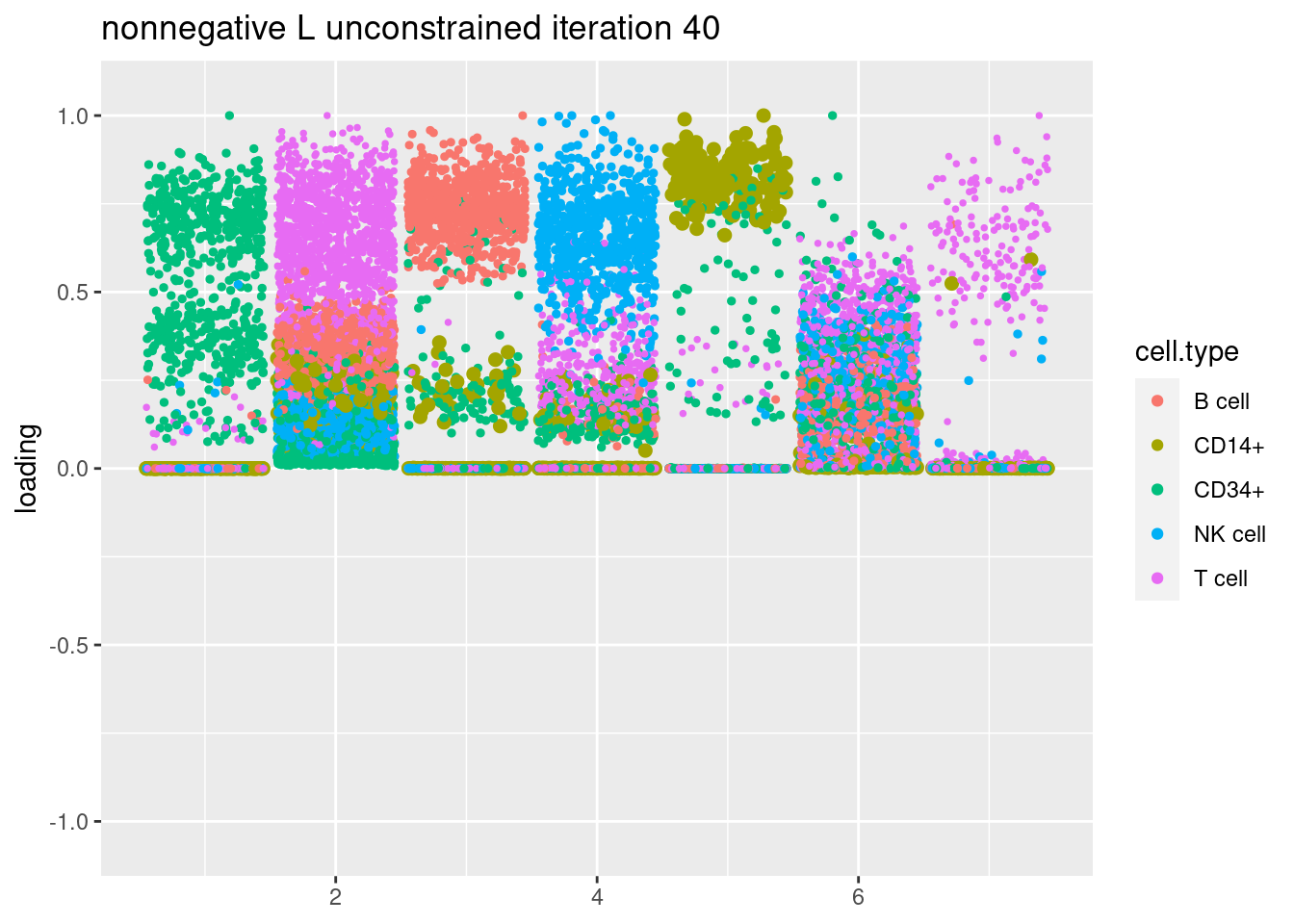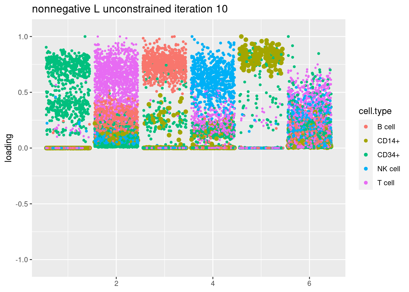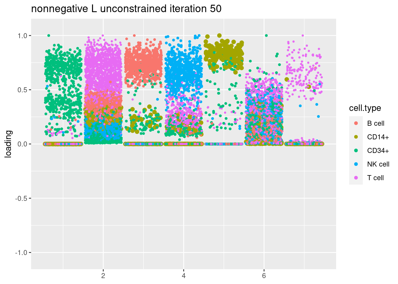 plt = plot.factors.general(fit$fit_flash$L.pm,pbmc_facs$samples$subpop,title=paste('nonnegative L unconstrained iteration',i))