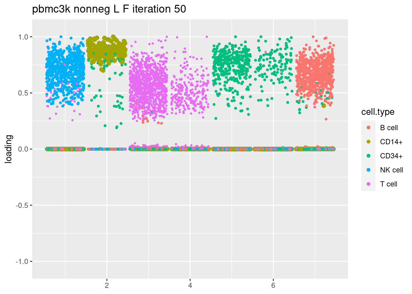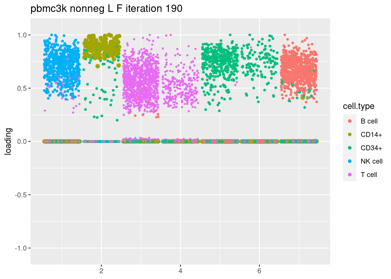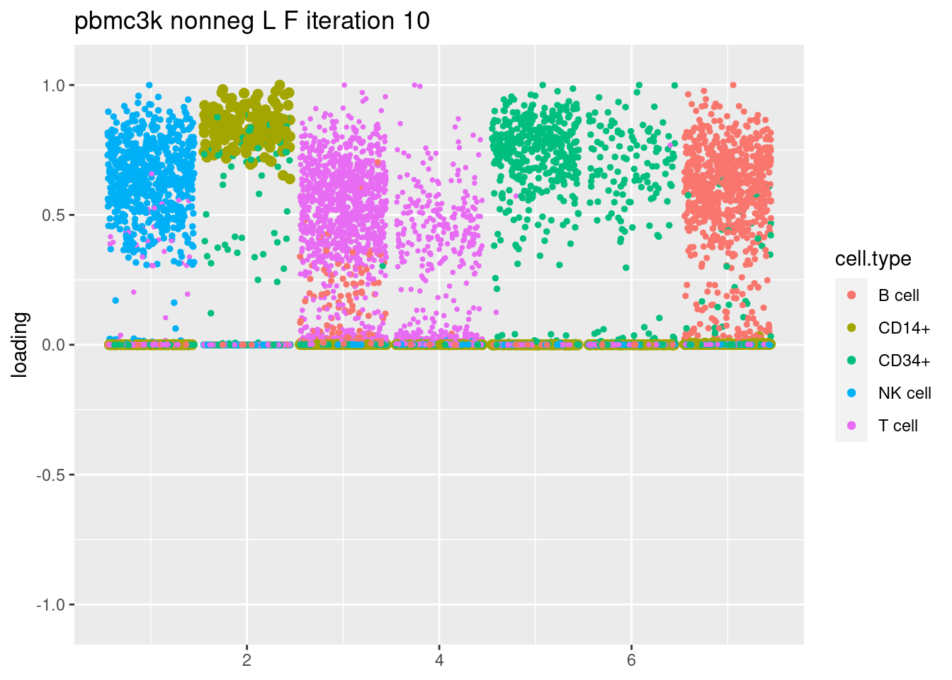 plt = plot.factors.general(fit$fit_flash$L.pm,pbmc_facs$samples$subpop,title=paste('pbmc3k nonneg L F iteration',i))