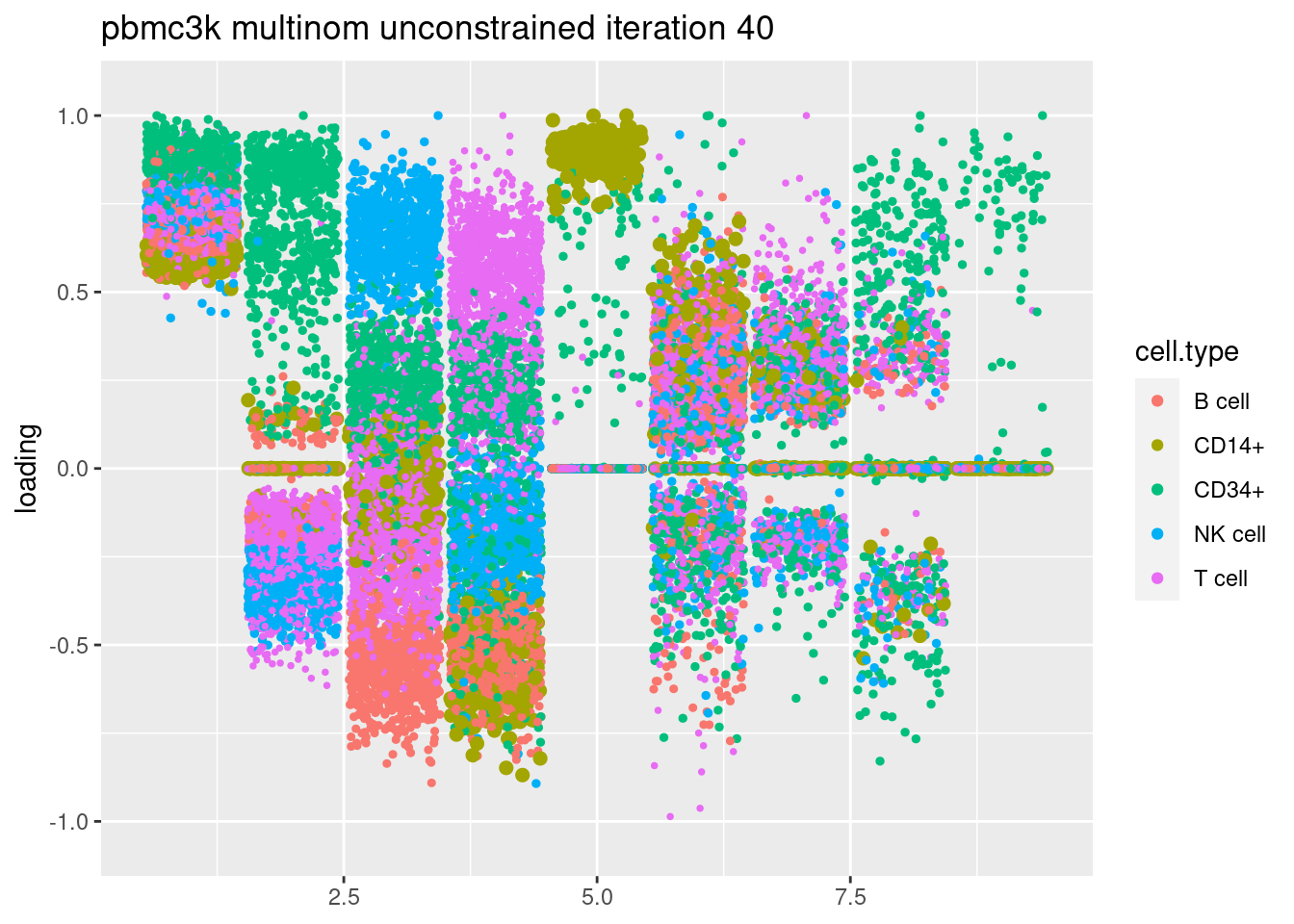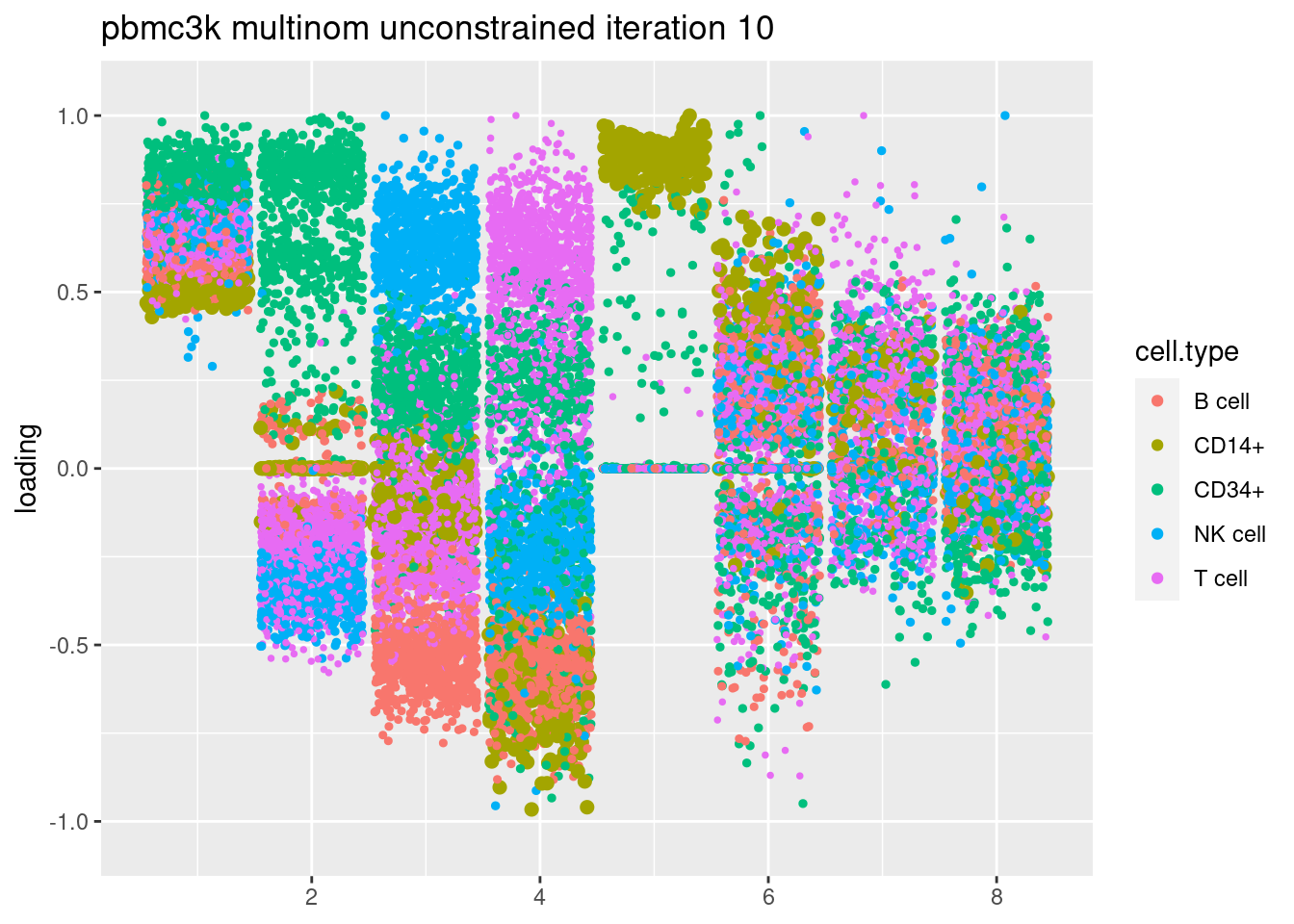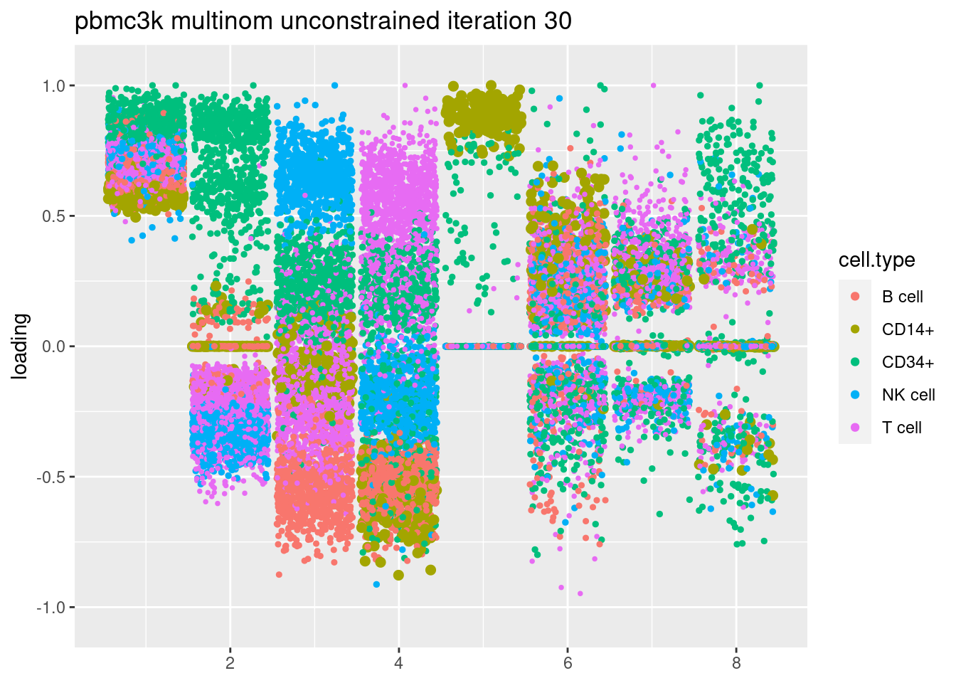 plt = plot.factors.general(fit$fit_flash$L.pm,pbmc_facs$samples$subpop,title=paste('pbmc3k multinom unconstrained iteration',i))
