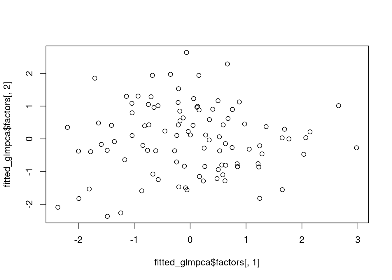 plot(fitted_glmpca$factors[,1],fitted_glmpca$factors[,2])