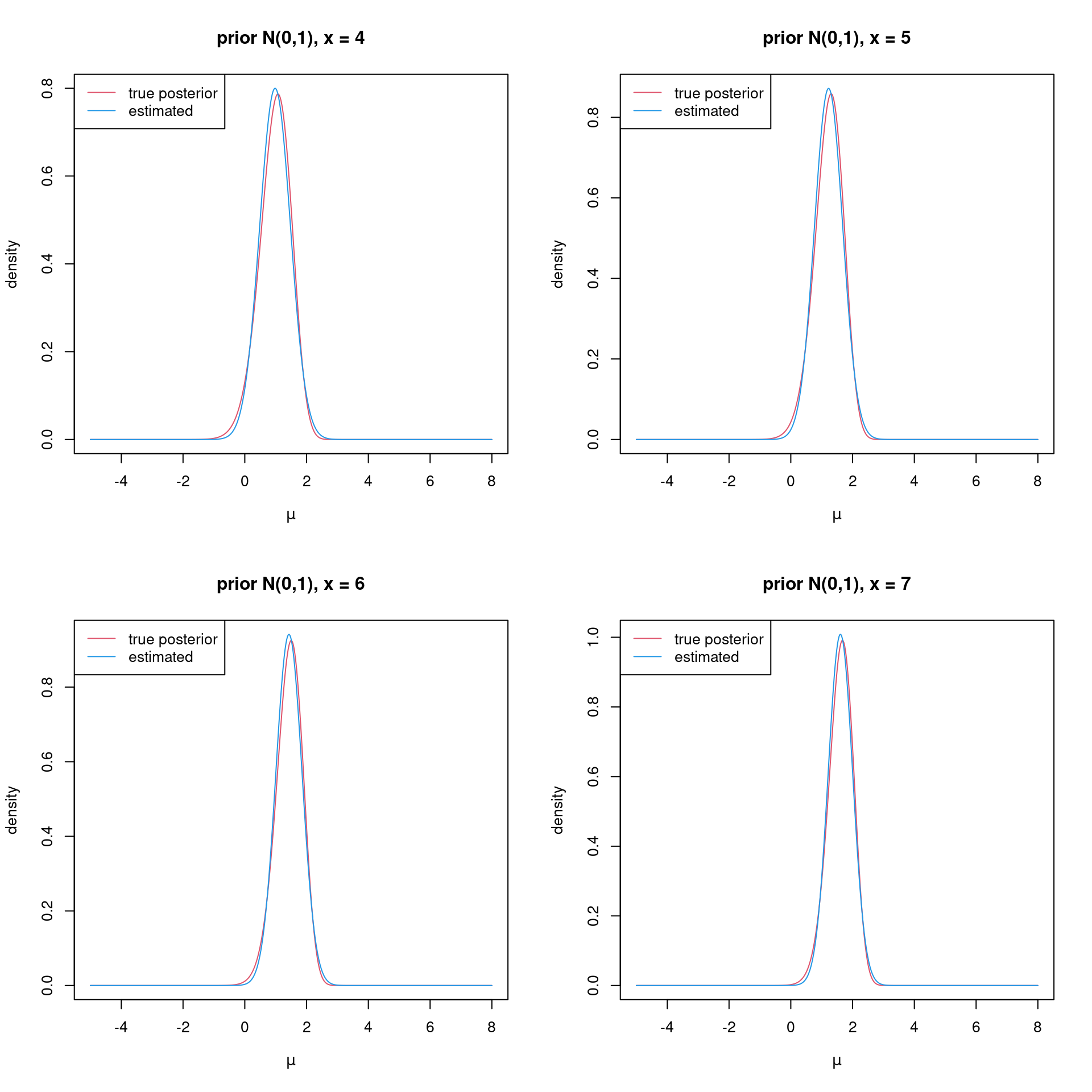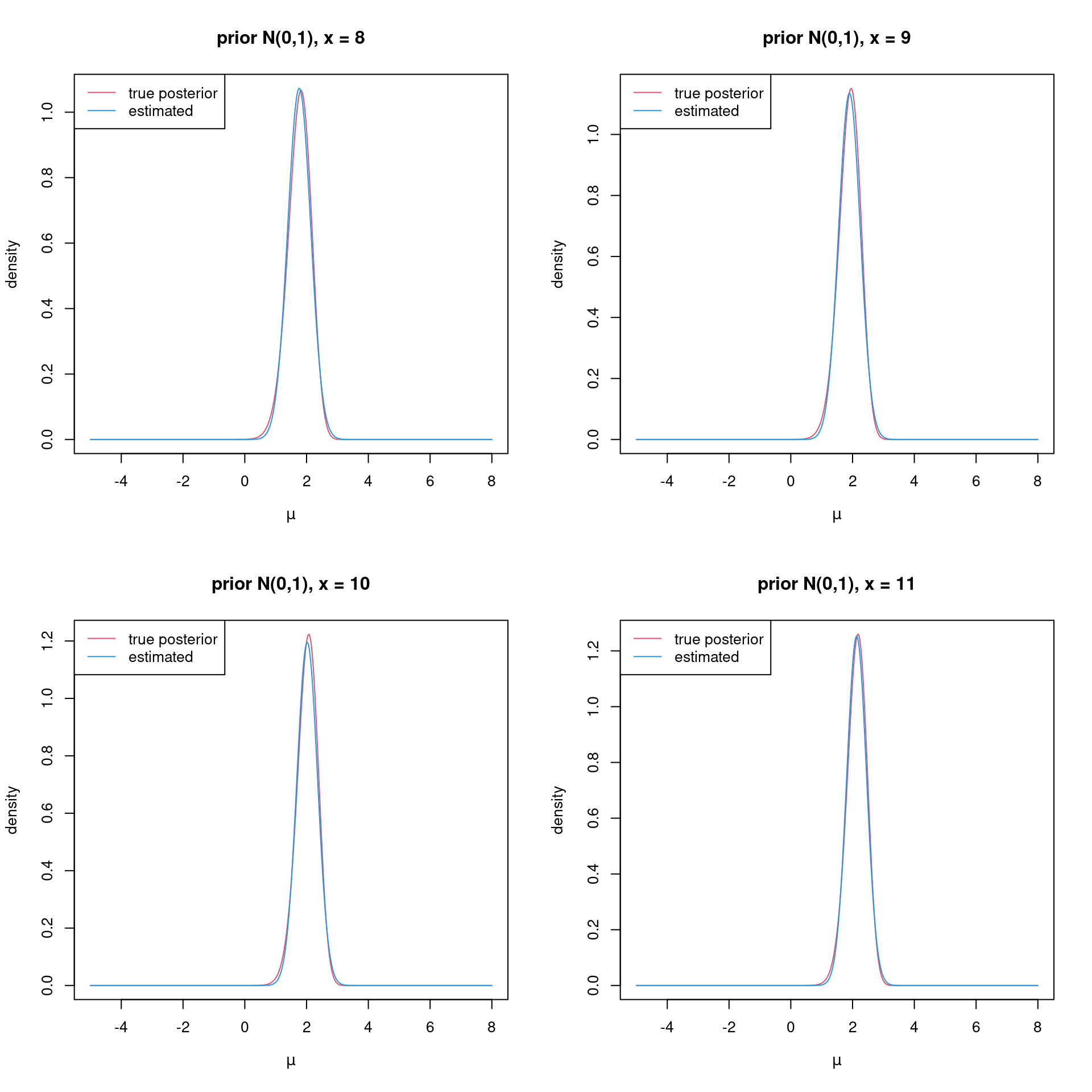 legend('topleft',c('true posterior','estimated'),lty=c(1,1),col=c(2,4))