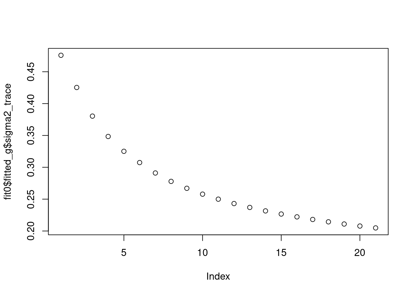 On the other hand, if \(g_b\) goes to a non-pointmass, then \(\sigma^2\) can converge to a smaller value, but not 0. In this simulation we know that true \(\sigma^2\) is 0, and in this case the estimated \(\sigma^2\) converges to 0.2.