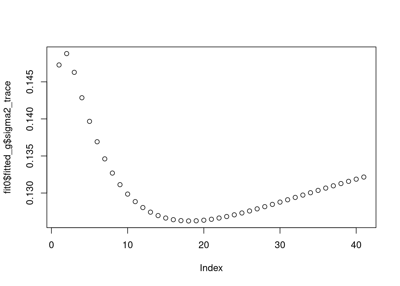 Maybe we should not start with a too large \(\sigma^2\) because \(g_b\) being a point mass is a local optimum and in most cases we are not very interested in. I find that the starting \(\sigma^2\) should not be greater than \(var(\bar\mu_i)\), and perhaps smaller.