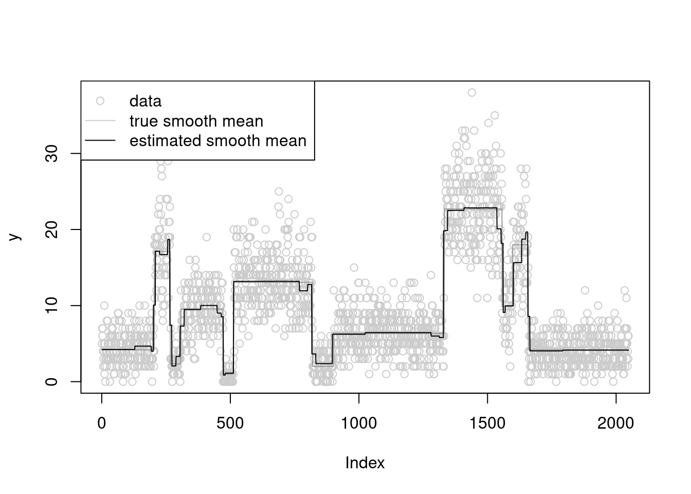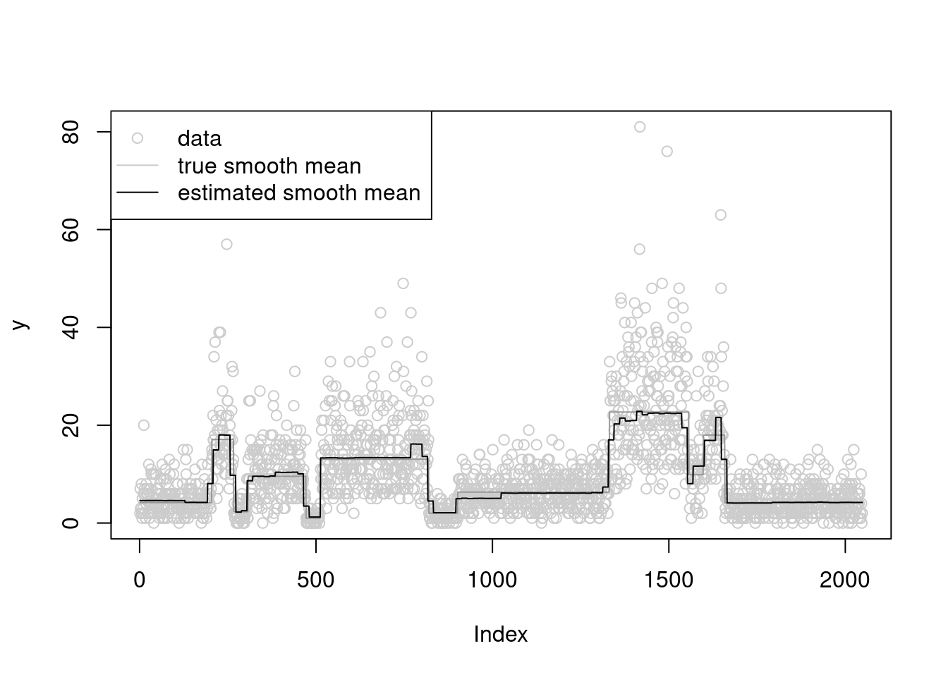 legend('topleft',c('data','true smooth mean','estimated smooth mean'),lty=c(NA,1,1),pch=c(1,NA,NA),col=c('grey80','grey80',1))