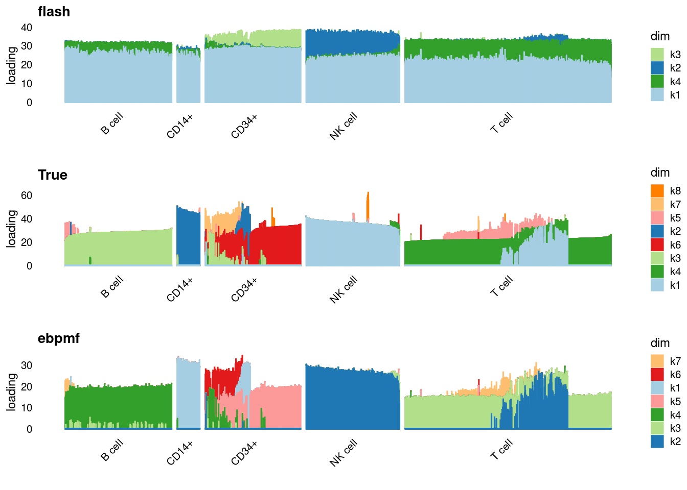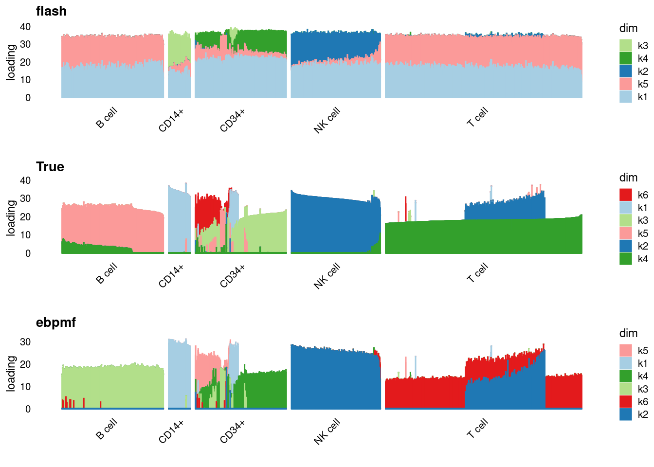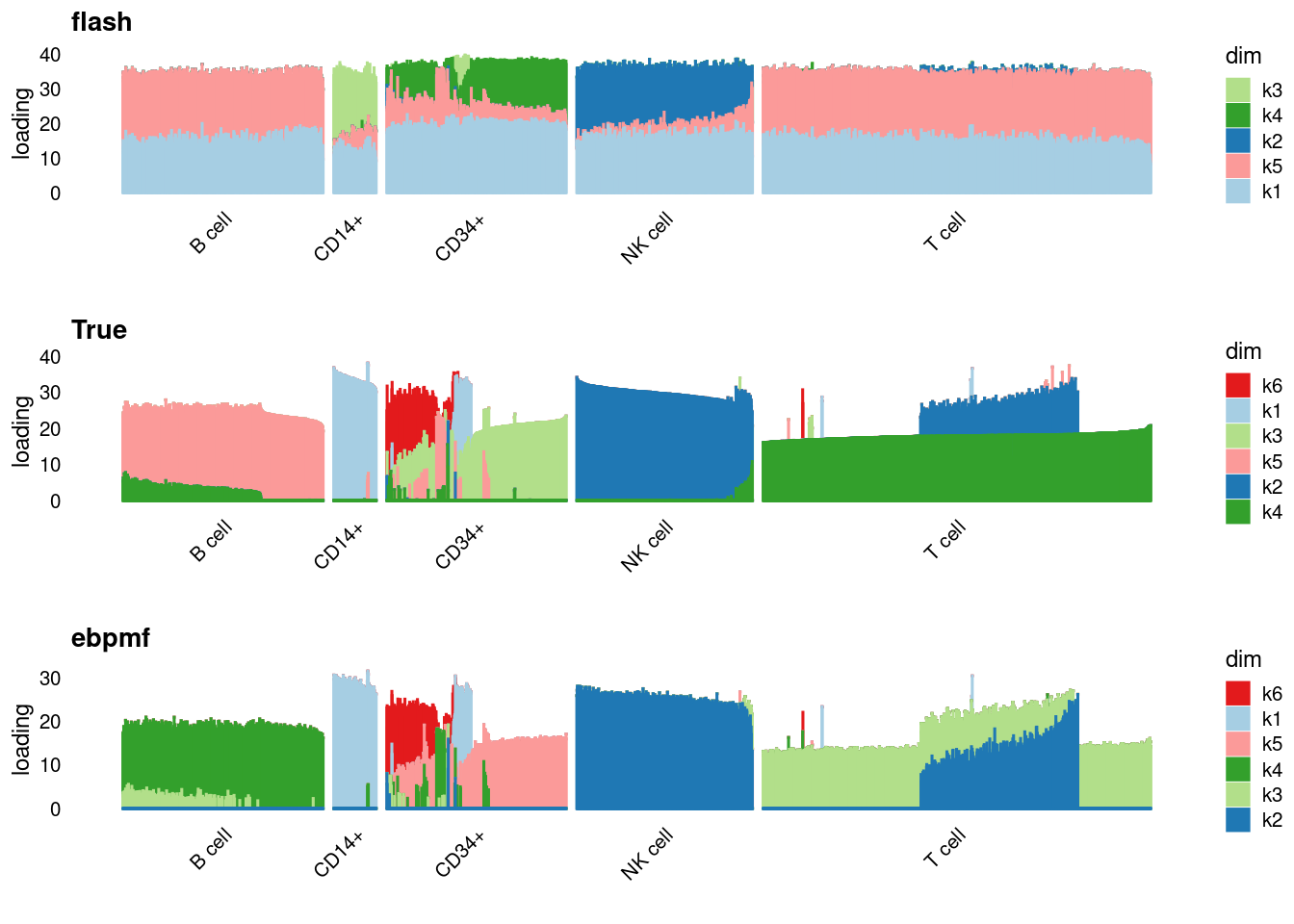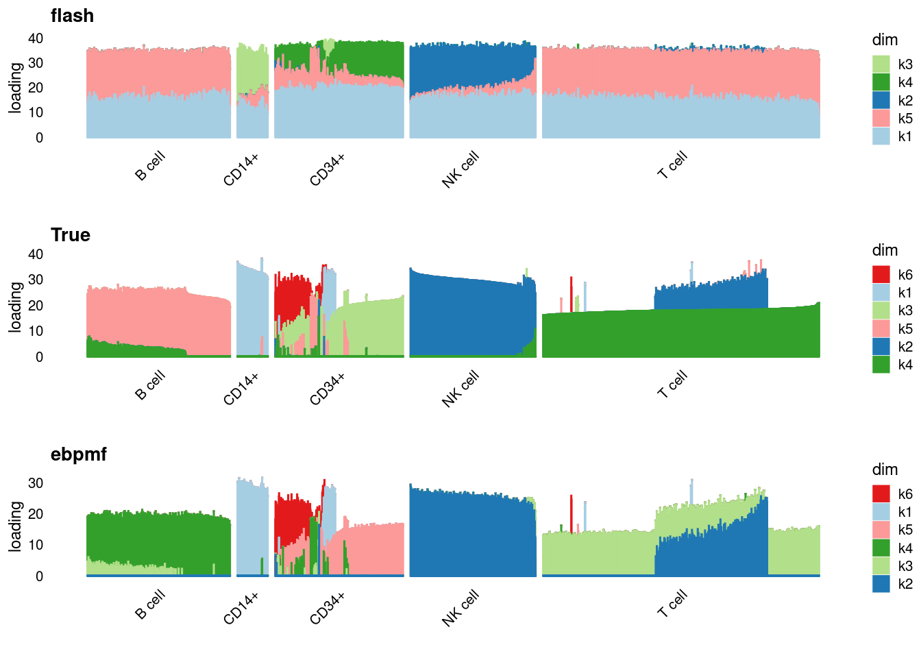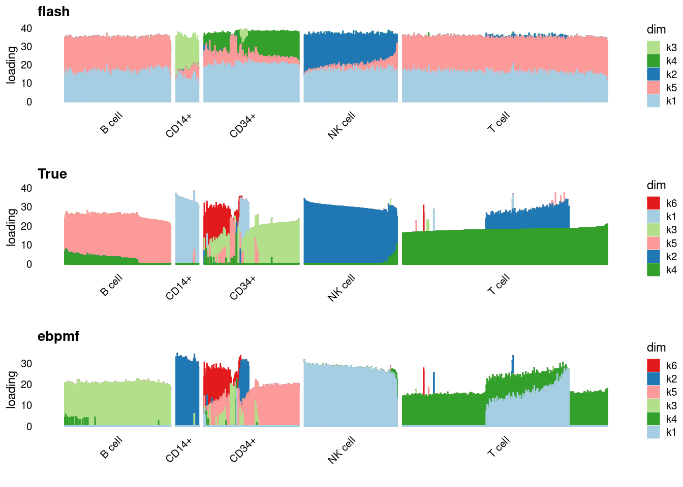 plot0=structure_plot_general(res$sim_data$Loading,res$sim_data$Factor,grouping =cell_names,title = 'True',print_plot = F,loadings_order = loadings_order)