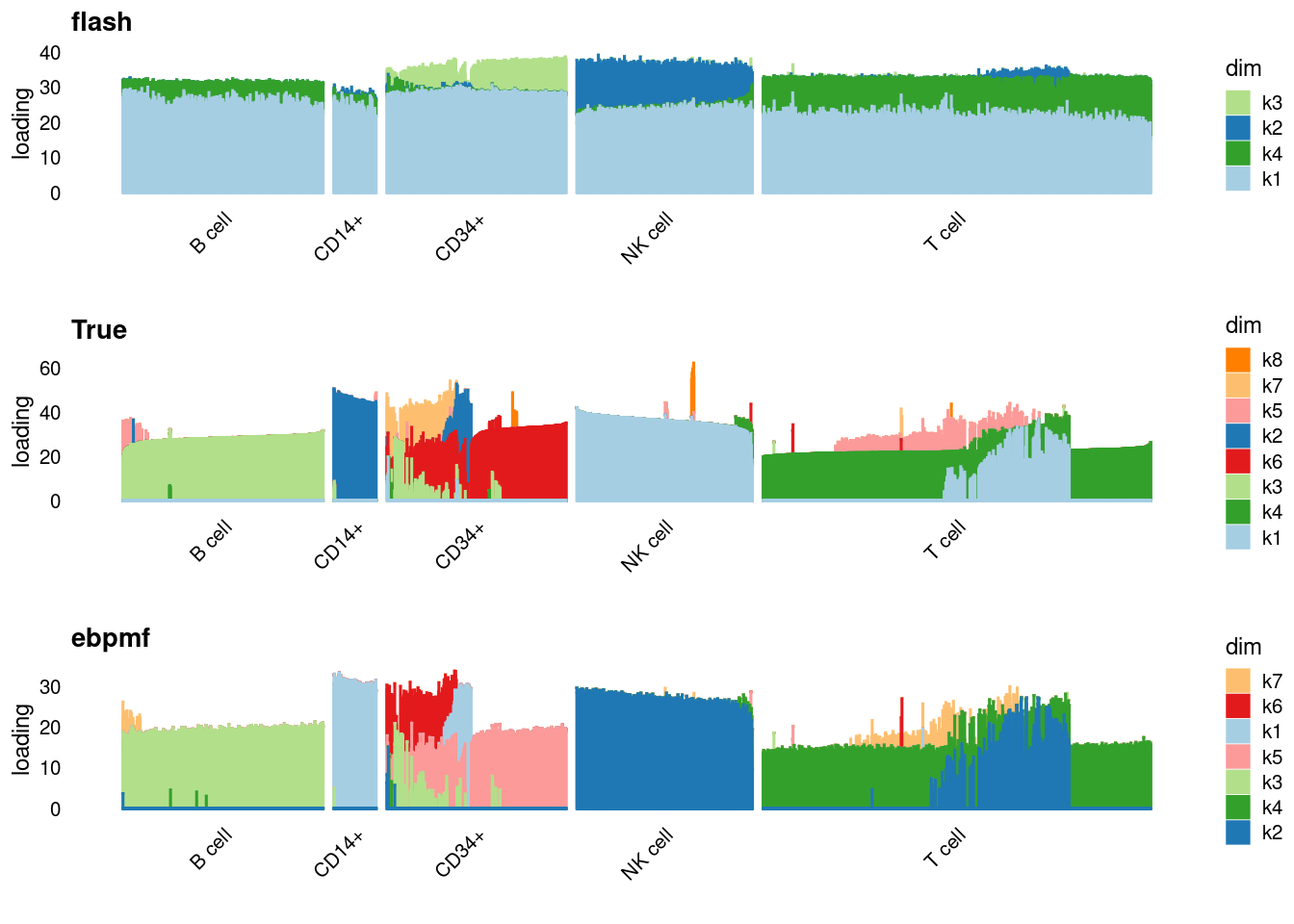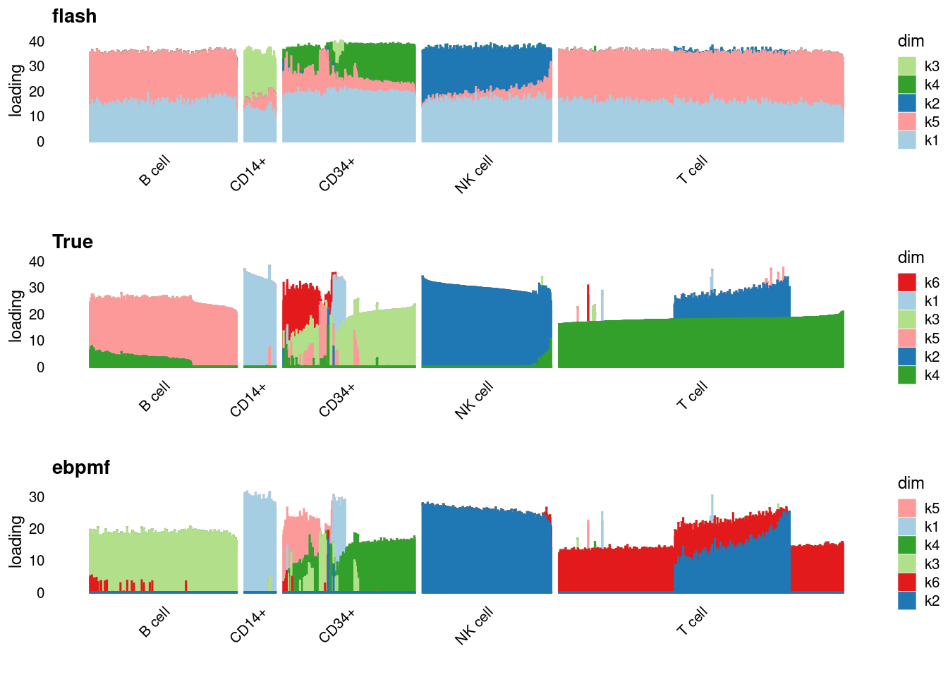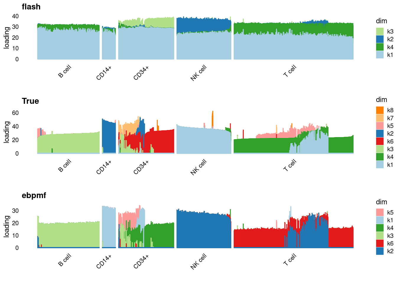 plot0=structure_plot_general(res$sim_data$Loading,res$sim_data$Factor,grouping =cell_names,title = 'True',print_plot = F,loadings_order=loadings_order)