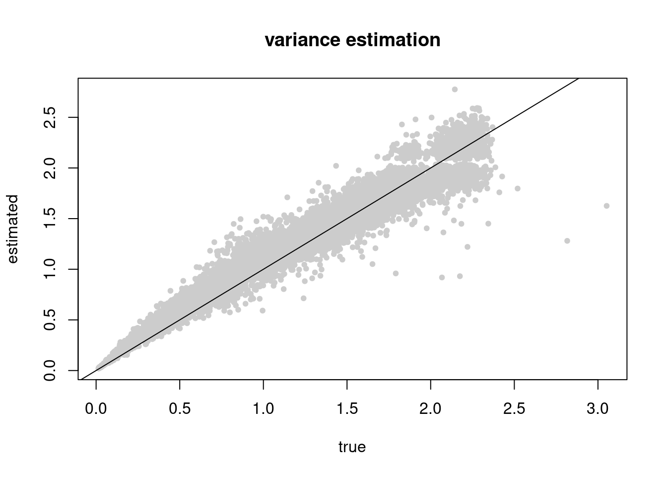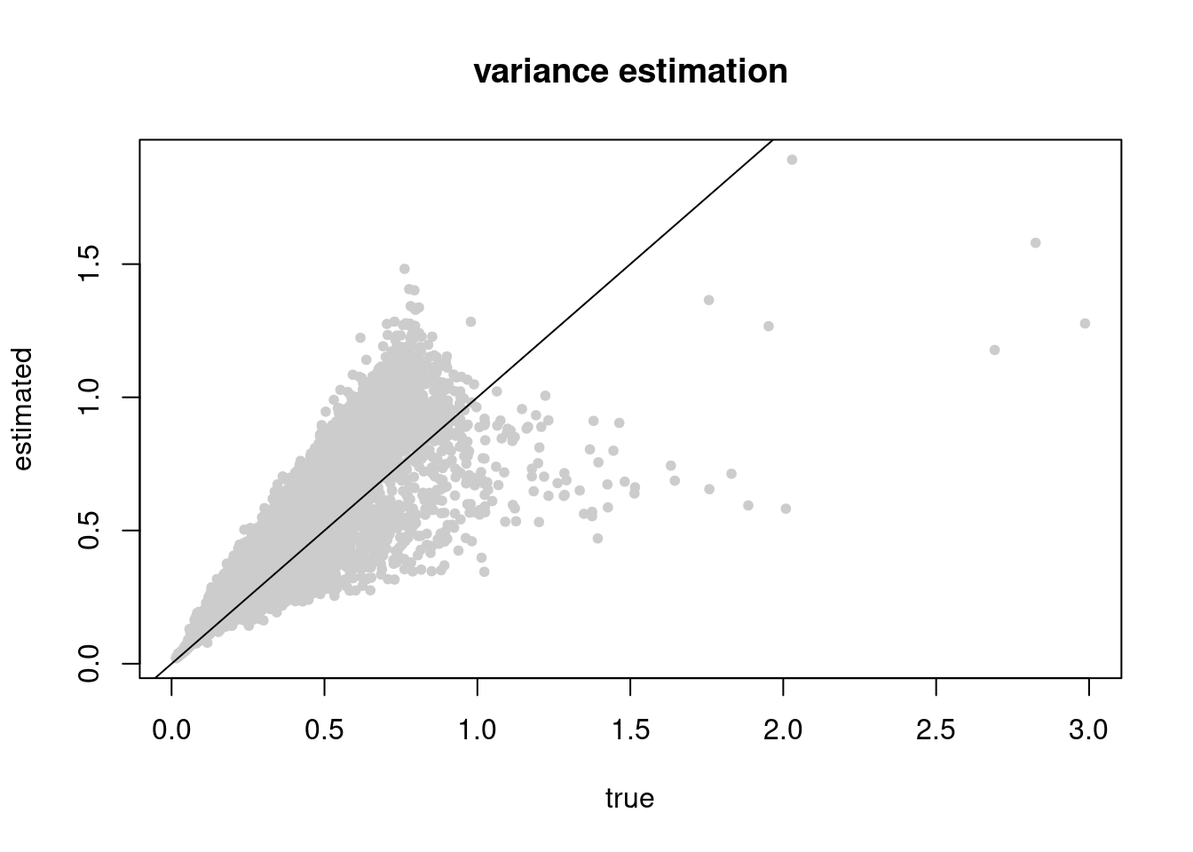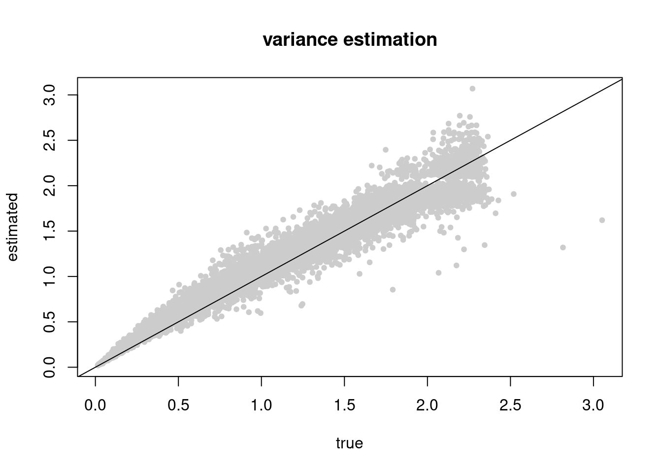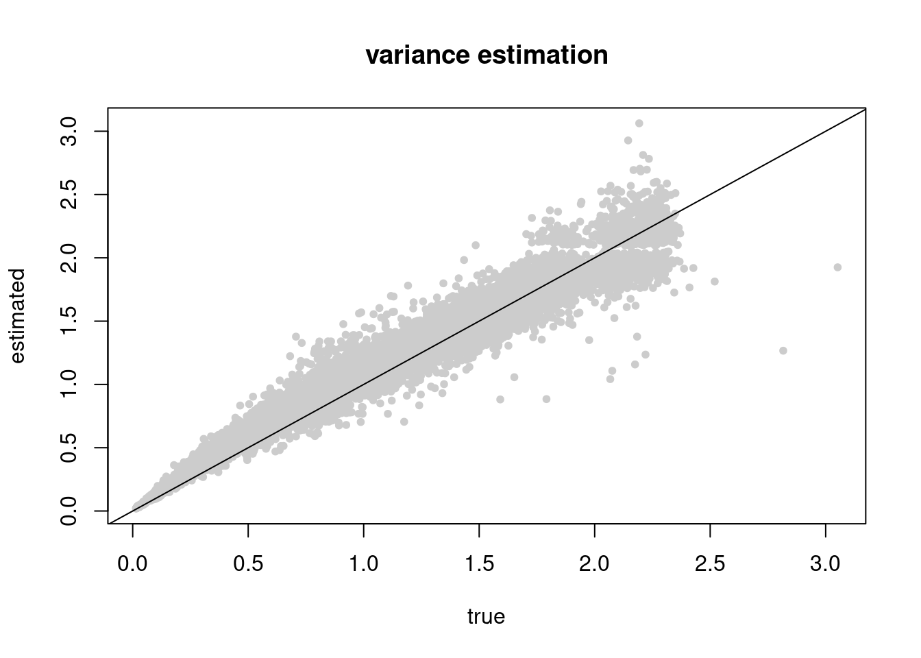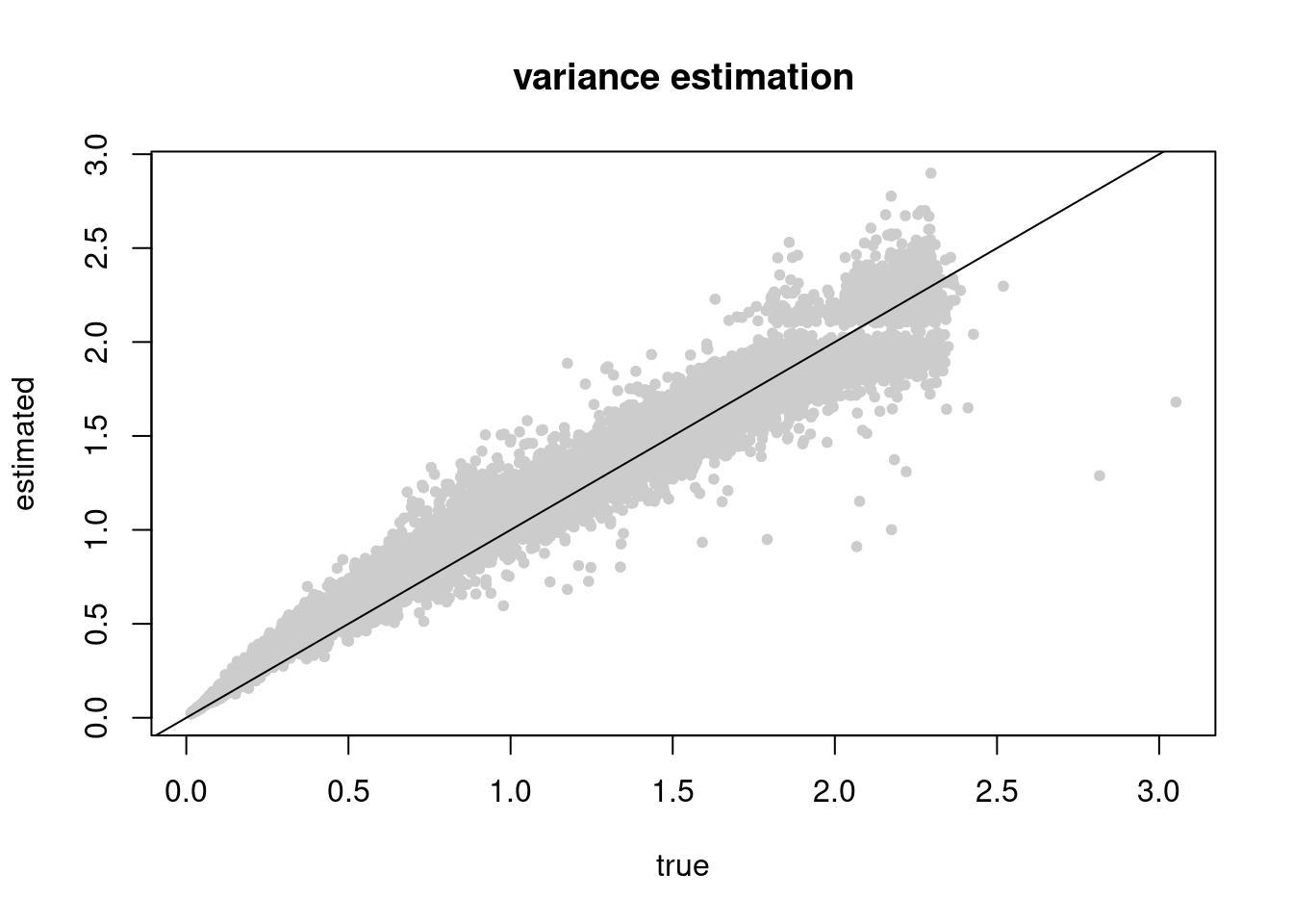plot(fit$sigma2,res$output[[i]]$fitted_model$ebpmf$sigma2,col='grey80',pch=20,xlab='true',ylab='estimated',main='variance estimation')