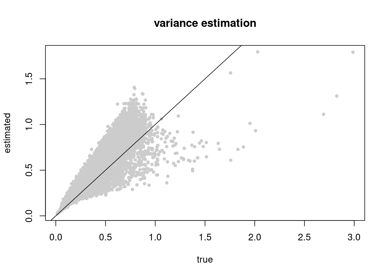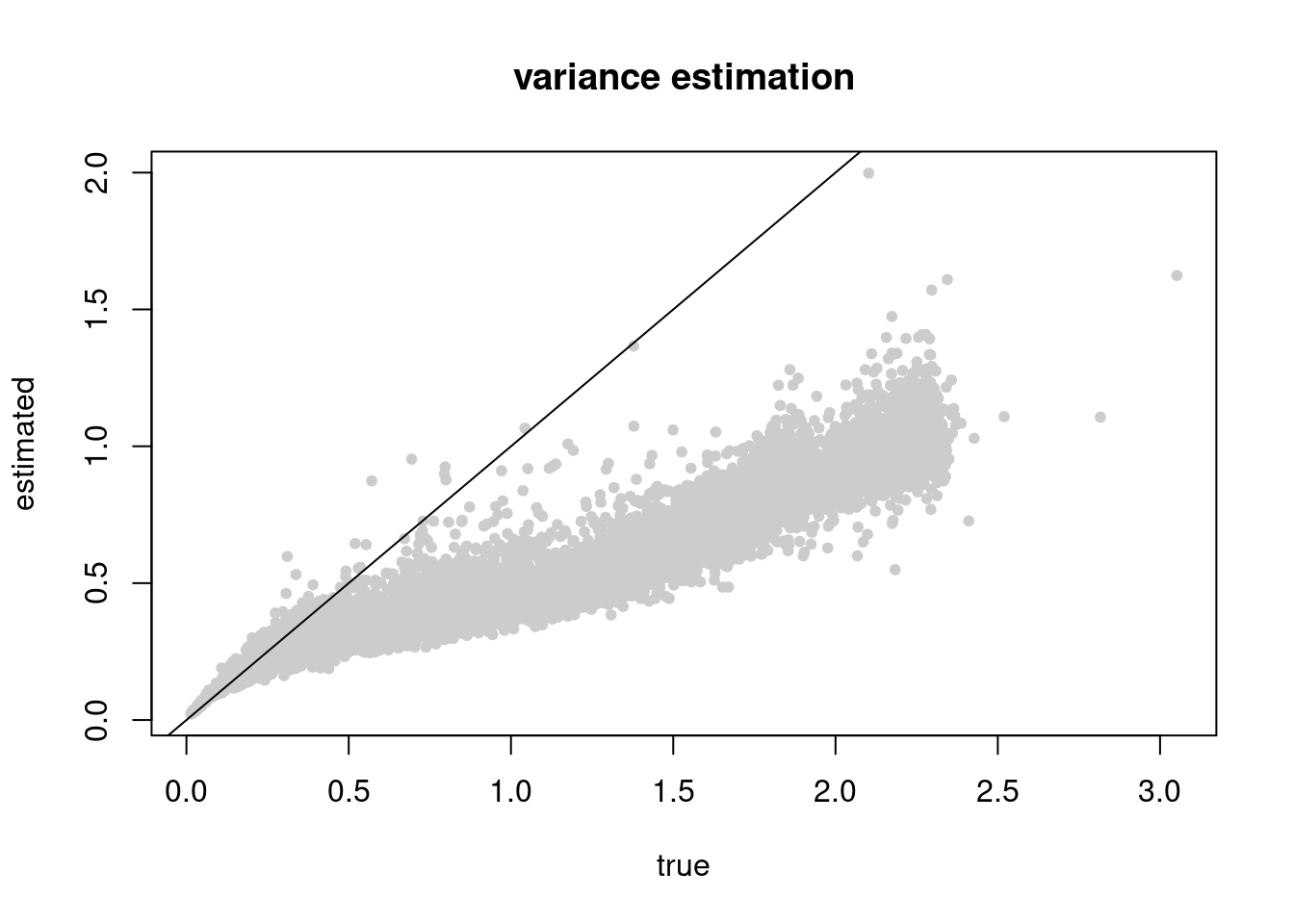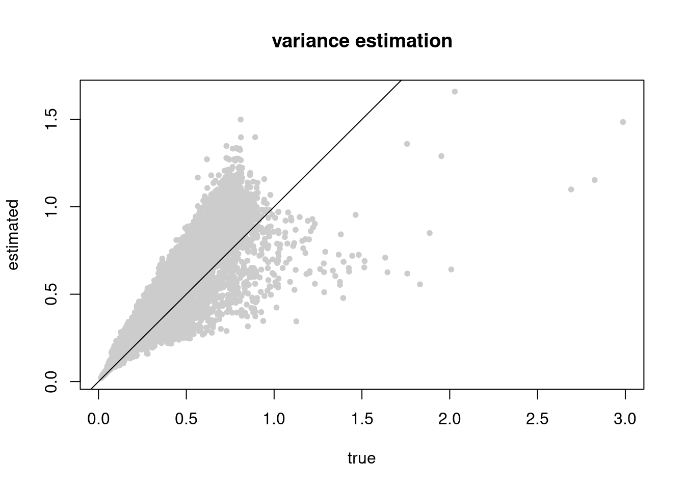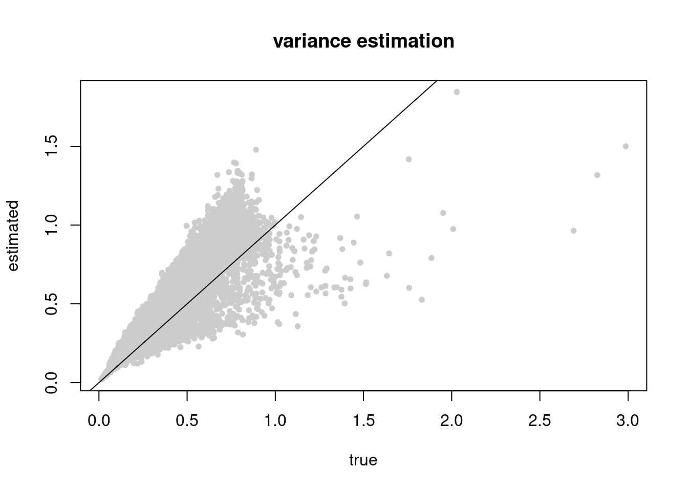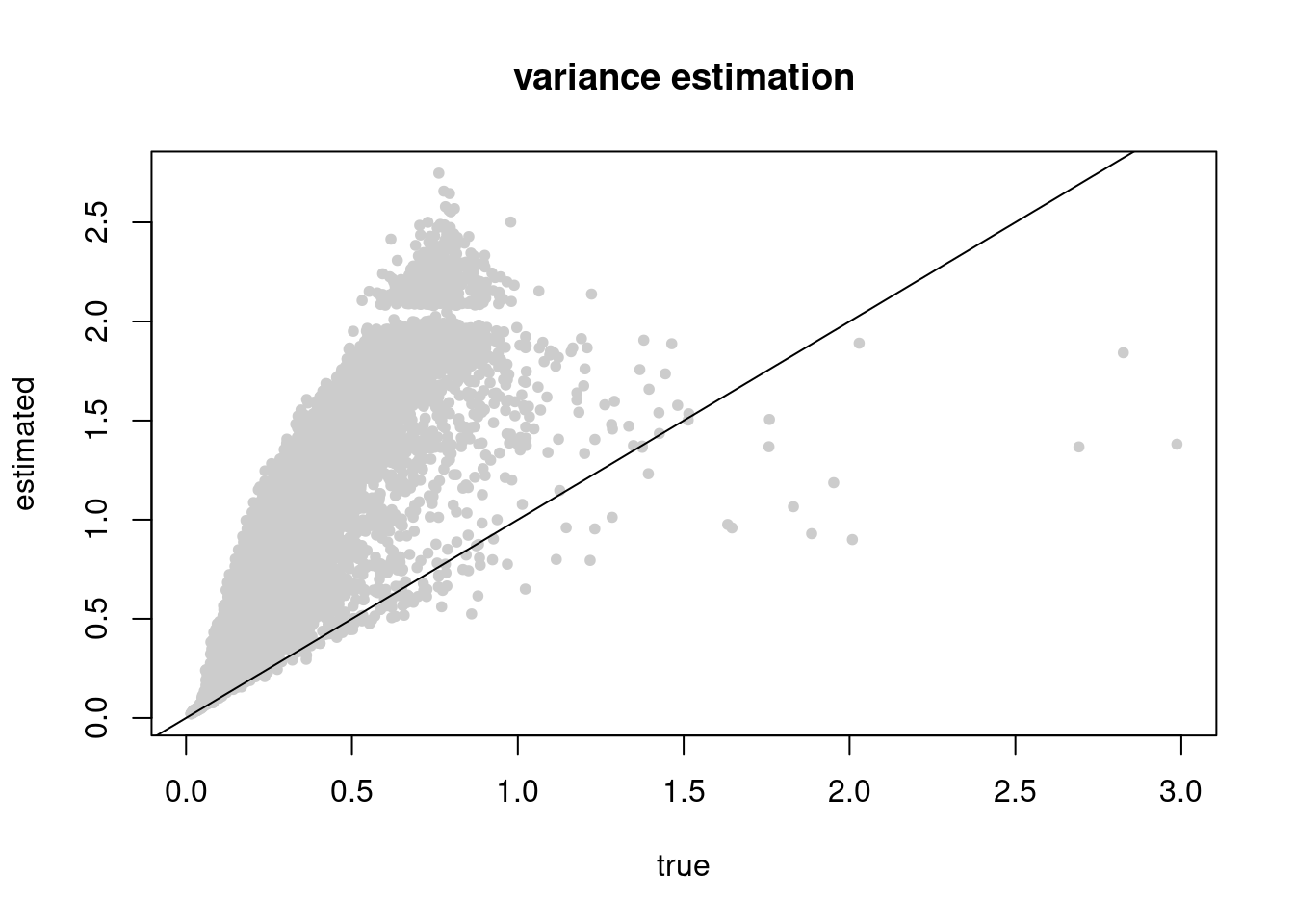 plot(fit$sigma2,res$output[[i]]$fitted_model$ebpmf$sigma2,col='grey80',pch=20,xlab='true',ylab='estimated',main='variance estimation')