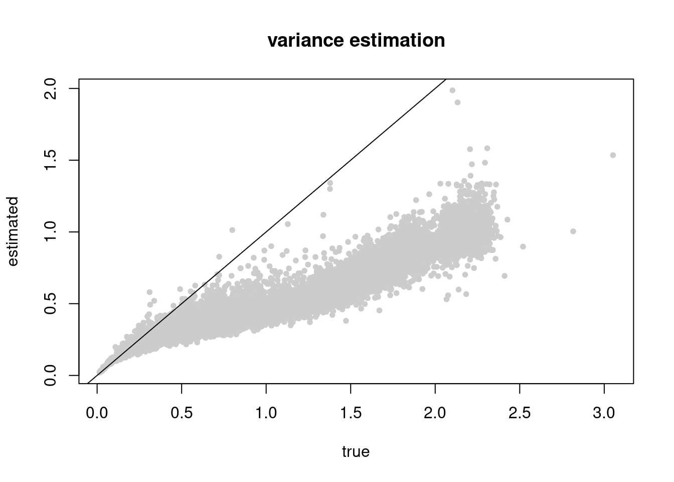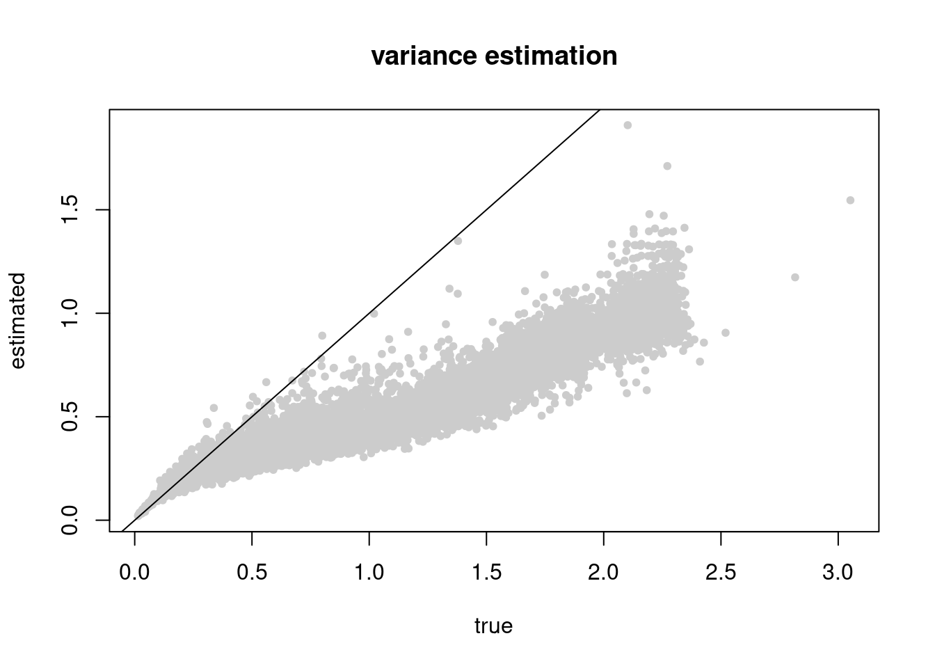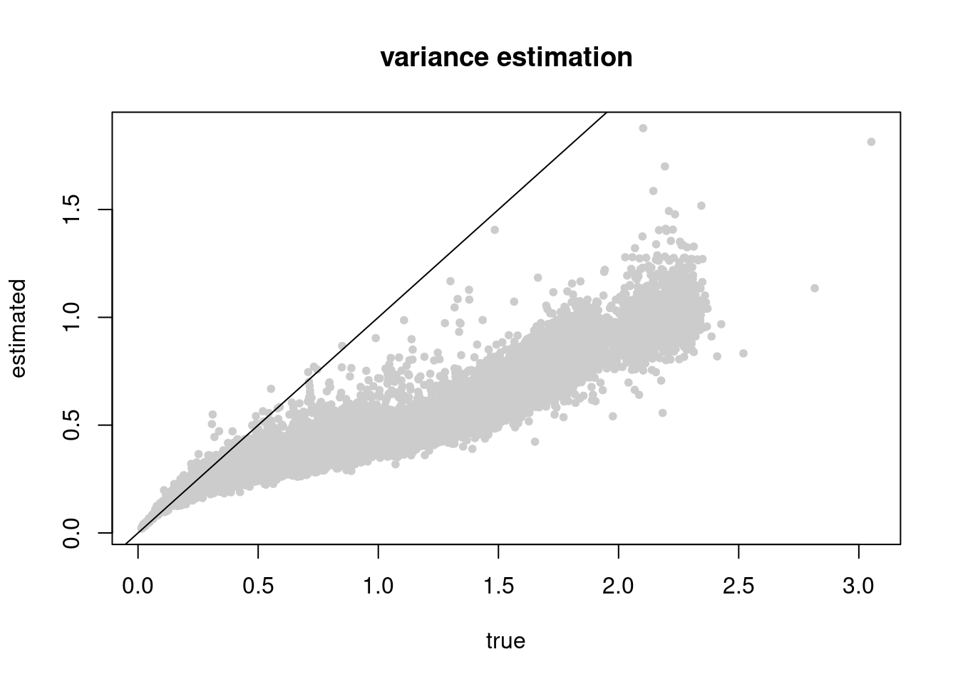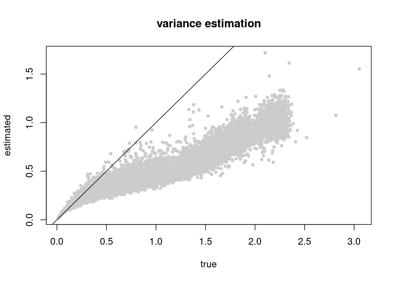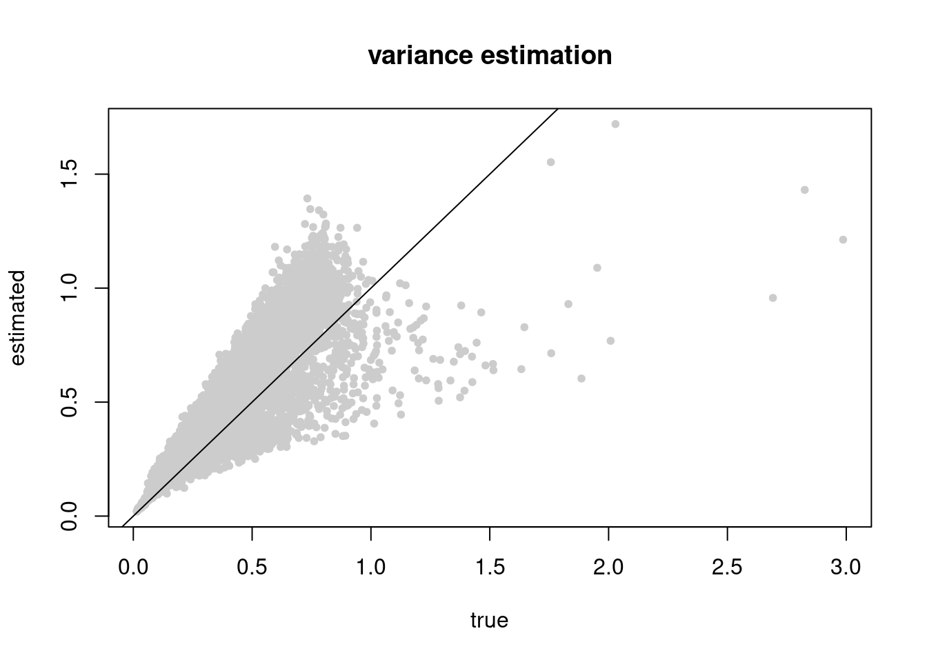 plot(fit$sigma2,res$output[[i]]$fitted_model$ebpmf$sigma2,col='grey80',pch=20,xlab='true',ylab='estimated',main='variance estimation')