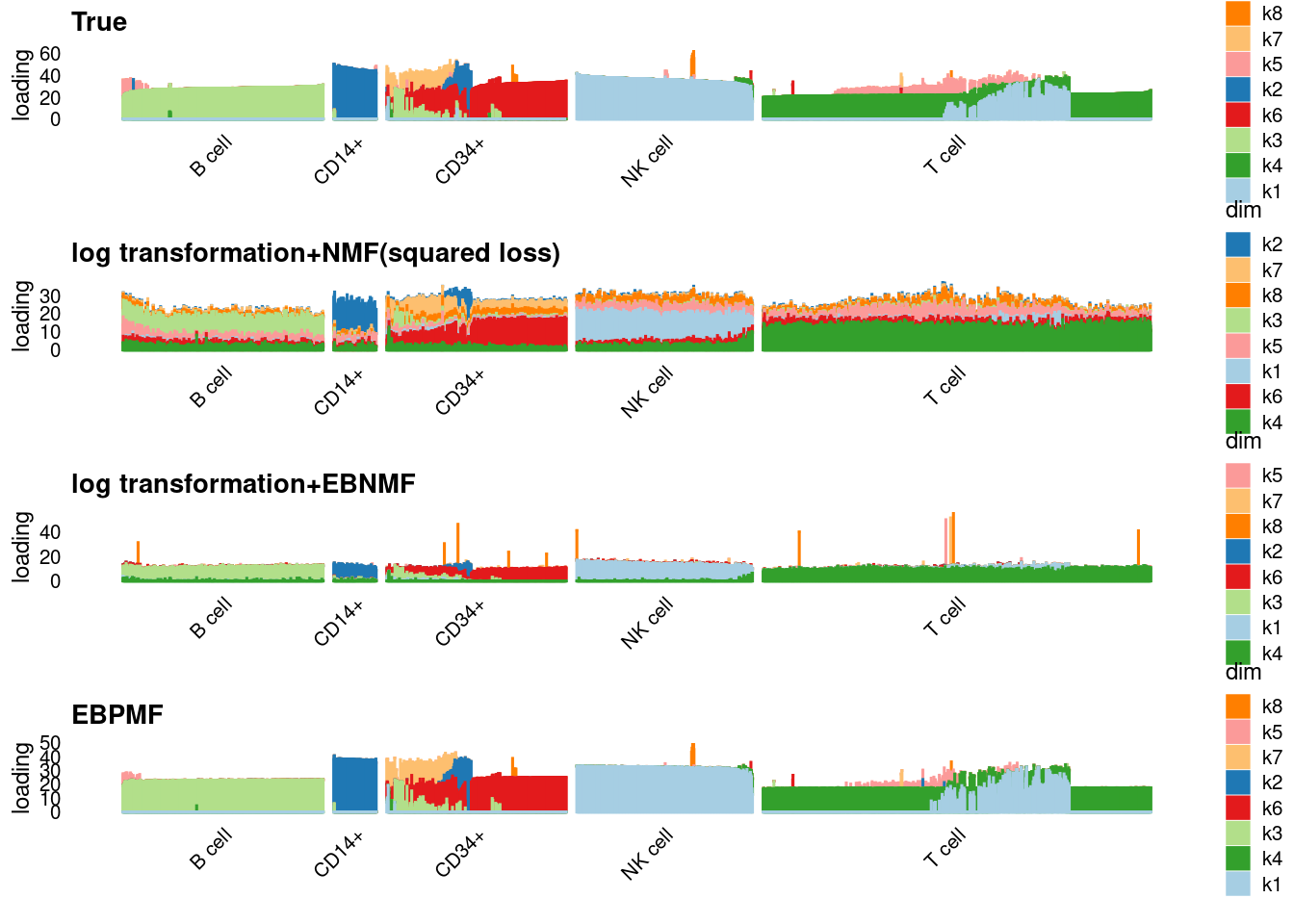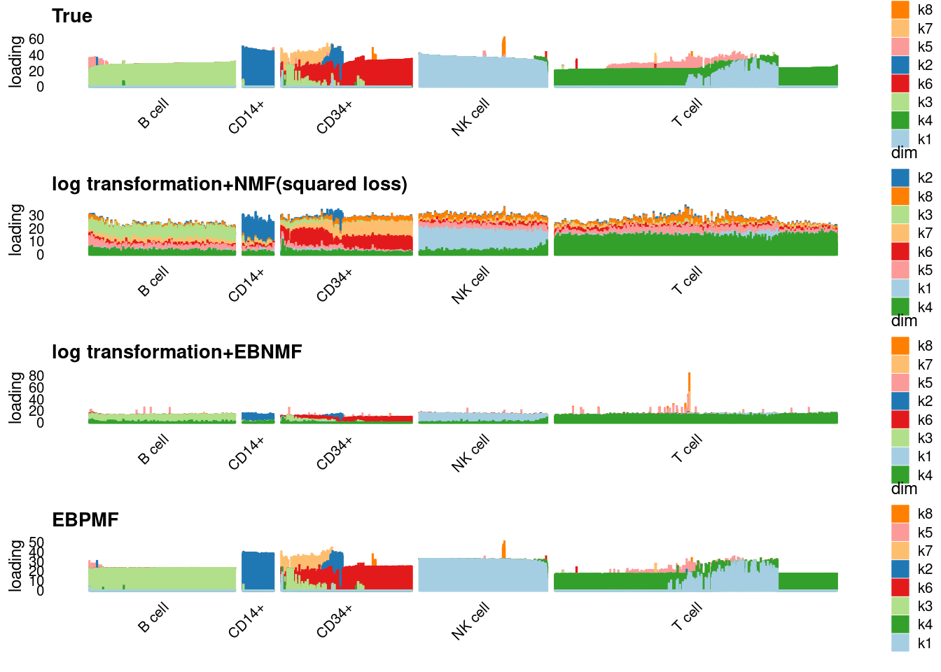 For visualization purpose, I set the number of K for ebnmf to be the true one - 10. Otherwise it will keep adding new factors till Kmax.(say 20)