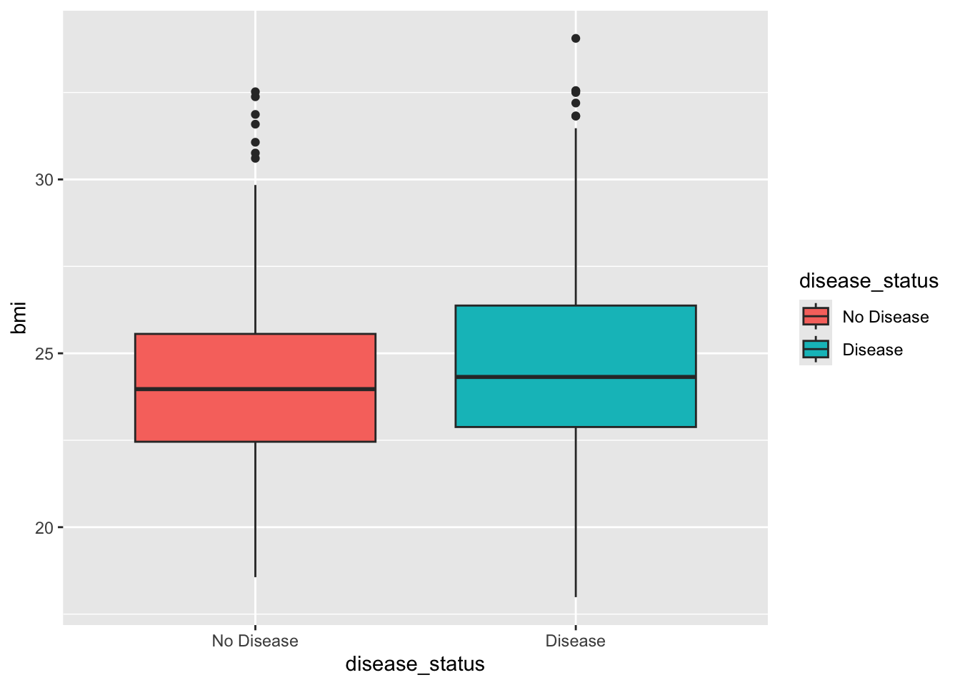 ggplot(box_plot_data, aes(x = disease_status, y = bmi, fill = disease_status)) + geom_boxplot() + theme_bw() + stat_compare_means(method = "t.test")