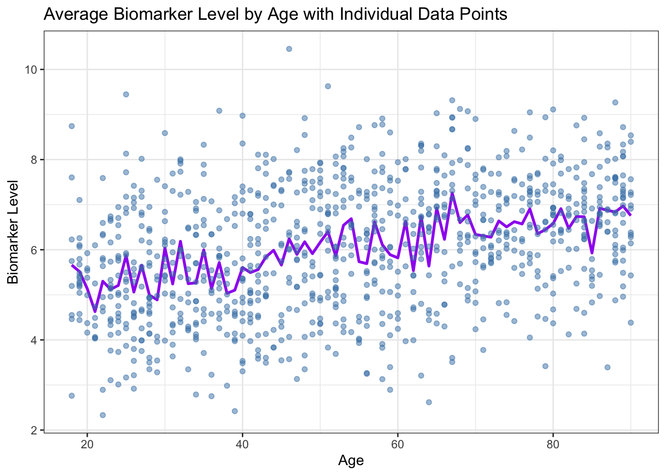 labs(title = "Average Biomarker Level by Age with Individual Data Points",