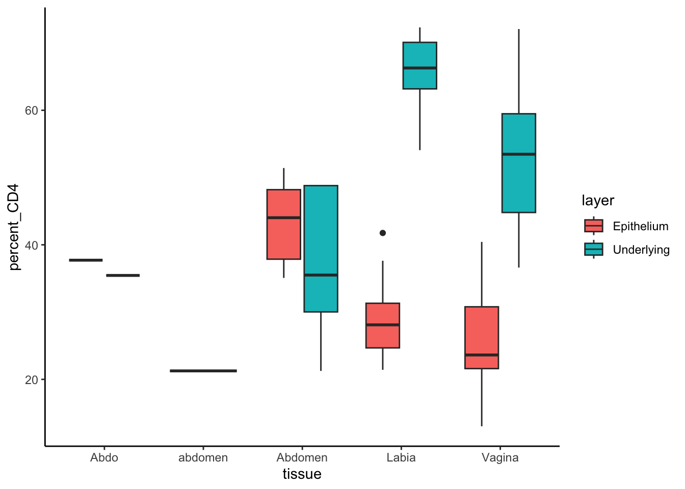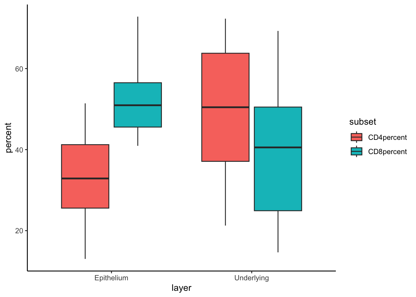 For example, if you want to compare the percentages of CD4 and CD8 cells on the same plot, you can pivot the data longer: