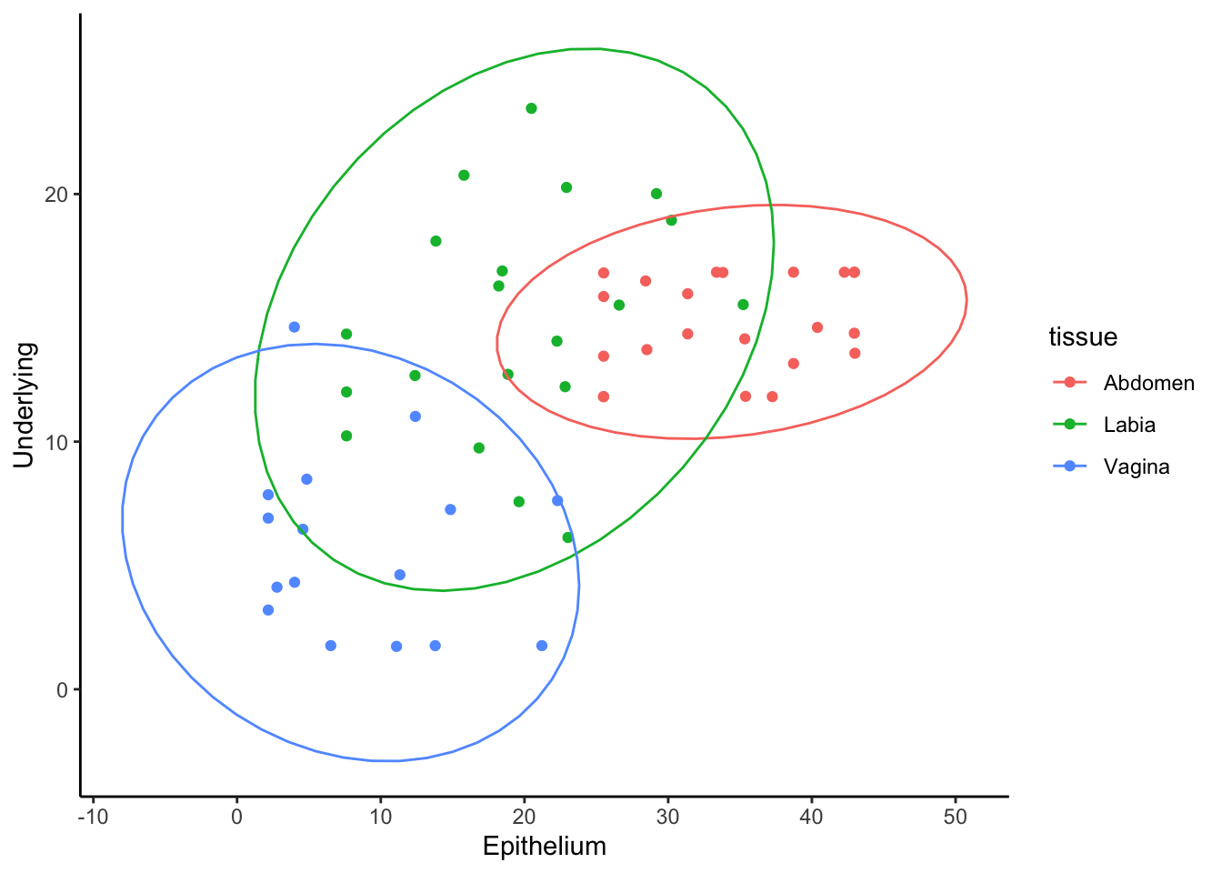 ggplot(aes(x=Epithelium, y=Underlying, color=tissue))+