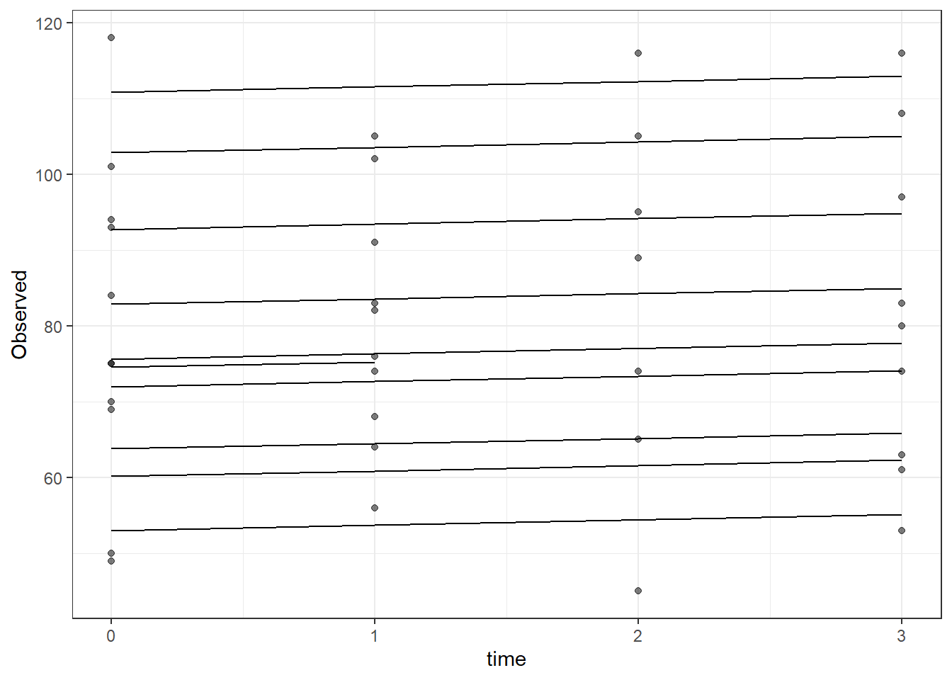 fit <- lmer(Observed ~ 1 + time + (1 + time || SubjectID),
