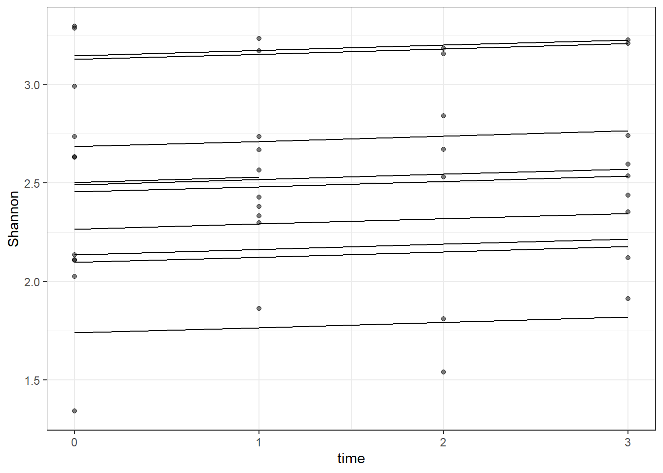 fit <- lmer(Shannon ~ 1 + time + (1 + time || SubjectID),