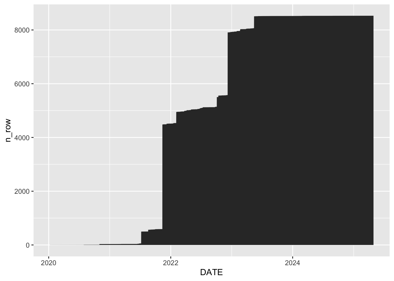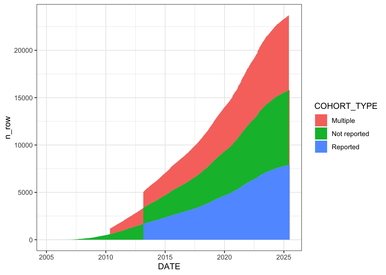 ggplot(aes(x =DATE, y=n_row, fill = MISSING_COHORT_INFO)) +