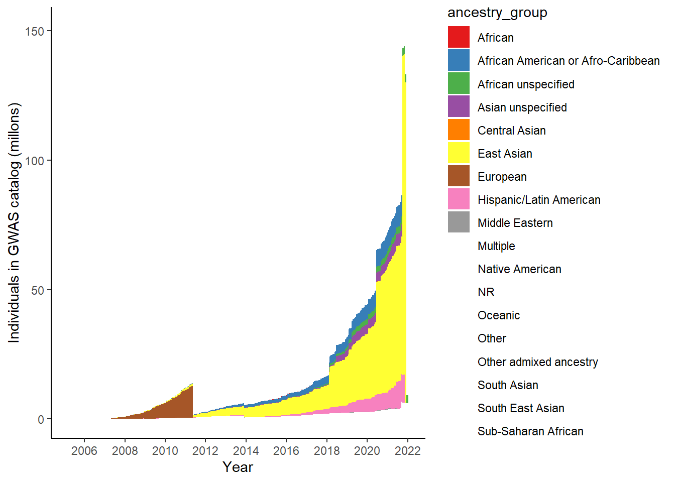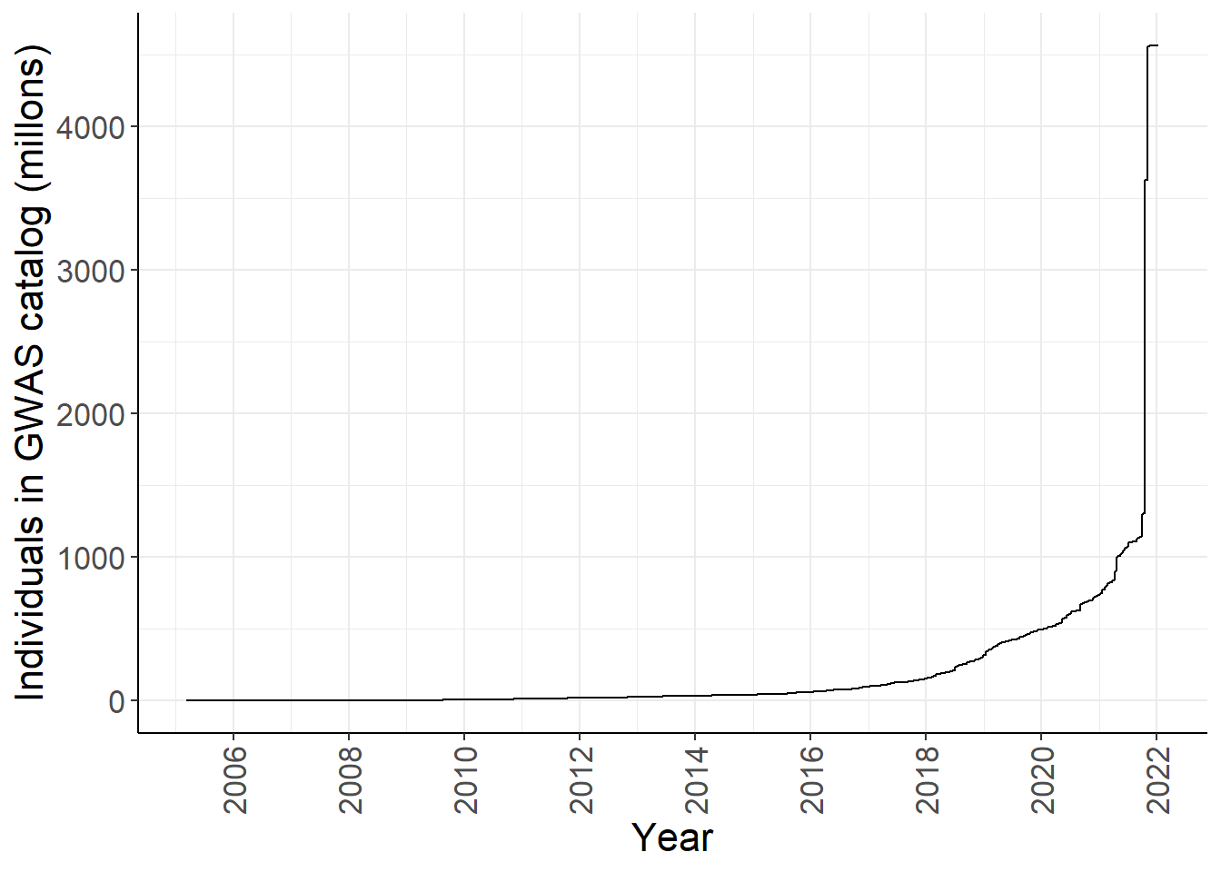 labs(x = "Year", y = "Individuals in GWAS catalog (millons)")
