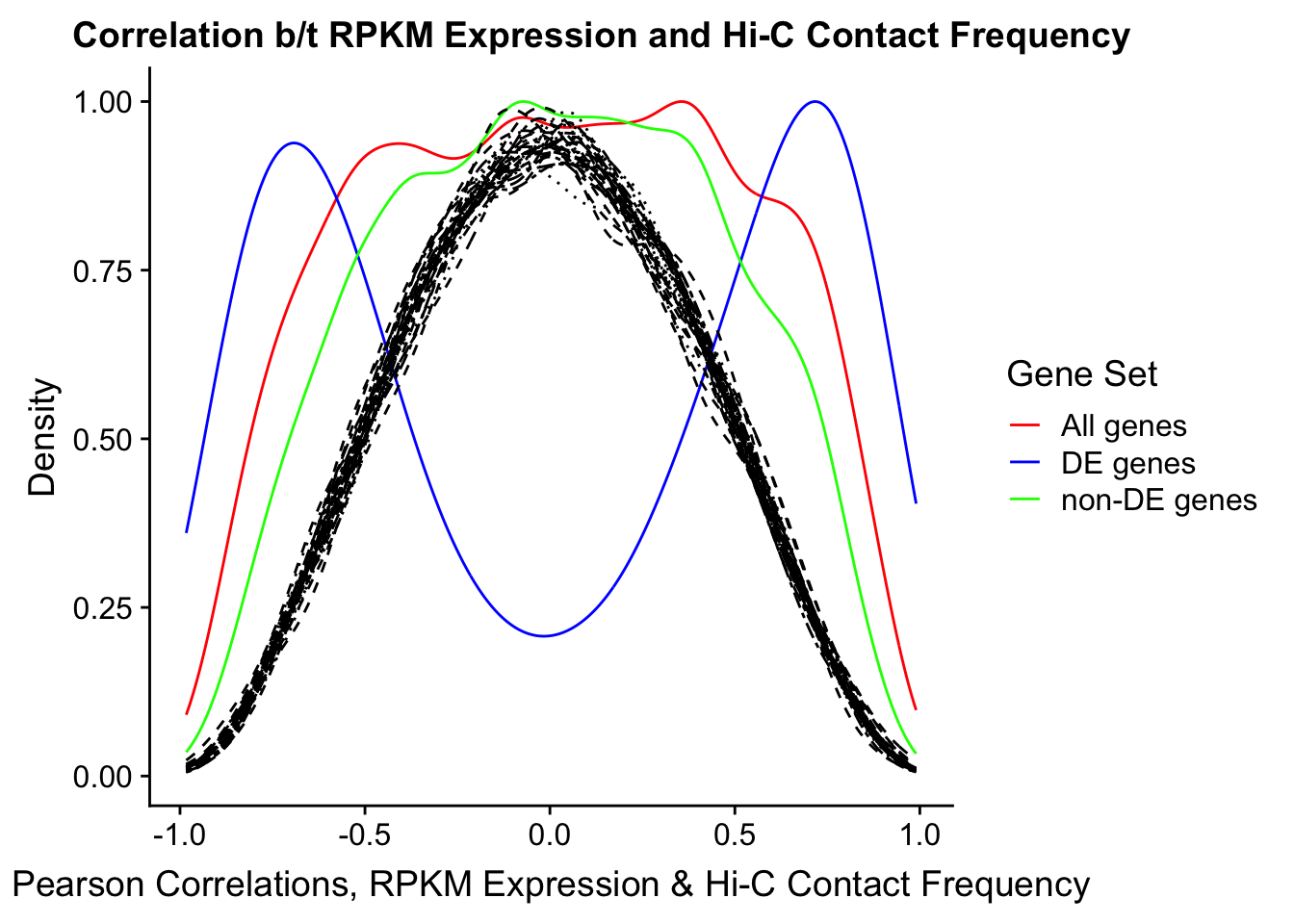 {r, include=FALSE, echo=FALSE} # #Simple plotting of logFC vs logFC. A positive logFC from the expression data indicates higher expression in humans. # #First, perform for entire set of genes, on non-DE and DE genes separately. # mydat <- select(gene.hic.filt, logFC, min_FDR_B.H, adj.P.Val, AveExpr) # ggplot(mydat) + geom_point(aes(x=logFC, y=min_FDR_B.H, color=adj.P.Val)) # ggplot(filter(mydat, adj.P.Val<=0.05)) + geom_point(aes(x=logFC, y=min_FDR_B.H)) + xlab("LogFC, Expression") + ylab("LogFC, Contact") + ggtitle("LogFC Expression vs. LogFC Contact for DE Genes") # ggplot(filter(mydat, adj.P.Val>0.05)) + geom_point(aes(x=logFC, y=min_FDR_B.H)) + xlab("LogFC, Expression") + ylab("LogFC, Contact") + ggtitle("LogFC Expression vs. LogFC Contact for non-DE Genes") # # #Now, take a look at what happens if I stratify things by which species it's more highly expressed in, and its DE status, and calculate R-squareds. Should do this with actual mean expression values per species # human.high.DE <- filter(mydat, logFC>0, adj.P.Val<=0.05) # human.high.nonDE <- filter(mydat, logFC>0, adj.P.Val>0.05) # chimp.high.DE <- filter(mydat, logFC<0, adj.P.Val<=0.05) # chimp.high.nonDE <- filter(mydat, logFC<0, adj.P.Val>0.05) # summary(lm(human.high.nonDE$logFC~human.high.nonDE$min_FDR_B.H))$adj.r.squared # summary(lm(human.high.DE$logFC~human.high.DE$min_FDR_B.H))$adj.r.squared # summary(lm(chimp.high.nonDE$logFC~chimp.high.nonDE$min_FDR_B.H))$adj.r.squared # summary(lm(chimp.high.DE$logFC~chimp.high.DE$min_FDR_B.H))$adj.r.squared # # # #Now, try out the suggested regression. # new.weighted.data <- weighted.data # new.weighted.data$E <- dge_final$lcpm_counts[,c(8, 6, 1, 4, 7, 5, 2, 3)] # # #Now, need to subset this down to the genes we have contact frequency for (from hmin table, created far below) # my.hmin <- select(hmin, genes, A_21792_HIC, B_28126_HIC, C_3649_HIC, D_40300_HIC, E_28815_HIC, F_28834_HIC, G_3624_HIC, H_3651_HIC) # deez.genes <- left_join(new.weighted.data$genes, my.hmin) # good.indices <- which(complete.cases(deez.genes)) # new.weighted.data <- new.weighted.data[good.indices,] # new.weighted.data$HiC <- deez.genes[good.indices, 3:10] # # meta.exp.data <- data.frame("SP"=c("C", "C", "C", "C", "H", "H", "H", "H"), "SX"=c("M","M" ,"F","F","F", "M","M","F")) # SP <- factor(meta.exp.data$SP,levels = c("H","C")) # # # for(row in 1:nrow(new.weighted.data$E)){ # lmFit() # } # exp.design <- model.matrix(~0+SP+new.weighted.data$HiC+SP:new.weighted.data$HiC)#(~1+meta.exp.data$SP+meta.exp.data$SX) But where does freq come from? # colnames(exp.design) <- c("Human", "Chimp") # weighted.data <- voom(new.weighted.data, exp.design, plot=TRUE, normalize.method = "cyclicloess") # # ##Obtain rest of LM results, with particular eye to DE table! # vfit <- lmFit(weighted.data, exp.design) # efit <- eBayes(vfit) # # mycon <- makeContrasts(HvC = Human-Chimp, levels = exp.design) # diff_species <- contrasts.fit(efit, mycon) # finalfit <- eBayes(diff_species) # detable <- topTable(finalfit, coef = 1, adjust.method = "BH", number = Inf, sort.by="none") #
