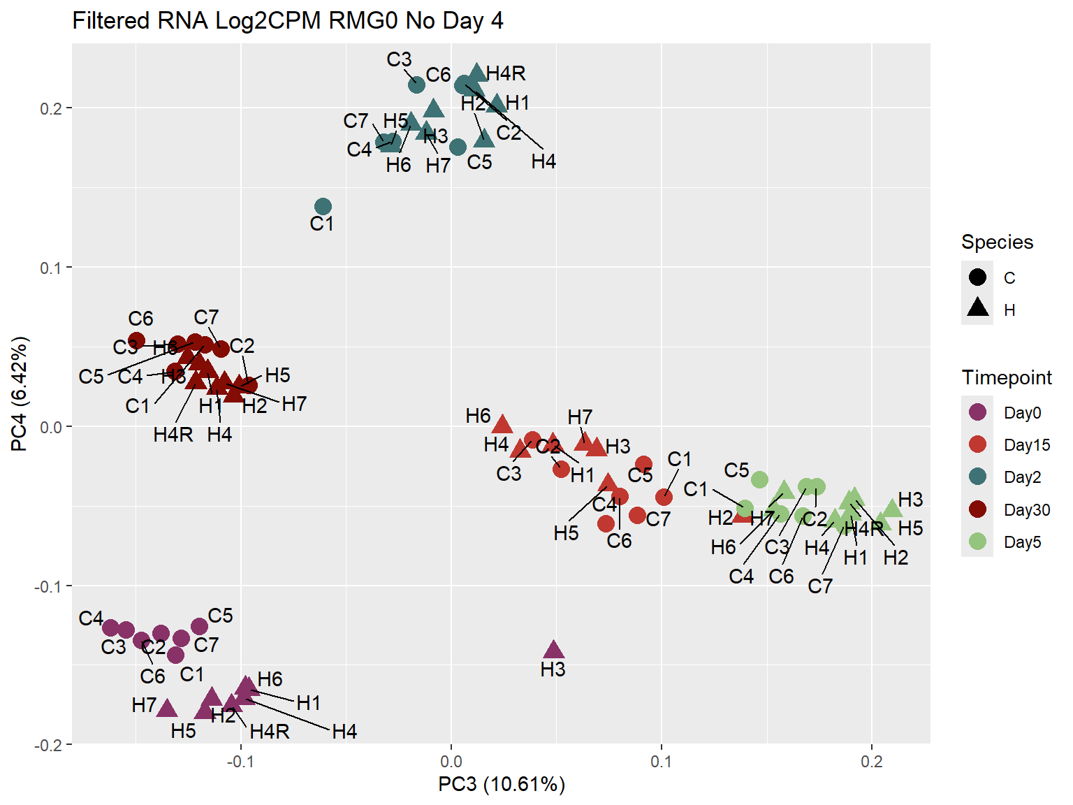 ggtitle("Filtered RNA Log2CPM RMG0 No Day 4")