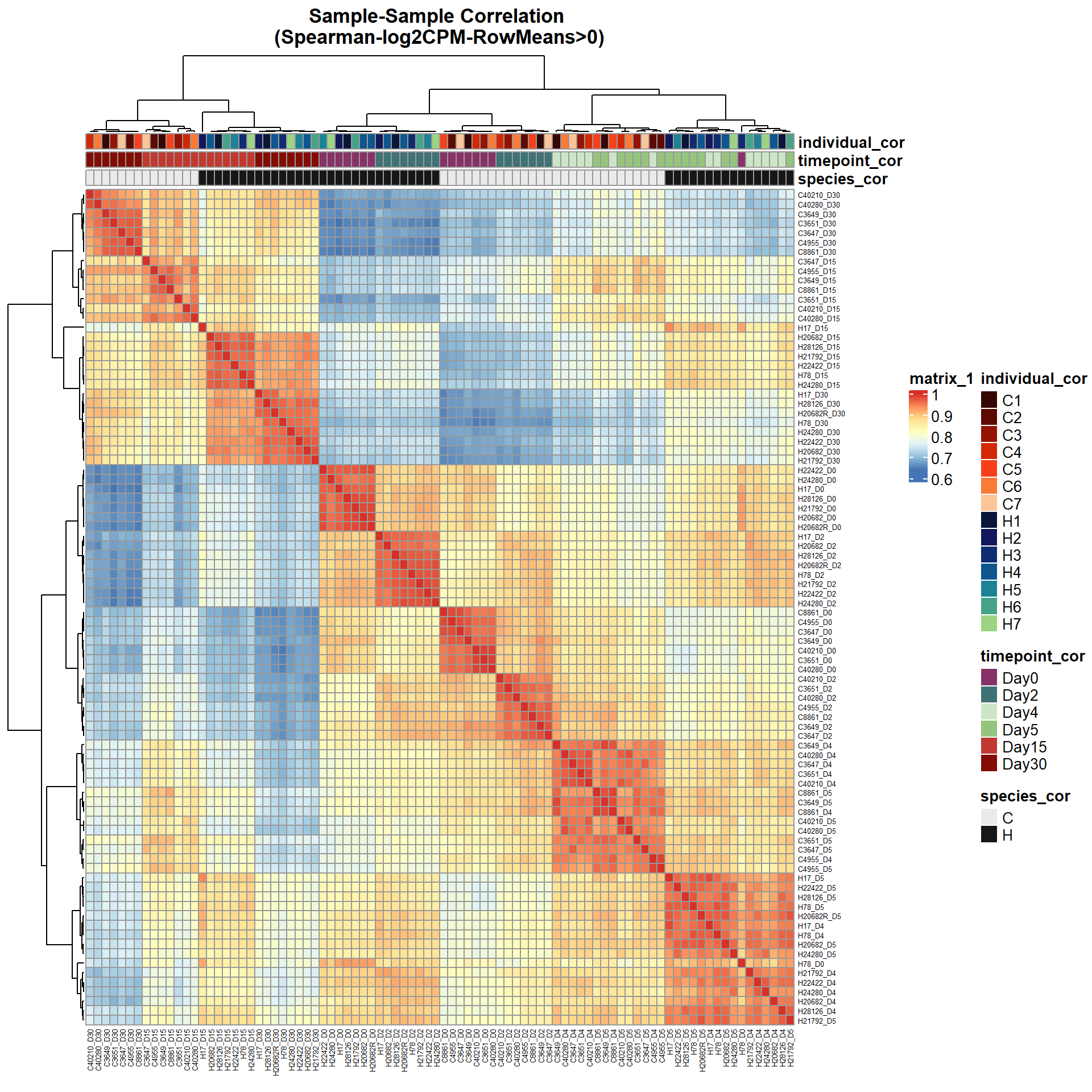 main = "Sample-Sample Correlation (Spearman) \n (log2CPM-RowMeans>0-NoDay4)")