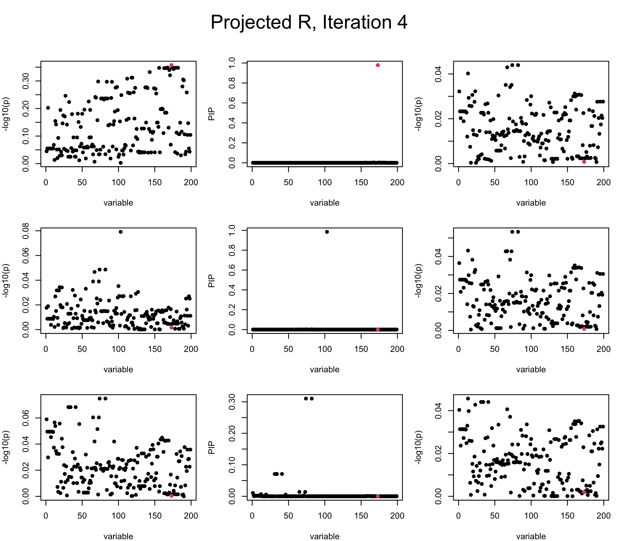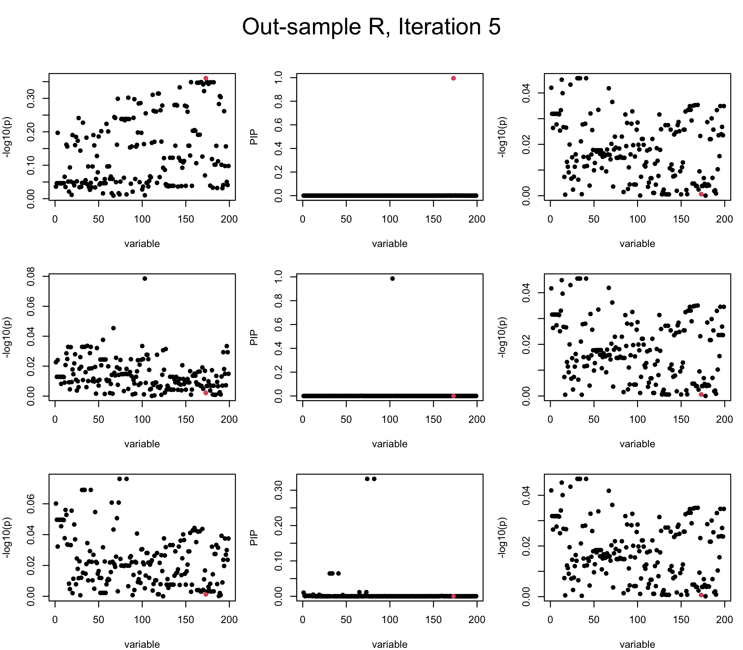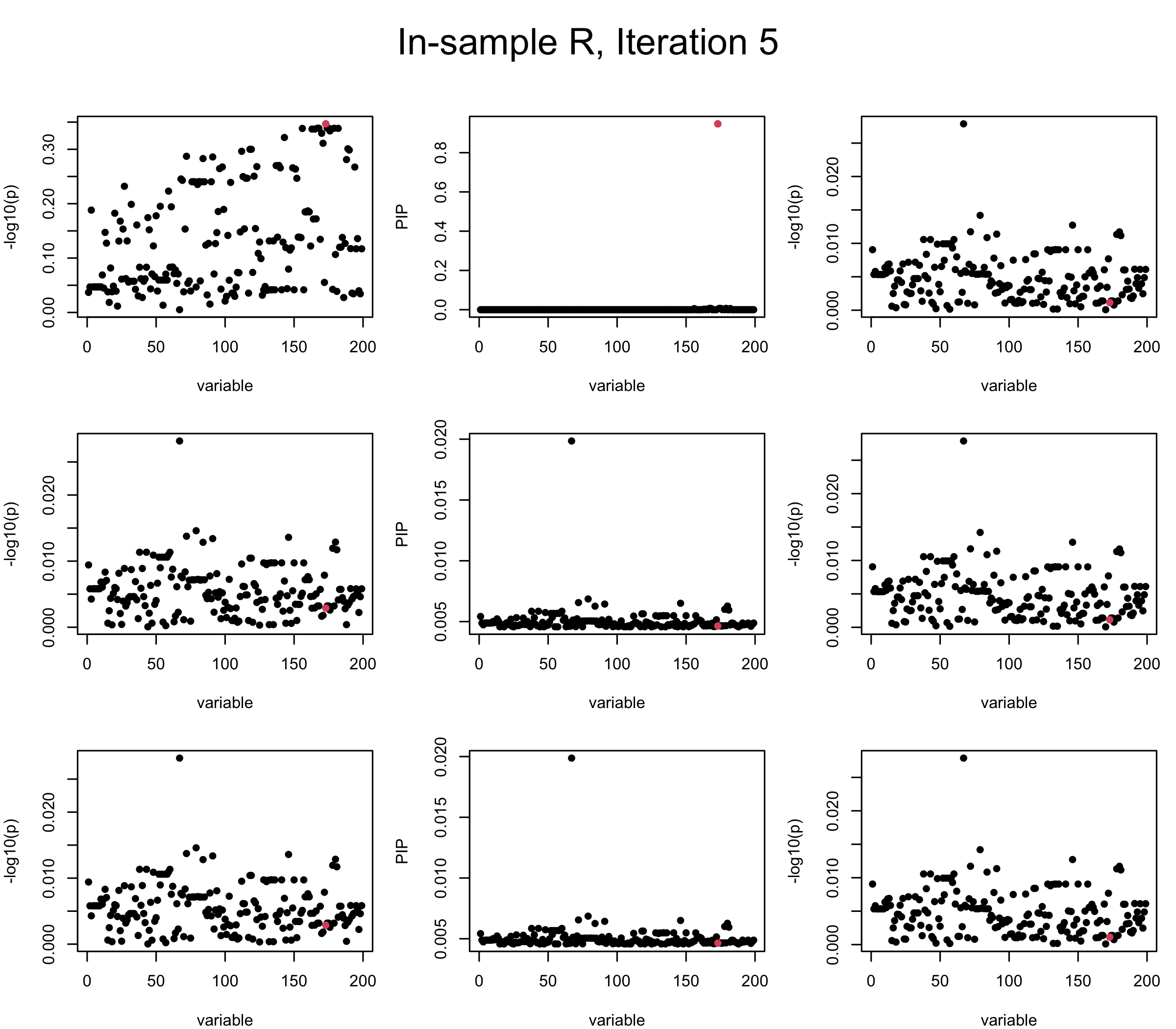 Note that the title of the figure corresponds to SuSiE’s outer loop. Each figure has 3 rows correspond to the inner loop from 1 to \(L = 3\). The algorithm often converges after around 5 iteration (outer loop) so we only look at the first 5.