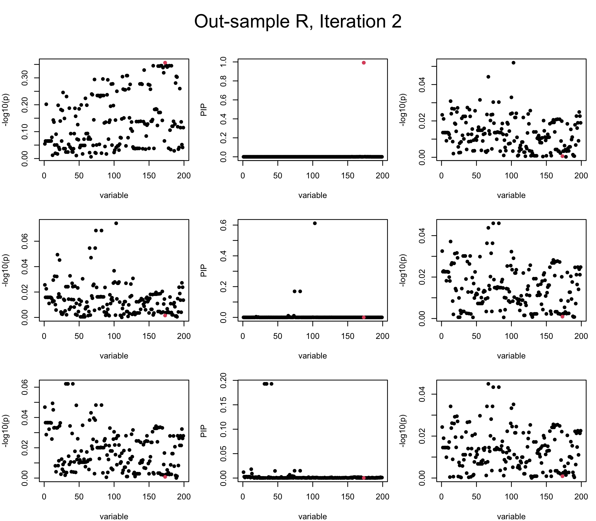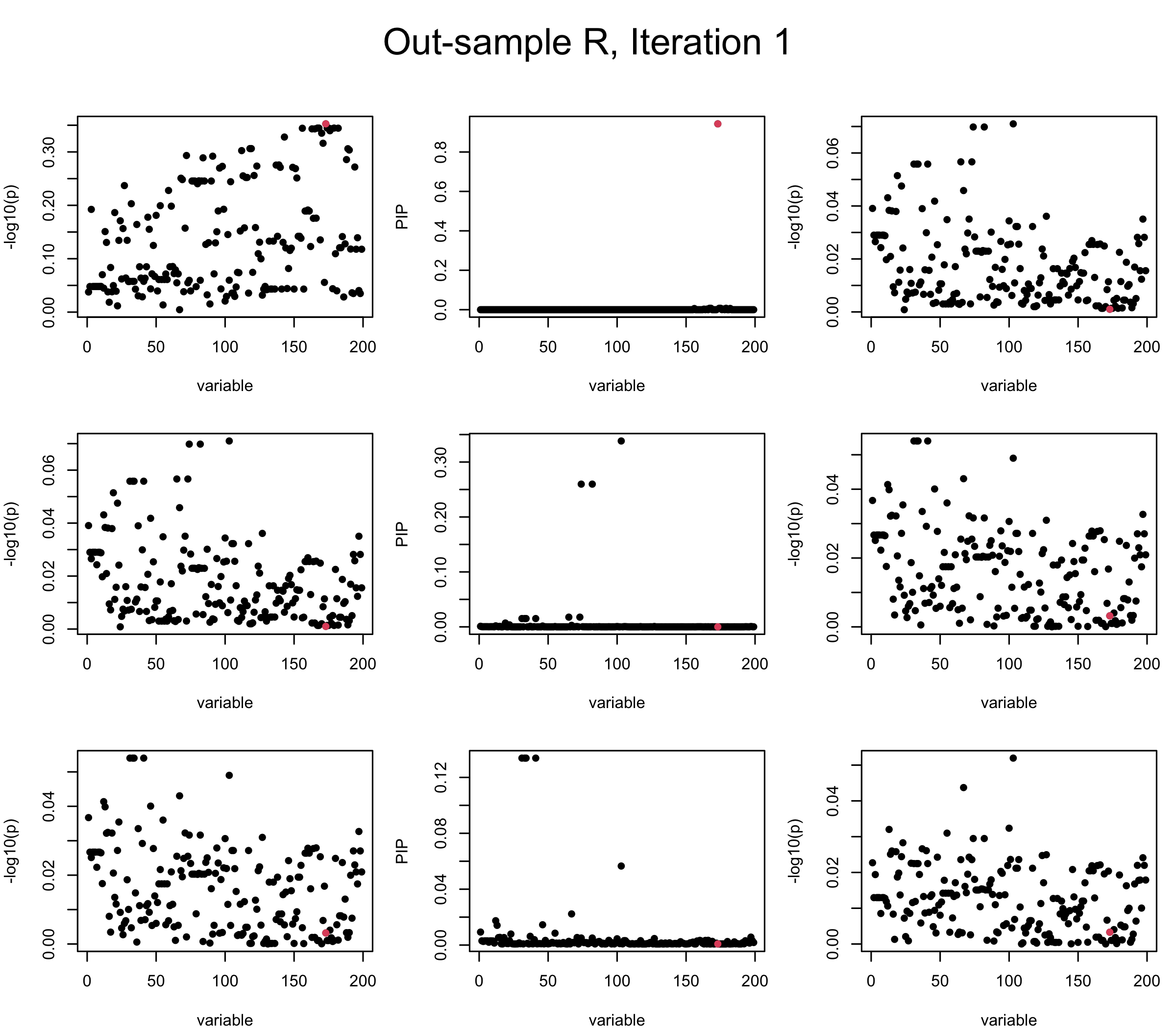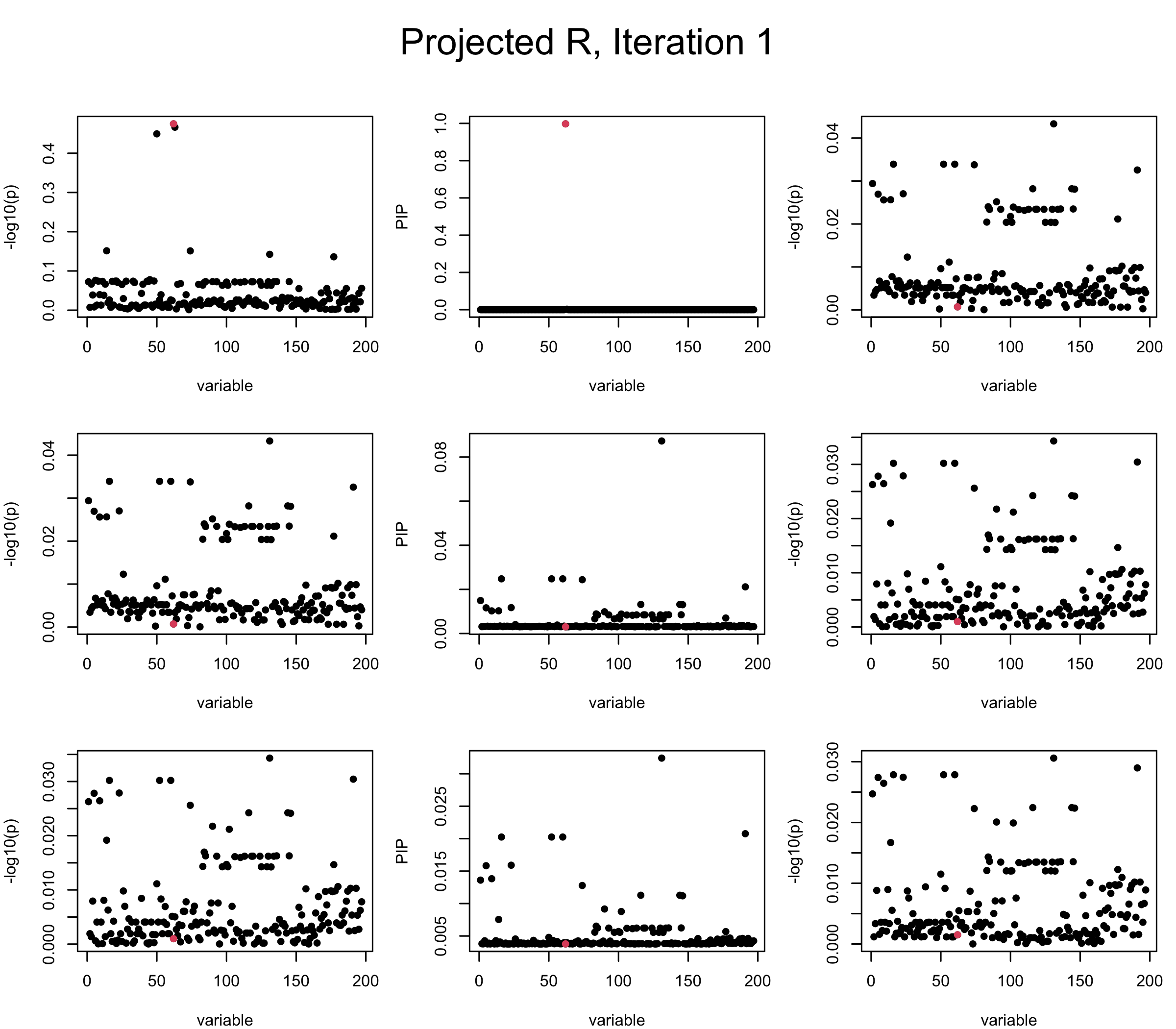 Note that the title of the figure corresponds to SuSiE’s outer loop. Each figure has 3 rows correspond to the inner loop from 1 to \(L = 3\). The algorithm often converges after around 5 iteration (outer loop) so we only look at the first 5.