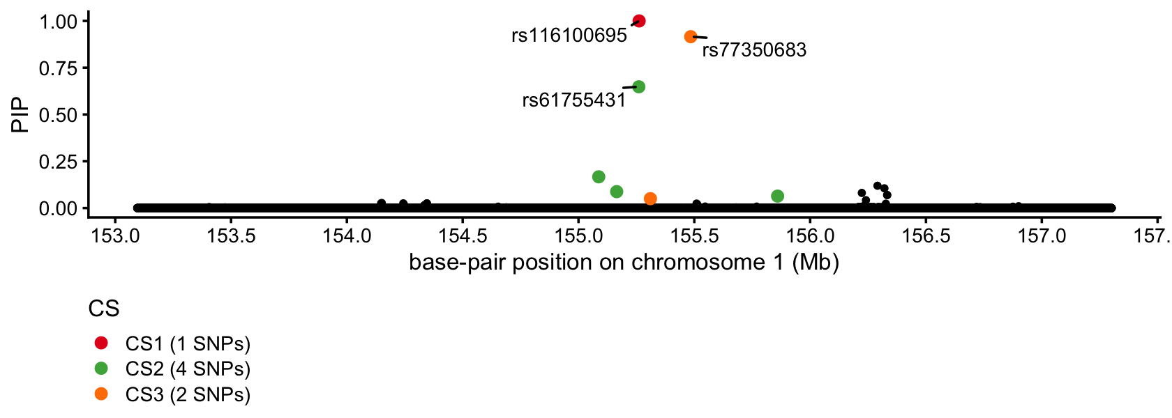 This PIP plot summarizes the results of the fine-mapping analysis: