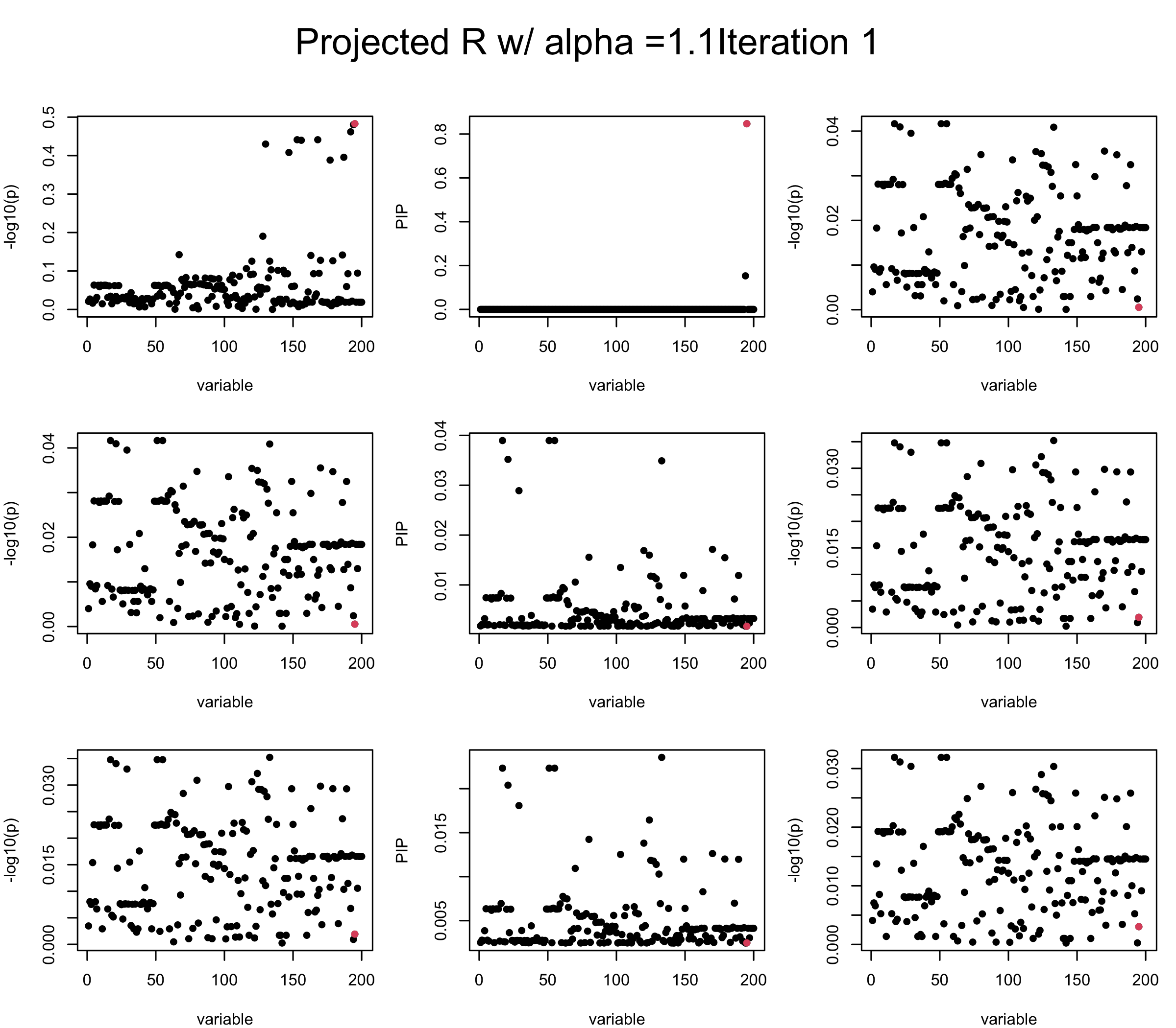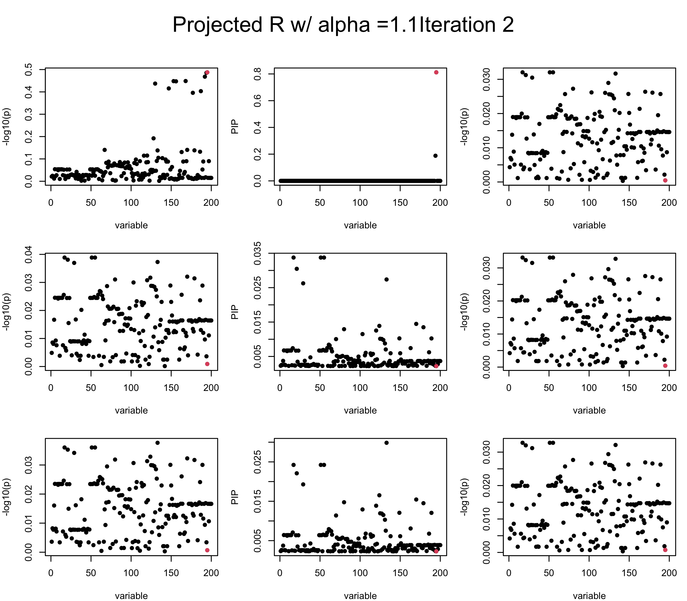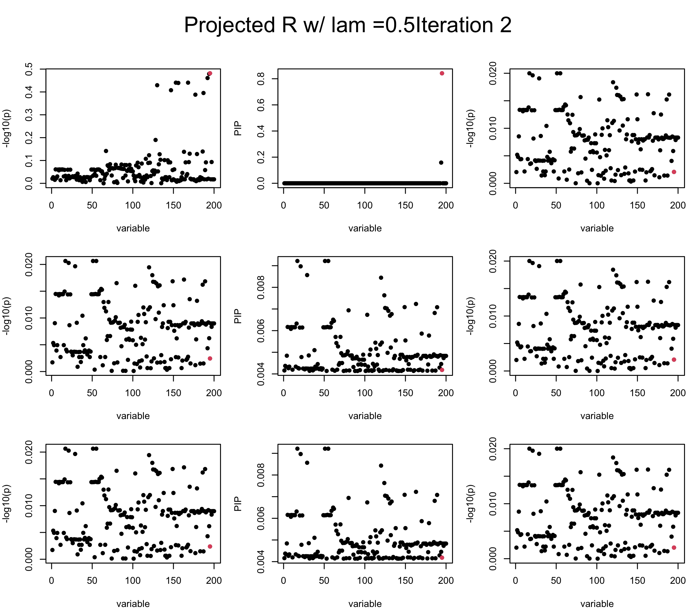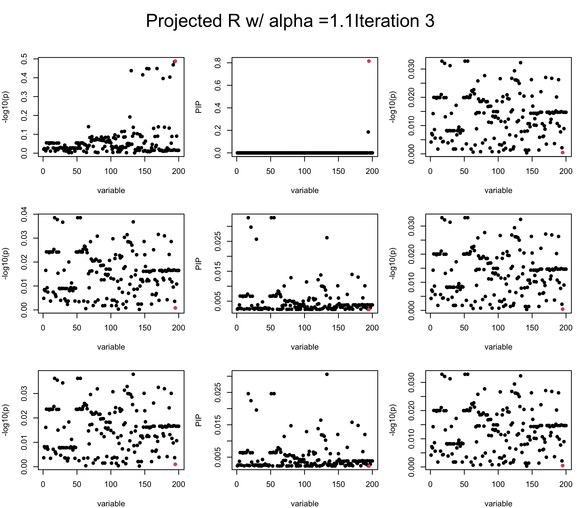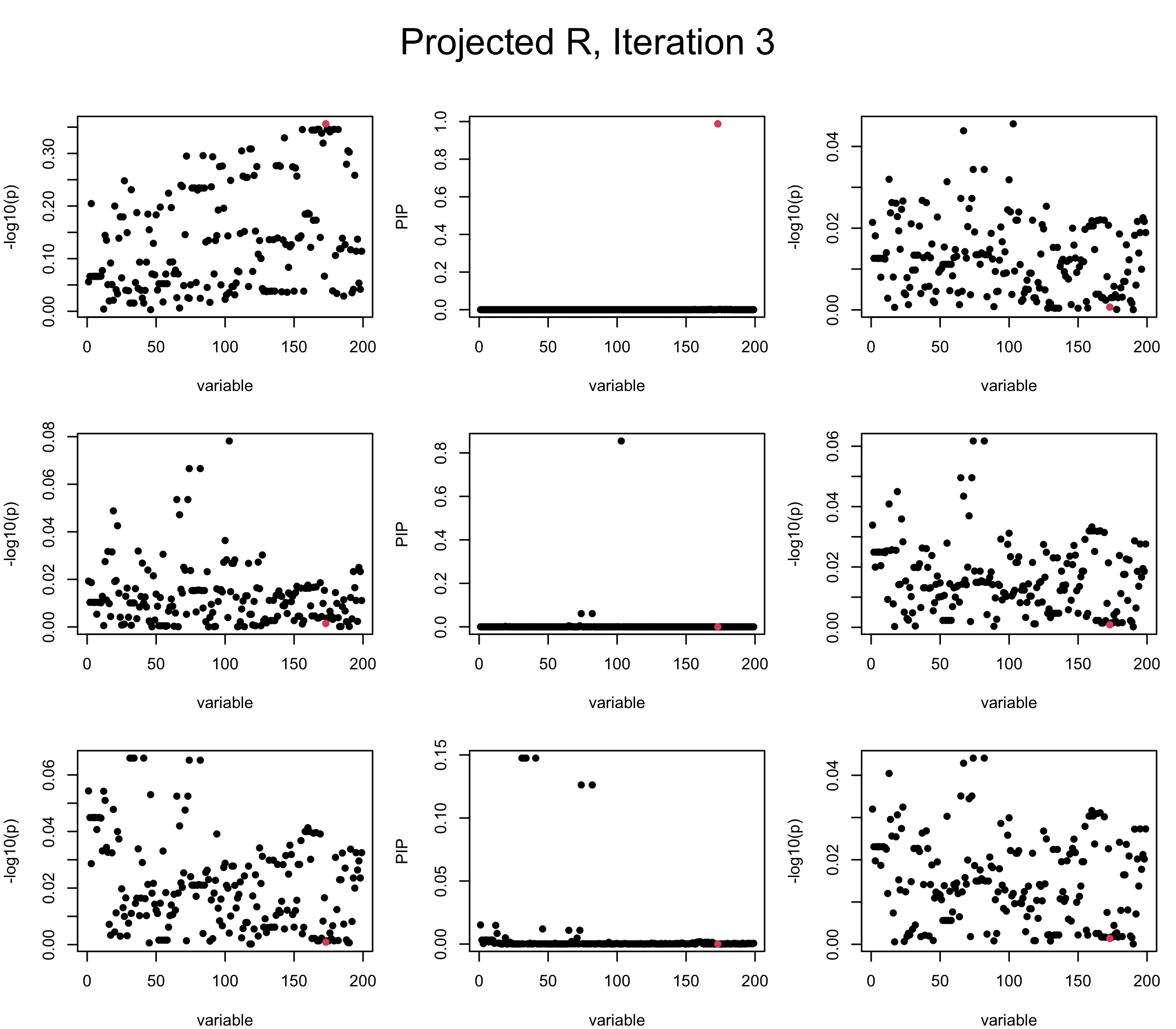 Note that the title of the figure corresponds to SuSiE’s outer loop. Each figure has 3 rows correspond to the inner loop from 1 to \(L = 3\). The algorithm often converges after around 5 iteration (outer loop) so we only look at the first 5.